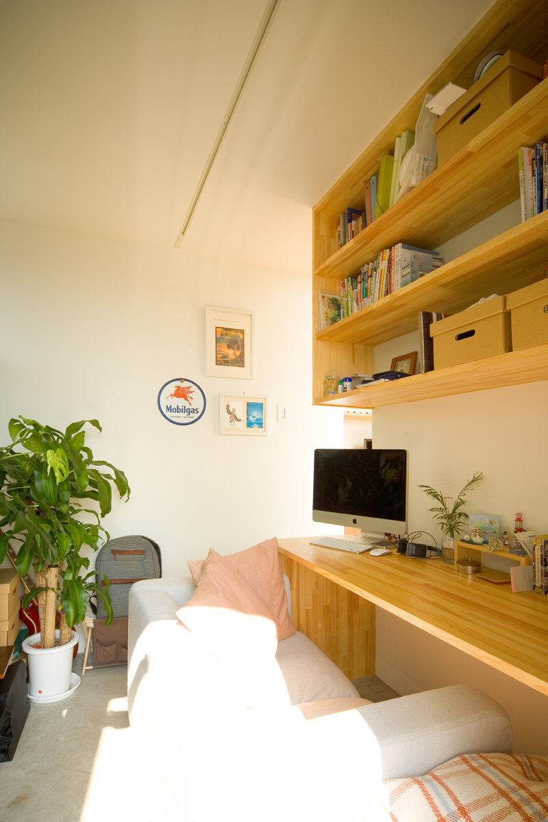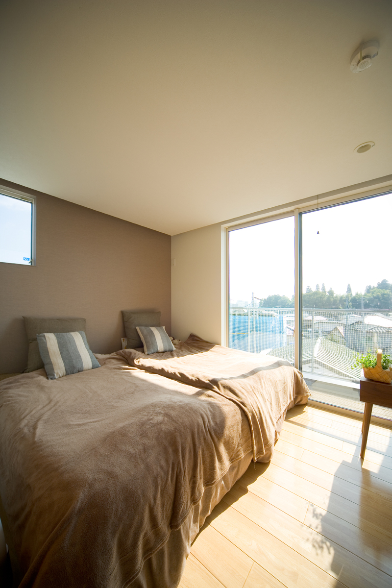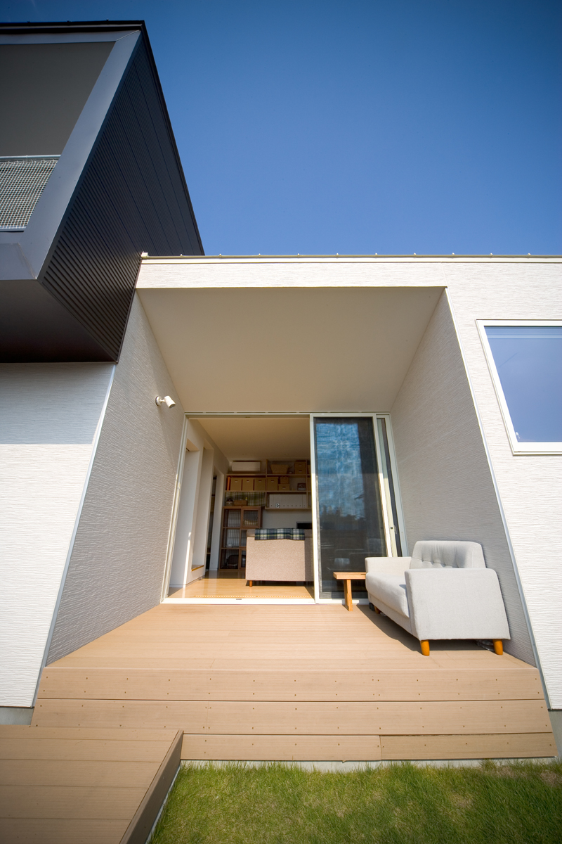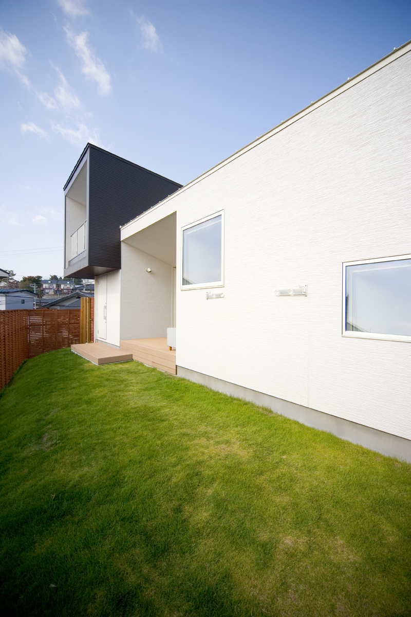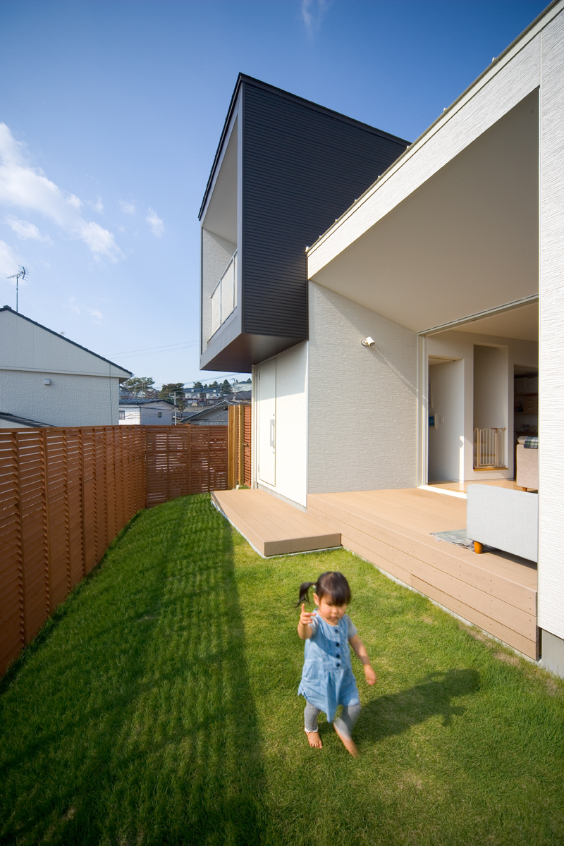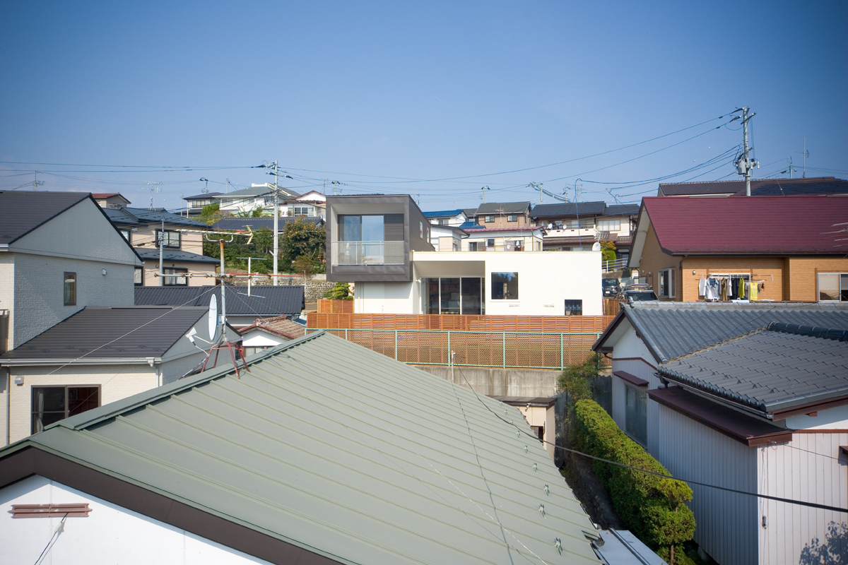 オーナーからの要望は、まずリビング、ダイニング、キッチン、寝室を南に面すること。ご主人の書斎は庭から直接行き来できること。そしてご主人のお母様の部屋は東側に設けることでした。敷地の地盤を調査したところ、西側擁壁から約1.5m、南側擁壁から1.5mが敷地造成時の軟弱な盛り土でありそれ以外が強固な地盤であることが分かりました。しかし、要求されているスペースを敷地にレイアウトしていくと、ご夫婦の寝室が軟弱な盛り土部分を覆ってしまいます。そこで、ご夫婦の寝室を2.6m持ち上げ、オーバーハングさせることにより、強固な地盤にのみ建物を計画し、駐車場から玄関にいたるさしかけ空間を確保しました。重力から開放されたような宙に浮いた寝室は、この敷地の軟弱地盤という負の要素をポジティヴに捉えた形態であり、下部のさしかけ空間とどこまでもつづく仙台平野を望む最高の景色を獲得しました。それぞれの空間は決して大きくありませんが、南側の風景を積極的に内部空間に取り込むことにより、実際の広さ以上の広さを実現しました。