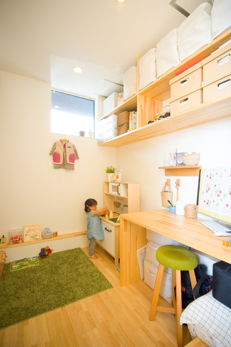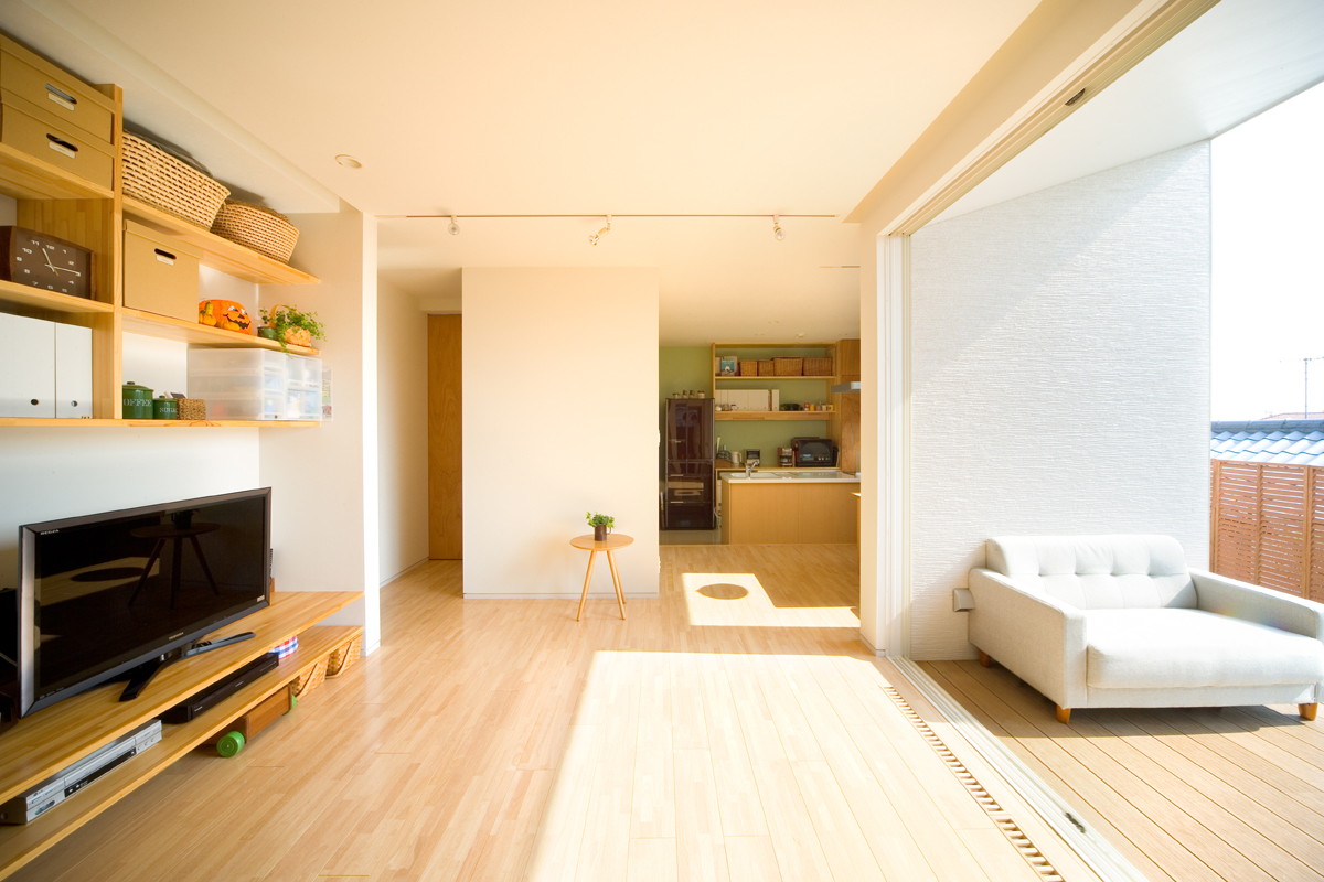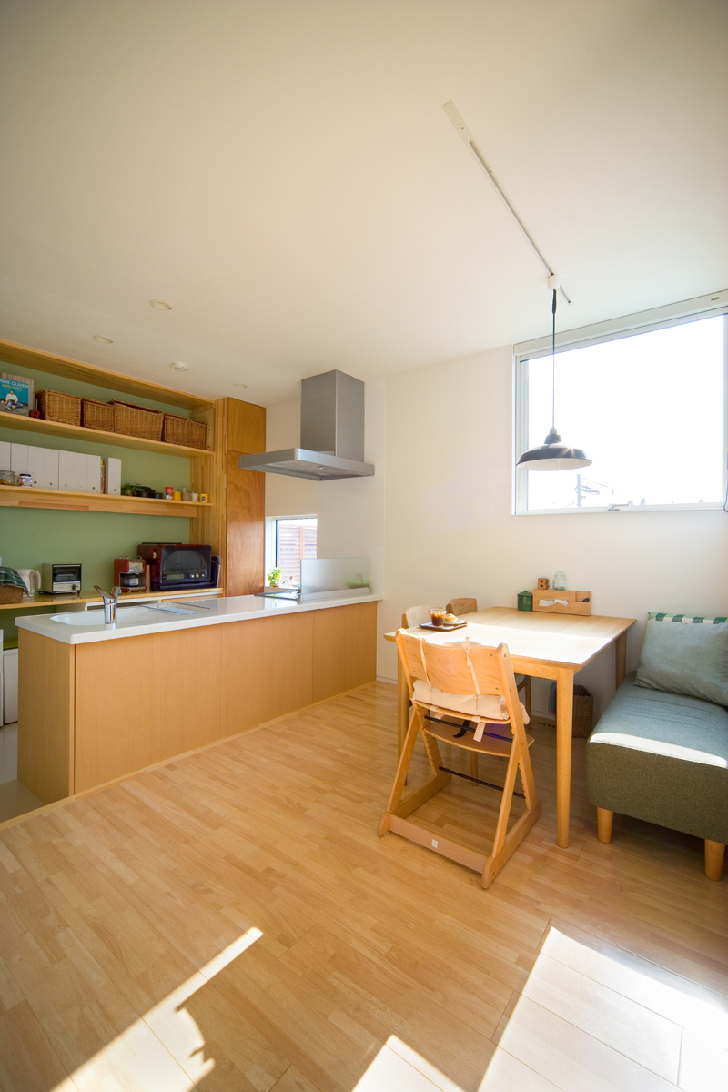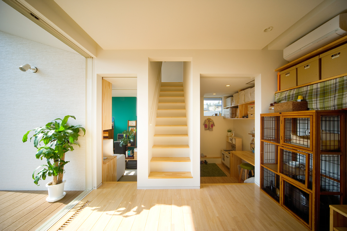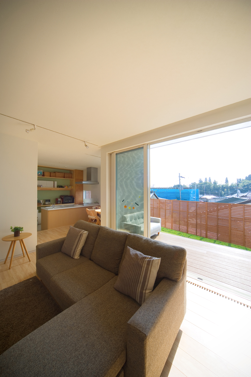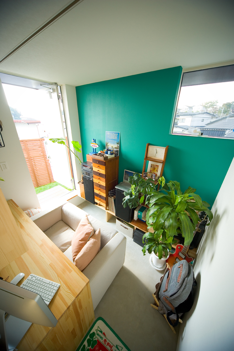オーナーからの要望は、まずリビング、ダイニング、キッチン、寝室を南に面すること。ご主人の書斎は庭から直接行き来できること。そしてご主人のお母様の部屋は東側に設けることでした。敷地の地盤を調査したところ、西側擁壁から約1.5m、南側擁壁から1.5mが敷地造成時の軟弱な盛り土でありそれ以外が強固な地盤であることが分かりました。しかし、要求されているスペースを敷地にレイアウトしていくと、ご夫婦の寝室が軟弱な盛り土部分を覆ってしまいます。そこで、ご夫婦の寝室を2.6m持ち上げ、オーバーハングさせることにより、強固な地盤にのみ建物を計画し、駐車場から玄関にいたるさしかけ空間を確保しました。重力から開放されたような宙に浮いた寝室は、この敷地の軟弱地盤という負の要素をポジティヴに捉えた形態であり、下部のさしかけ空間とどこまでもつづく仙台平野を望む最高の景色を獲得しました。それぞれの空間は決して大きくありませんが、南側の風景を積極的に内部空間に取り込むことにより、実際の広さ以上の広さを実現しました。