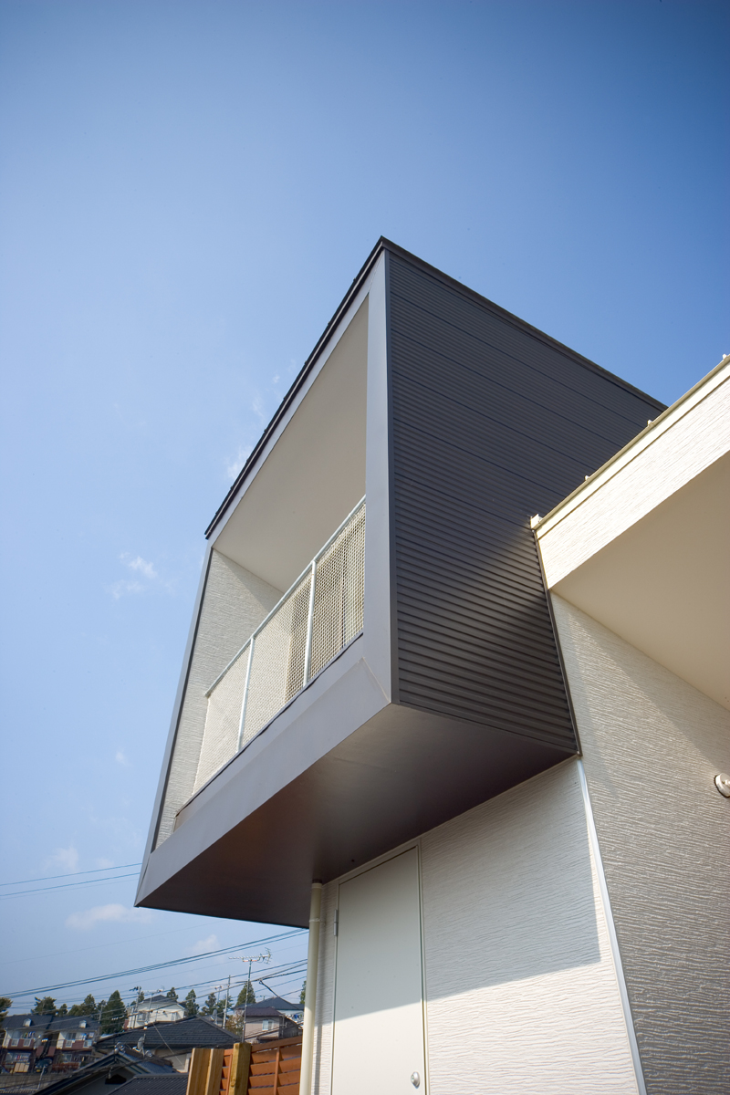 仙台市郊外の小高い丘に立つ「2世帯住宅」です。小高い丘の先端に位置する敷地からはどこまでも遮蔽物の無い景色が広がっています。