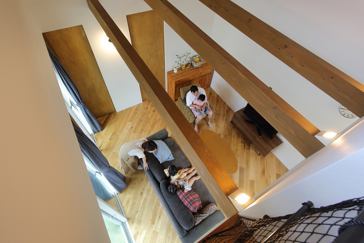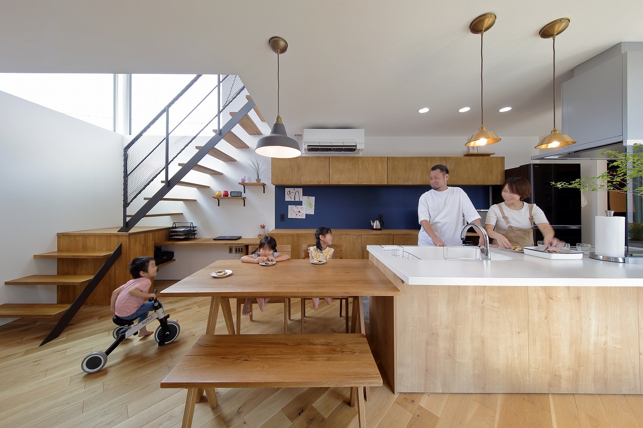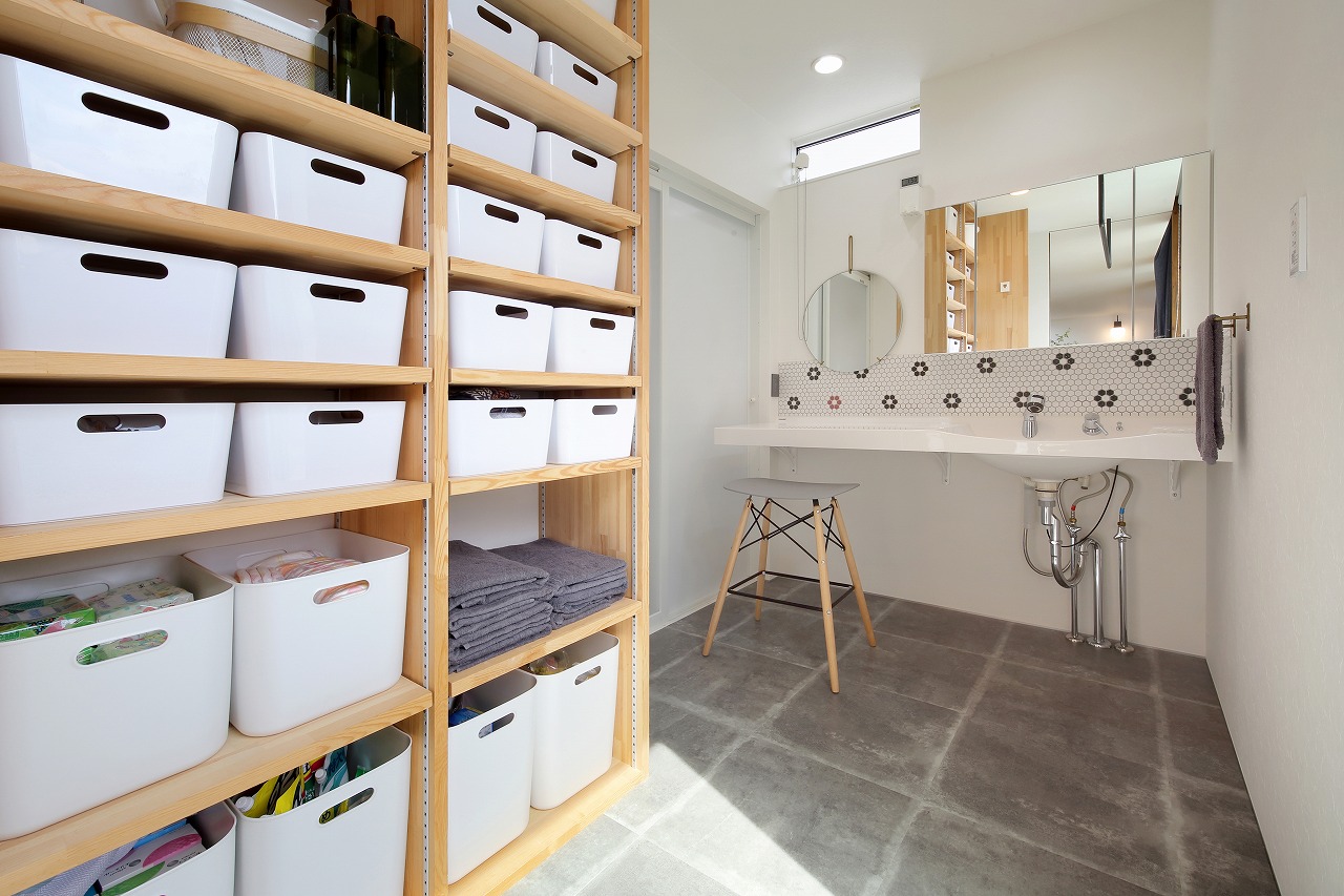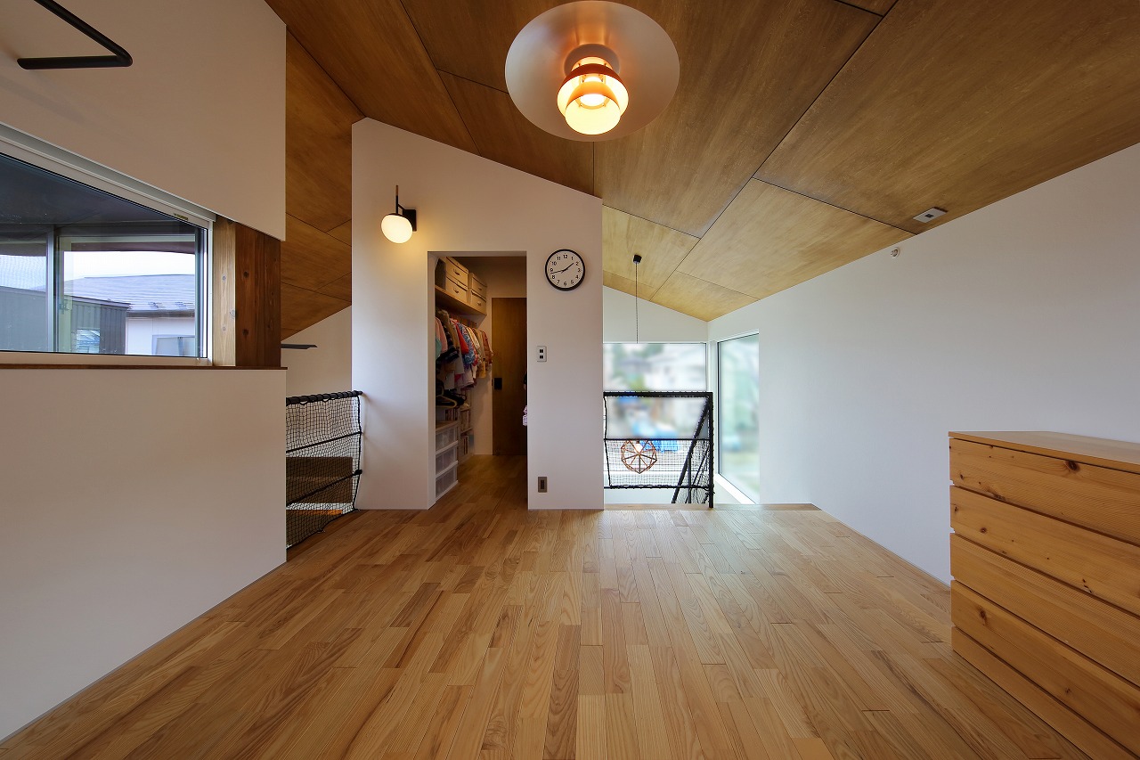 一番環境がいい場所にL字にLDKを配置しました。ワンルームのLDKは見通しもよく、外とのつながりも感じられます。斜めに施工したフローリングも真南との軸線を強調するとともに、アクセントとして寄与しています。当初、寝室は予算的にも2階に配置することが望ましかったのですが、将来平屋での生活も可能なように1階に計画しました。キッチン周辺には家事動線を考慮したパントリーや水廻りを配置し、日当たりのよい洗面では室内物干しスペースも完備しています。