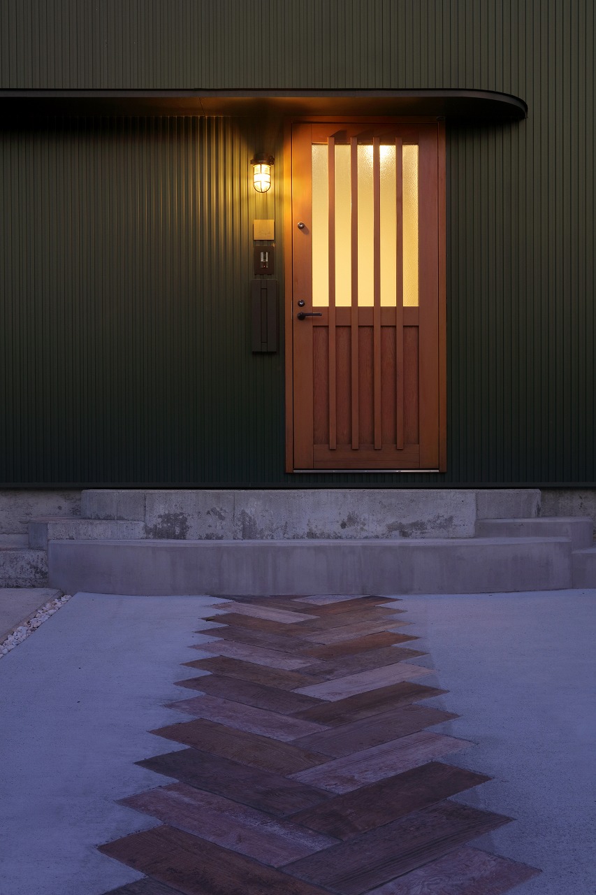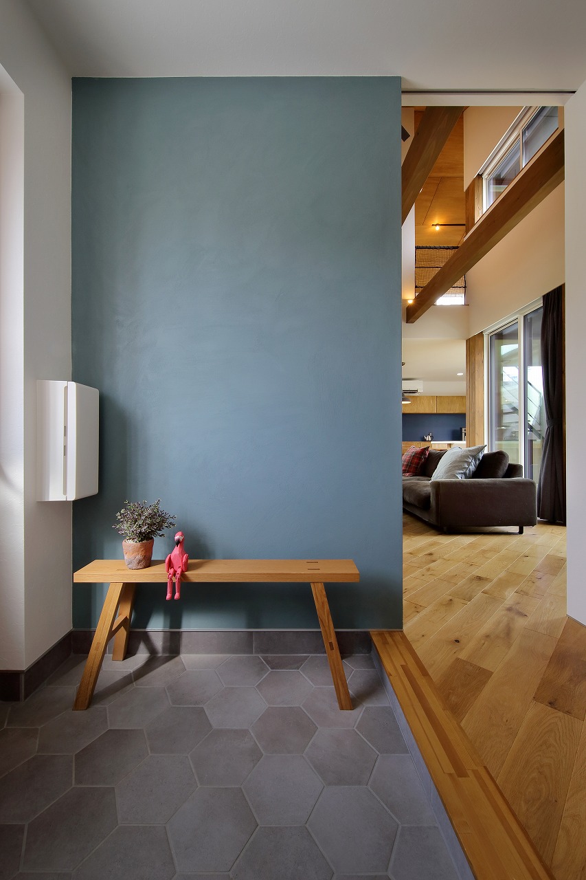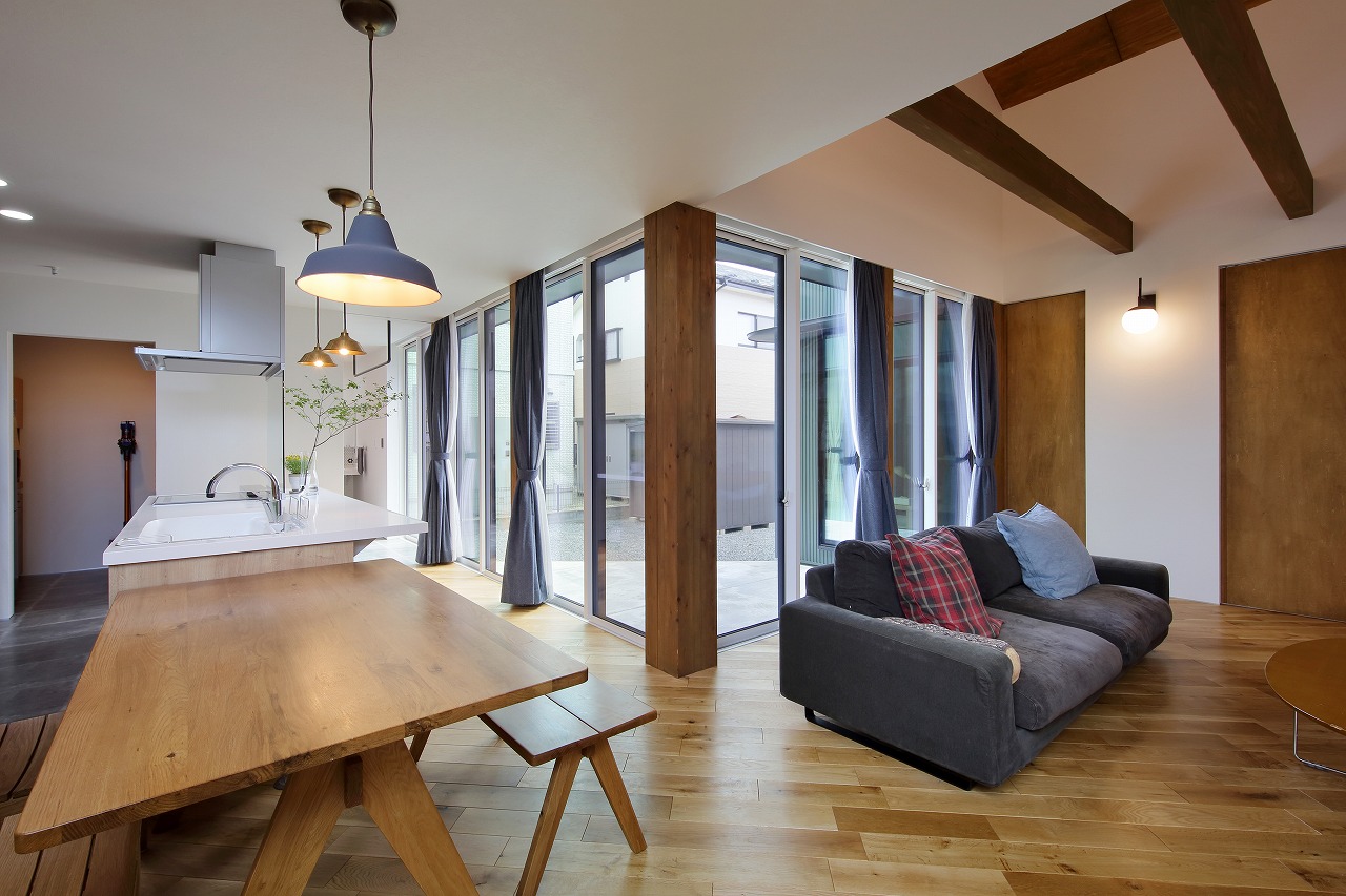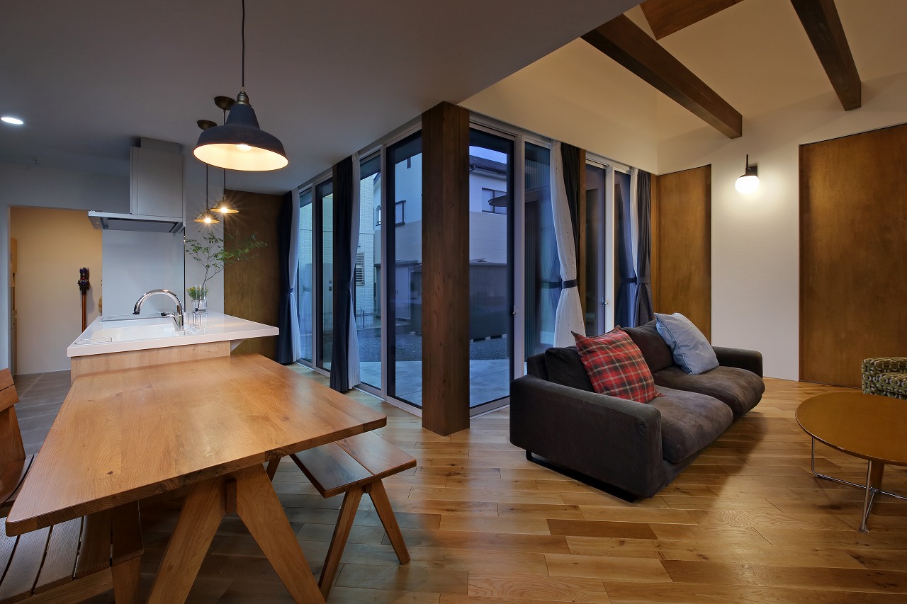 一番環境がいい場所にL字にLDKを配置しました。ワンルームのLDKは見通しもよく、外とのつながりも感じられます。斜めに施工したフローリングも真南との軸線を強調するとともに、アクセントとして寄与しています。当初、寝室は予算的にも2階に配置することが望ましかったのですが、将来平屋での生活も可能なように1階に計画しました。キッチン周辺には家事動線を考慮したパントリーや水廻りを配置し、日当たりのよい洗面では室内物干しスペースも完備しています。