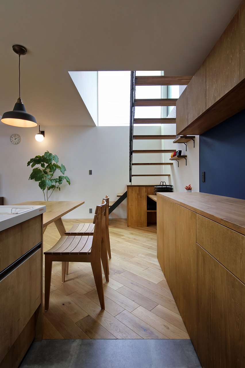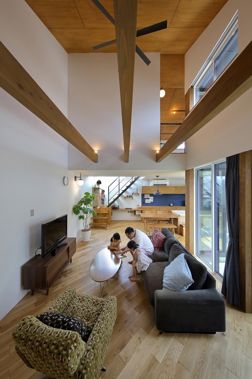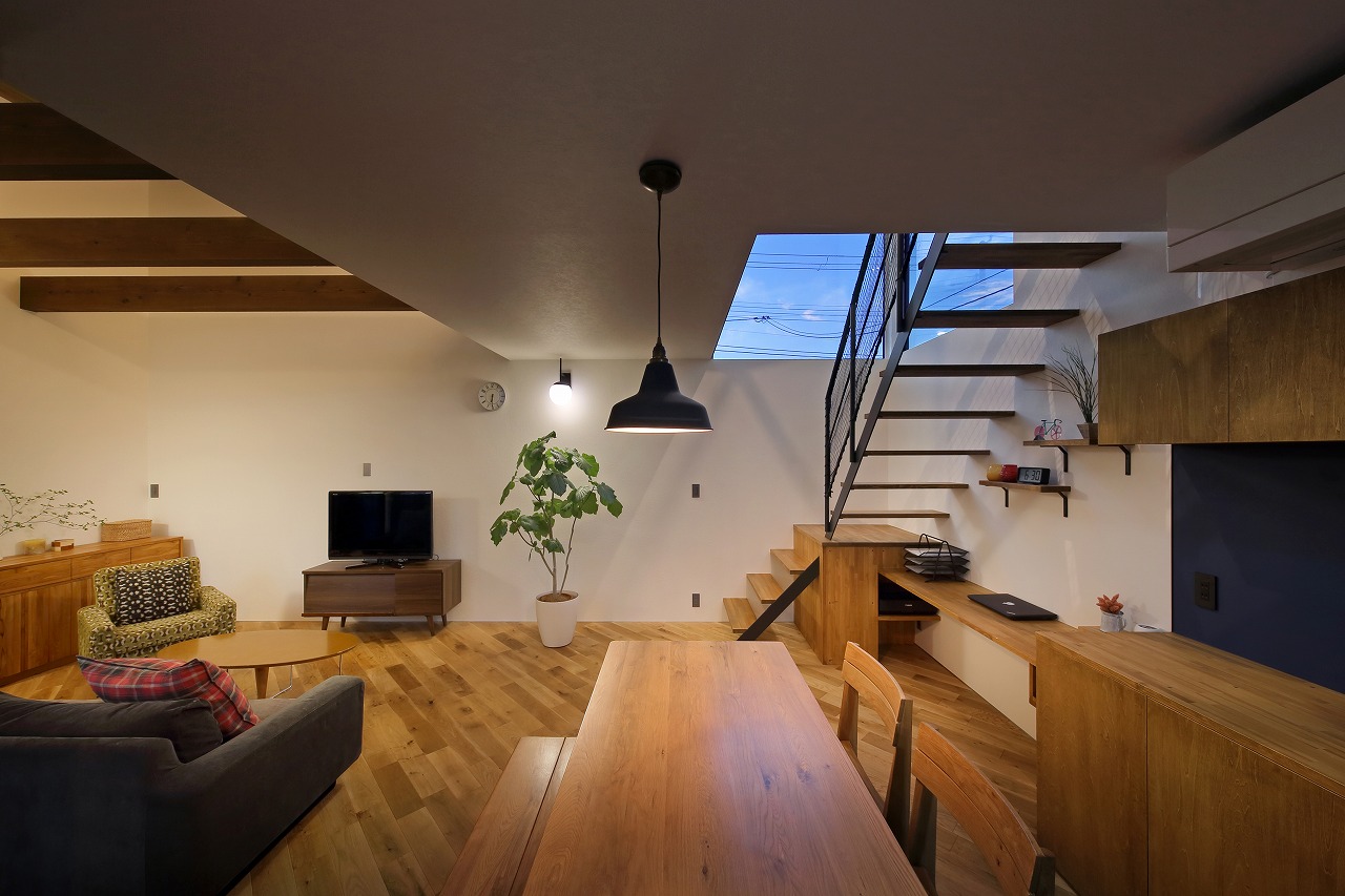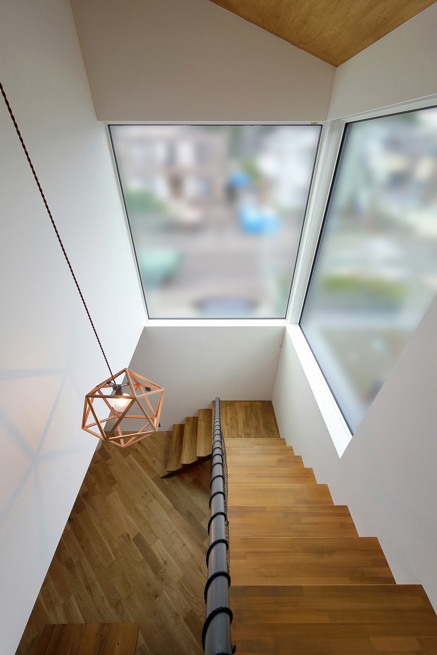 街並みの抜けを意識したリビングアクセスの階段は安定した北側採光を室内に注ぐ意味でも効果的です。2階のプライベートルームはワンルームとし、将来の間仕切りによって個室化される予定です。リビング上部の吹き抜けからは採光を得ることはもちろん、2階とのつながりや開放感をもたらしてくれます。