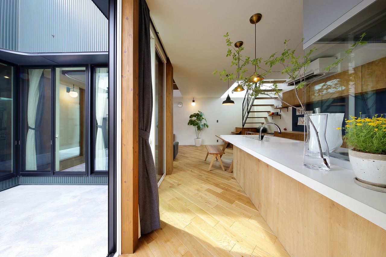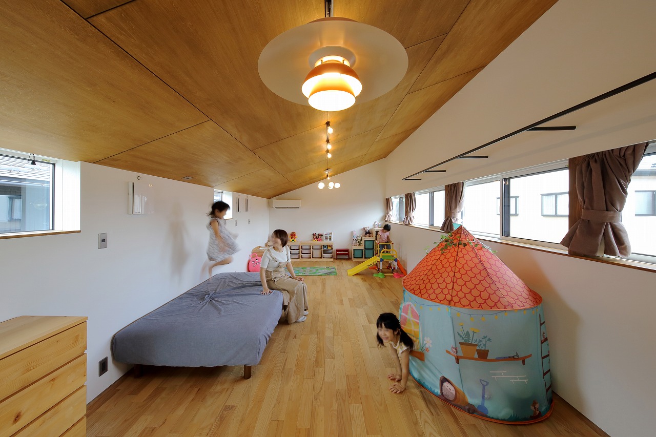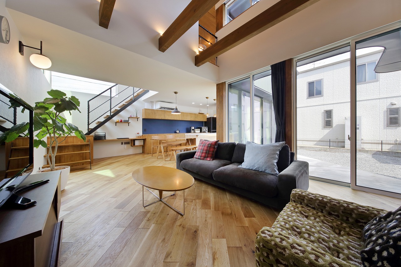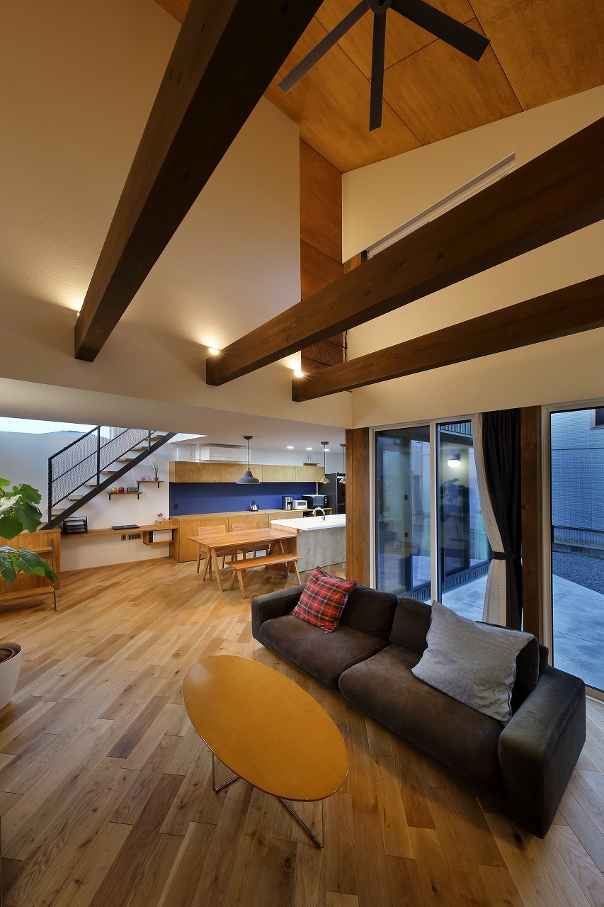 街並みの抜けを意識したリビングアクセスの階段は安定した北側採光を室内に注ぐ意味でも効果的です。2階のプライベートルームはワンルームとし、将来の間仕切りによって個室化される予定です。リビング上部の吹き抜けからは採光を得ることはもちろん、2階とのつながりや開放感をもたらしてくれます。