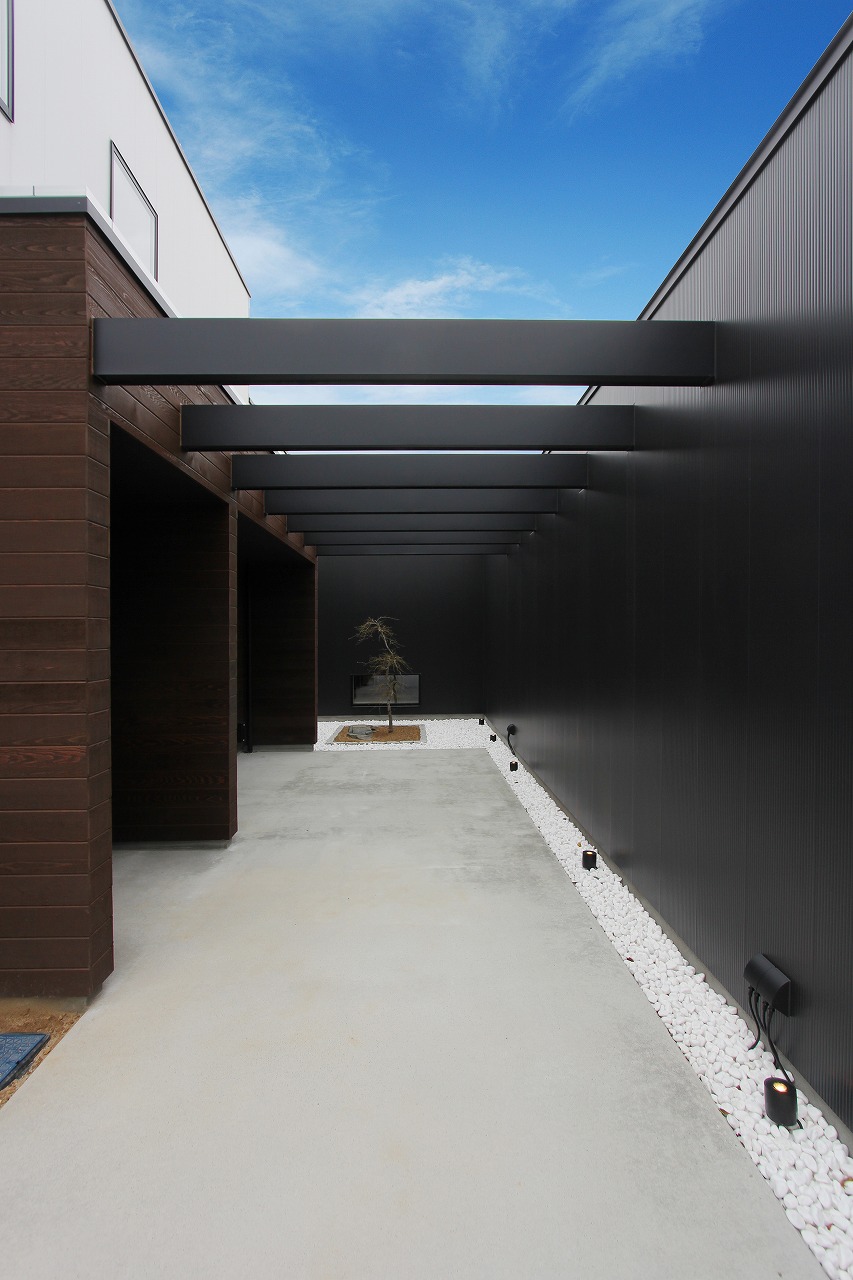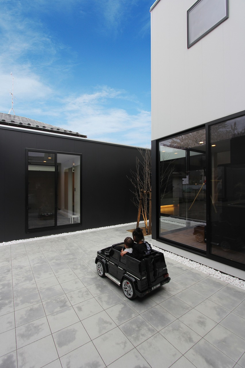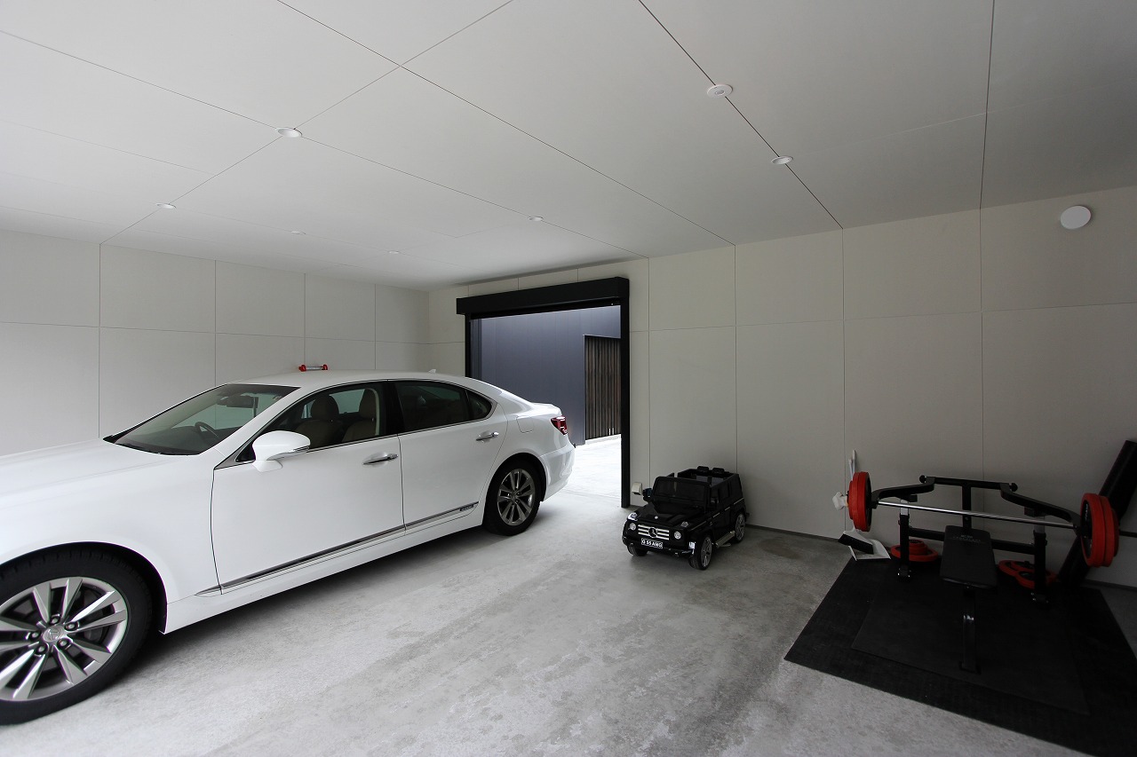 道路側にご要望のガレージを設計し、趣味のジェットスキーをパティオ2まで移動できるようにしています。東に配置したパティオ2は広場とガレージとの連続性を意識し、建具によって広場との距離感を楽しめるようにしています。旦那さんのトレーニングルームともつながり、玄関を通さなくてもBBQなど楽しめるようにしています。西側のパティオ1は玄関前と和室から「和」を感じられるようにしています。2つのパティオによってプライバシーを確保しながら外の空間も一体利用できる広がりのある空間構成になっています。