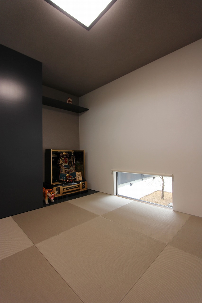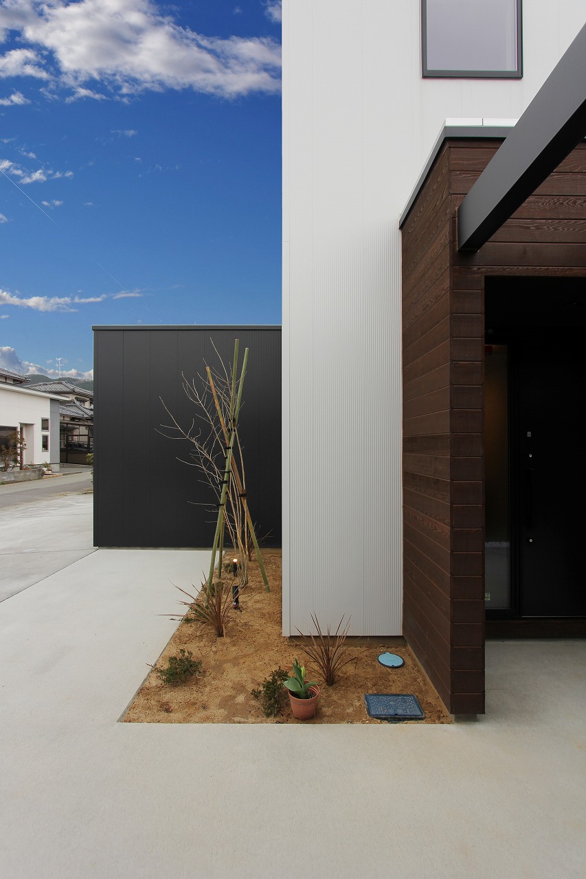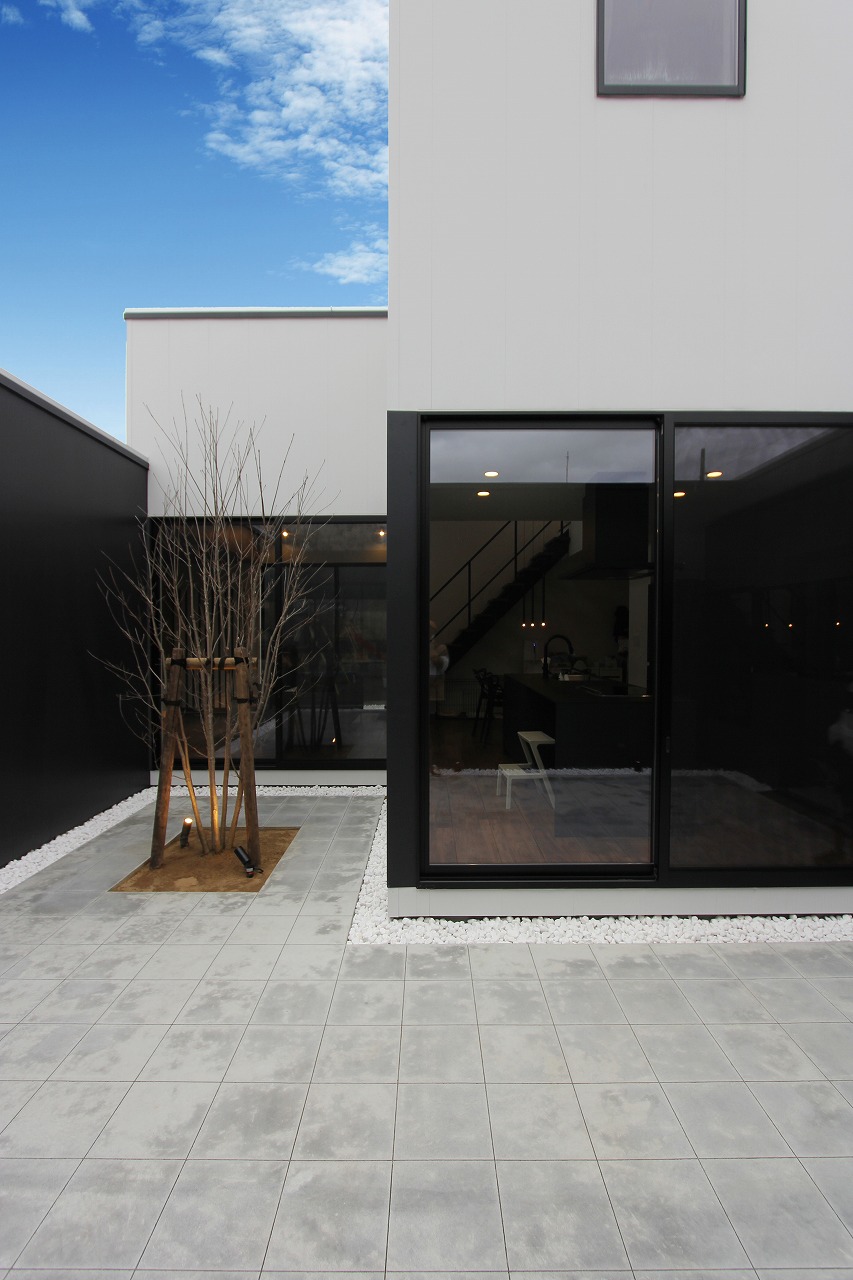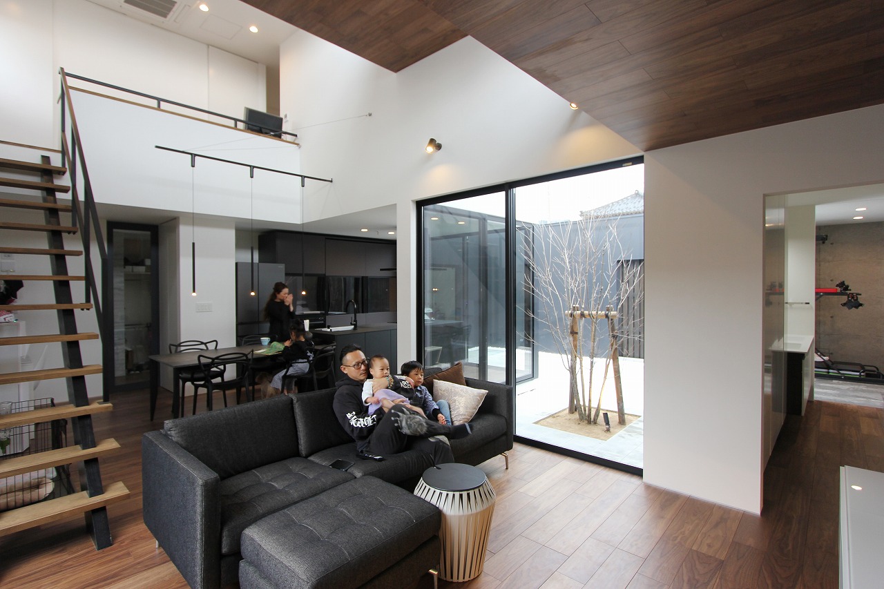 道路側にご要望のガレージを設計し、趣味のジェットスキーをパティオ2まで移動できるようにしています。東に配置したパティオ2は広場とガレージとの連続性を意識し、建具によって広場との距離感を楽しめるようにしています。旦那さんのトレーニングルームともつながり、玄関を通さなくてもBBQなど楽しめるようにしています。西側のパティオ1は玄関前と和室から「和」を感じられるようにしています。2つのパティオによってプライバシーを確保しながら外の空間も一体利用できる広がりのある空間構成になっています。