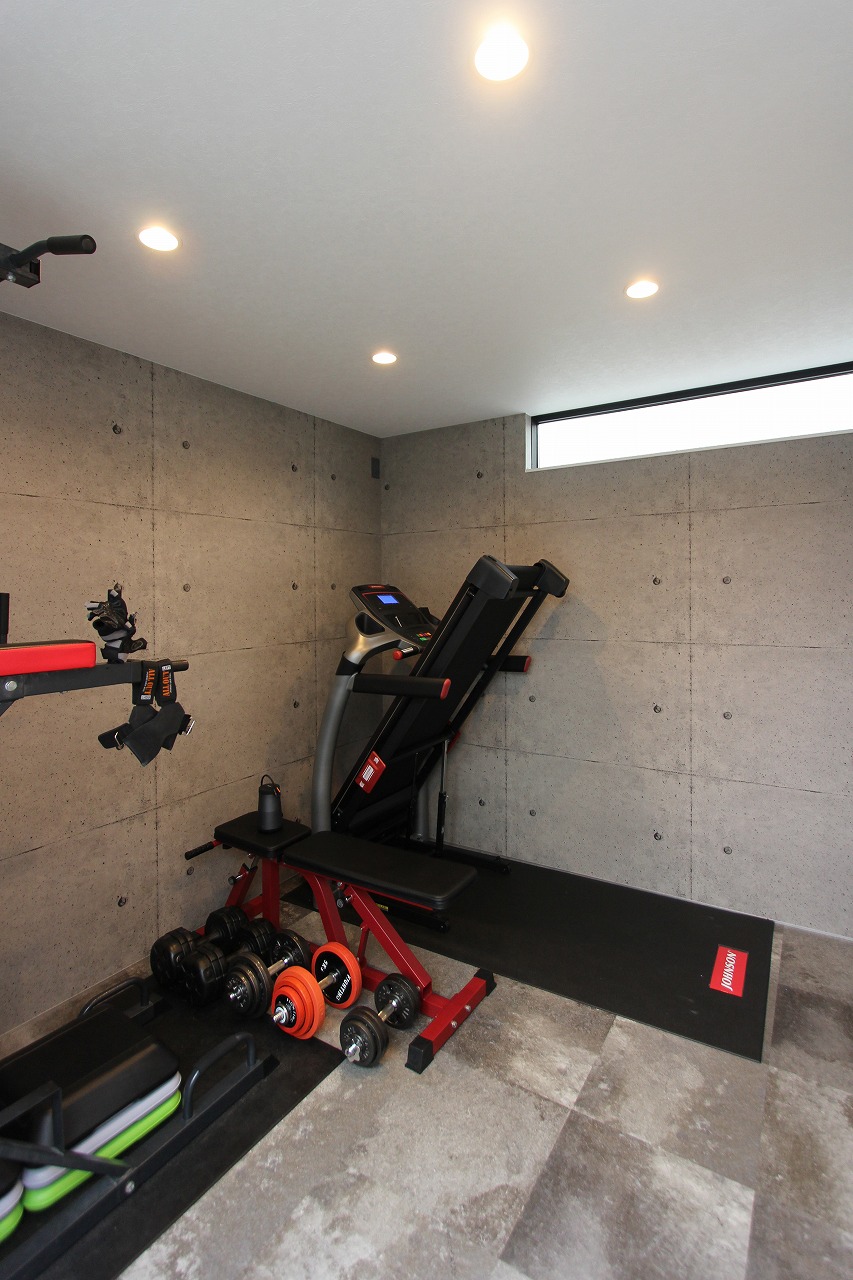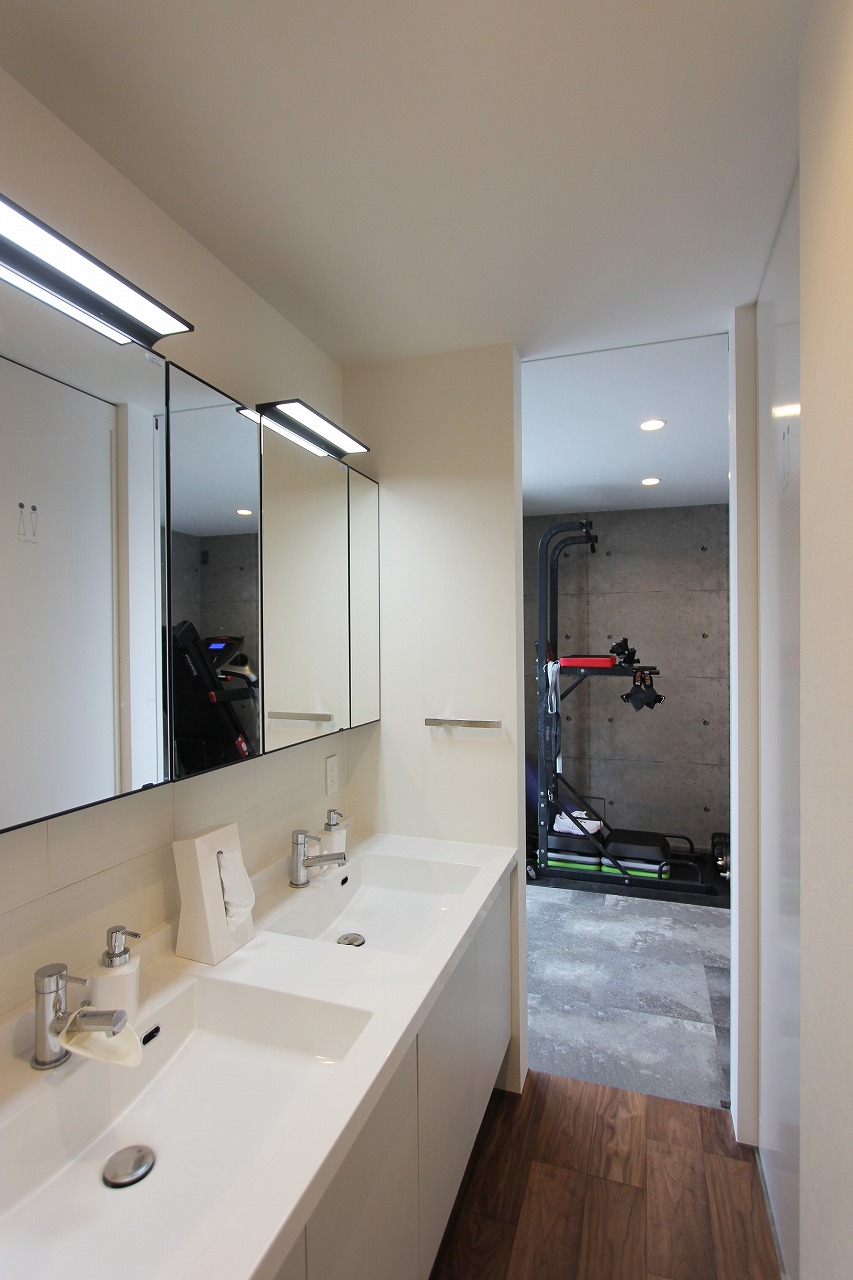 南側に配置した水廻りは家事動線やトレーニングルームからの動線を考慮しています。リビング上部や吹き抜け上部からは南採光を得るハイサイド窓を配置しているため、南側に水廻りを配置しても明るい空間となっています。