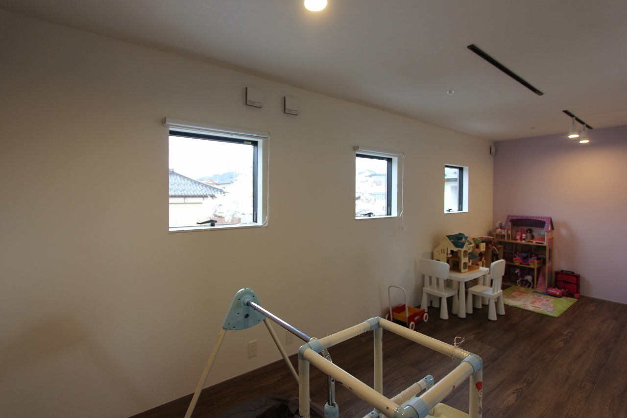 2階はプライベートスペースになっていて子供部屋からは広場の桜を楽しめるように窓を配置しています。