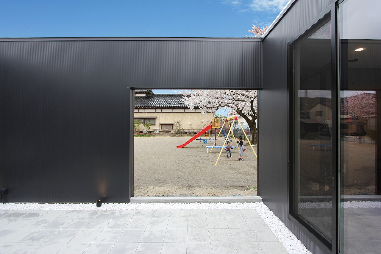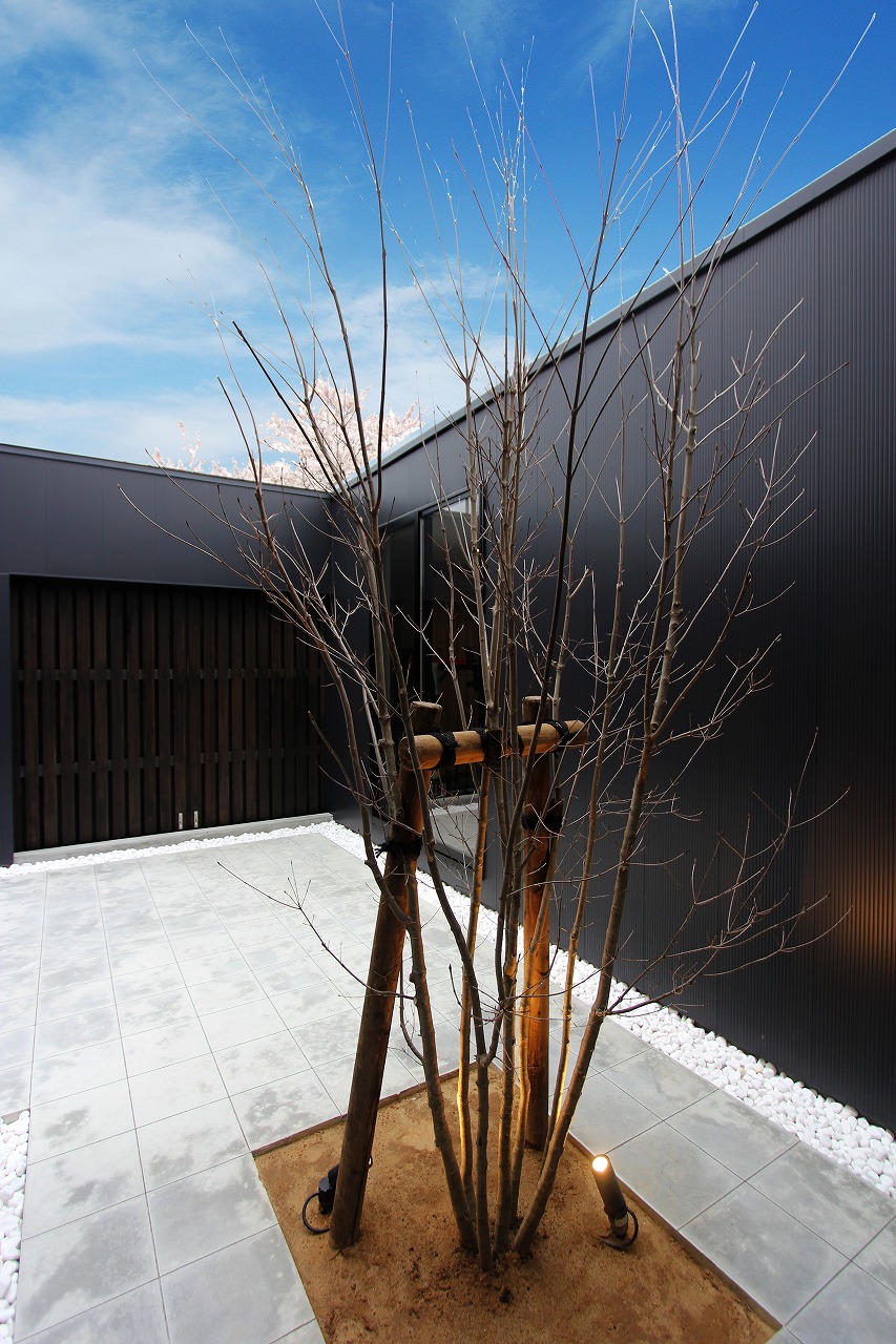 東側にある地区広場との境界に境がなく、建替え前のご自宅でも玄関から直接子供たちが広場に出ていく動線がありました。また桜の木がシンボル的に配置されていた為、広場とのつながりと桜の木を活かす設計をご提案しました。