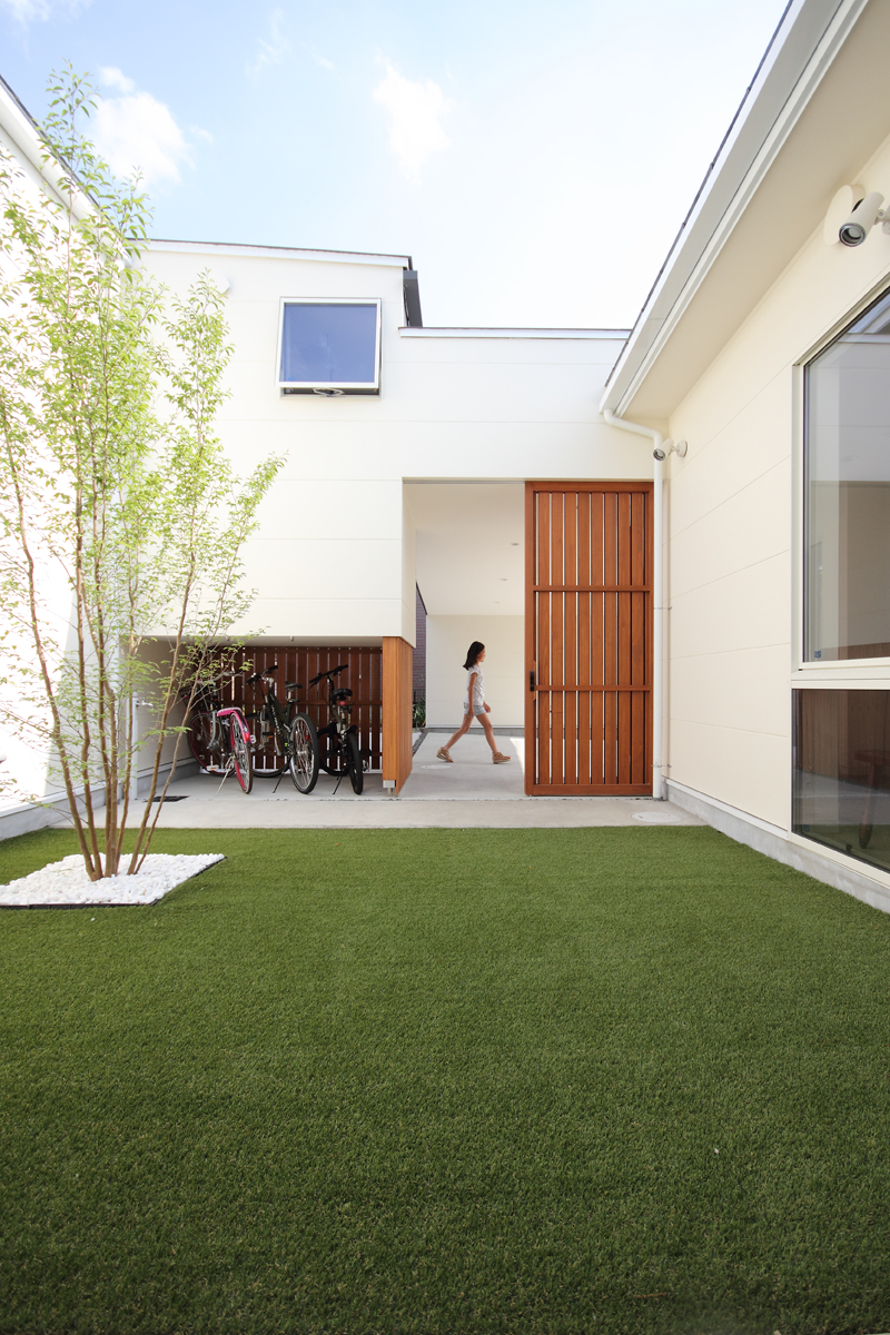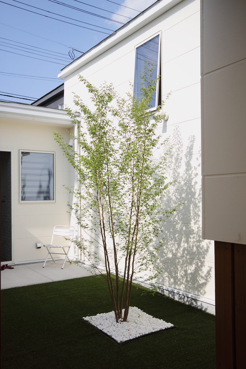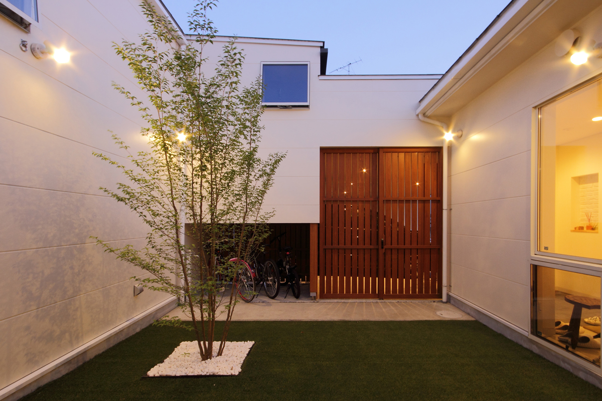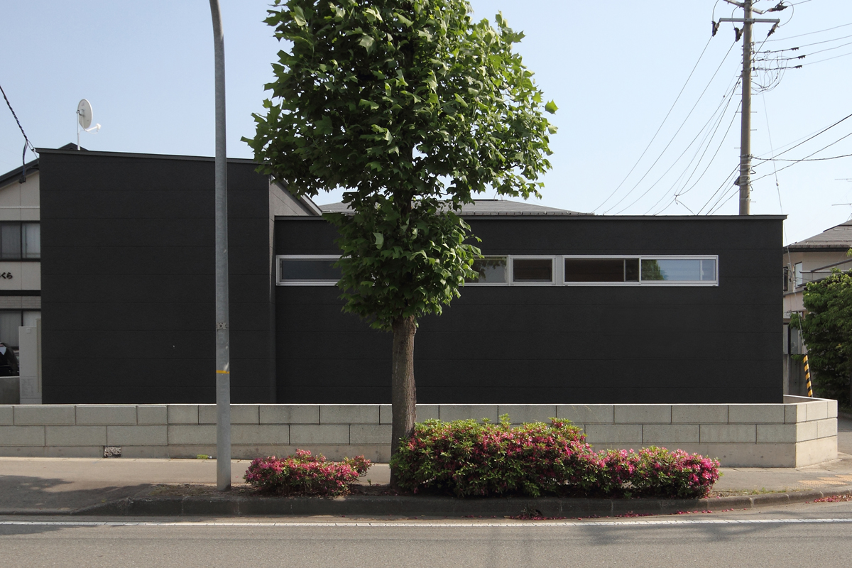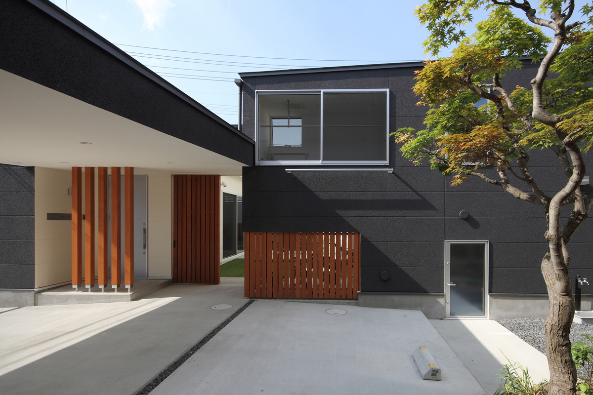 計画地は山形市街地 にあり、比較的交通量の多い通りに面して立地しています。広々とした敷地を周囲の視線を気にせず過ごせるよう鍵括弧を組み合わせたようなボリュームの中に中庭を広く取った平屋建ての間取りとしました。32坪とコンパクトな室内空間ですが、一部床下収納やロフトなどを設け、立体的に空間を使う構成を取ることや・中庭の効果もあり広々とした空間を体感できます。2台分のカーポートは雪の多い地域での車の管理を容易にするだけでなく、外部の作業ヤードとしての機能も有します。室内は中庭を囲むようL型にLDKを配置し、それぞれのエリアが独立しながらつながりも保てるよう配慮しました。個室は最低限の広さながらロフトをそれぞれに設けるなど+αの楽しさを実現しています。床下収納やクローゼットなどの空間を各用途ごとに充実させ、内外のものをすっきりと収納できるようにしました。また、床暖房の入った土間仕上げの床やオガファーザー(ウッドチップ壁紙)やレンガ調タイル等仕上げにもこだわった住宅です。
