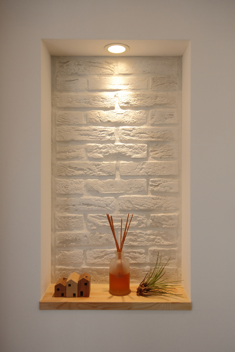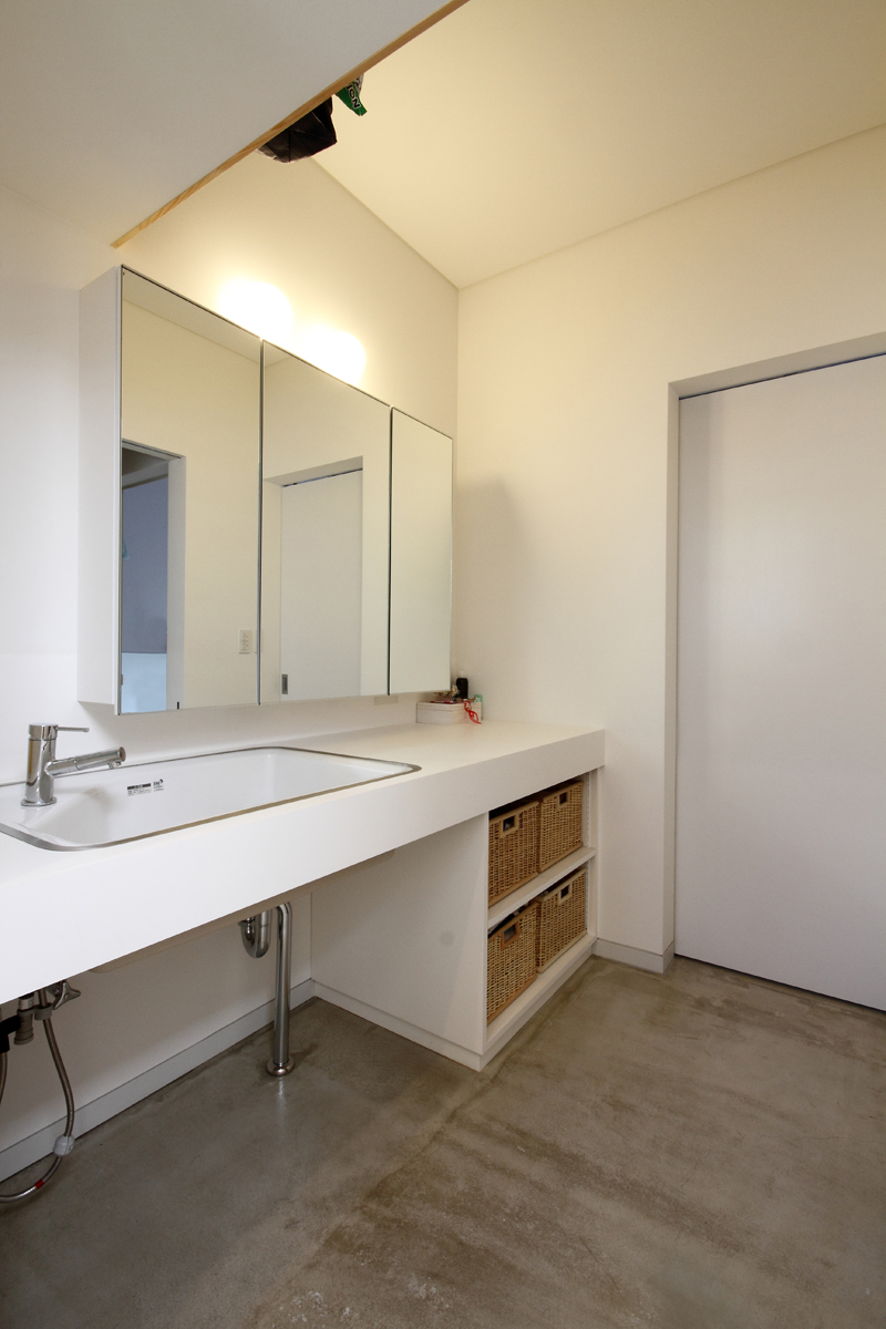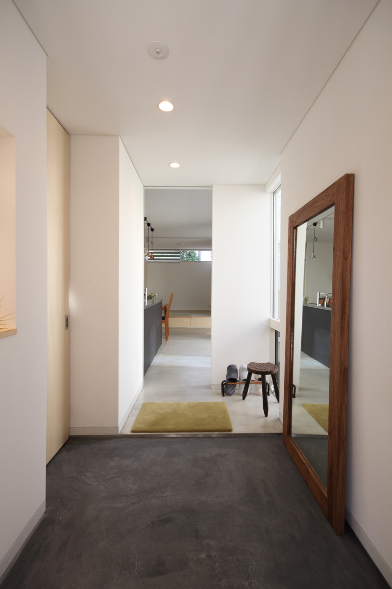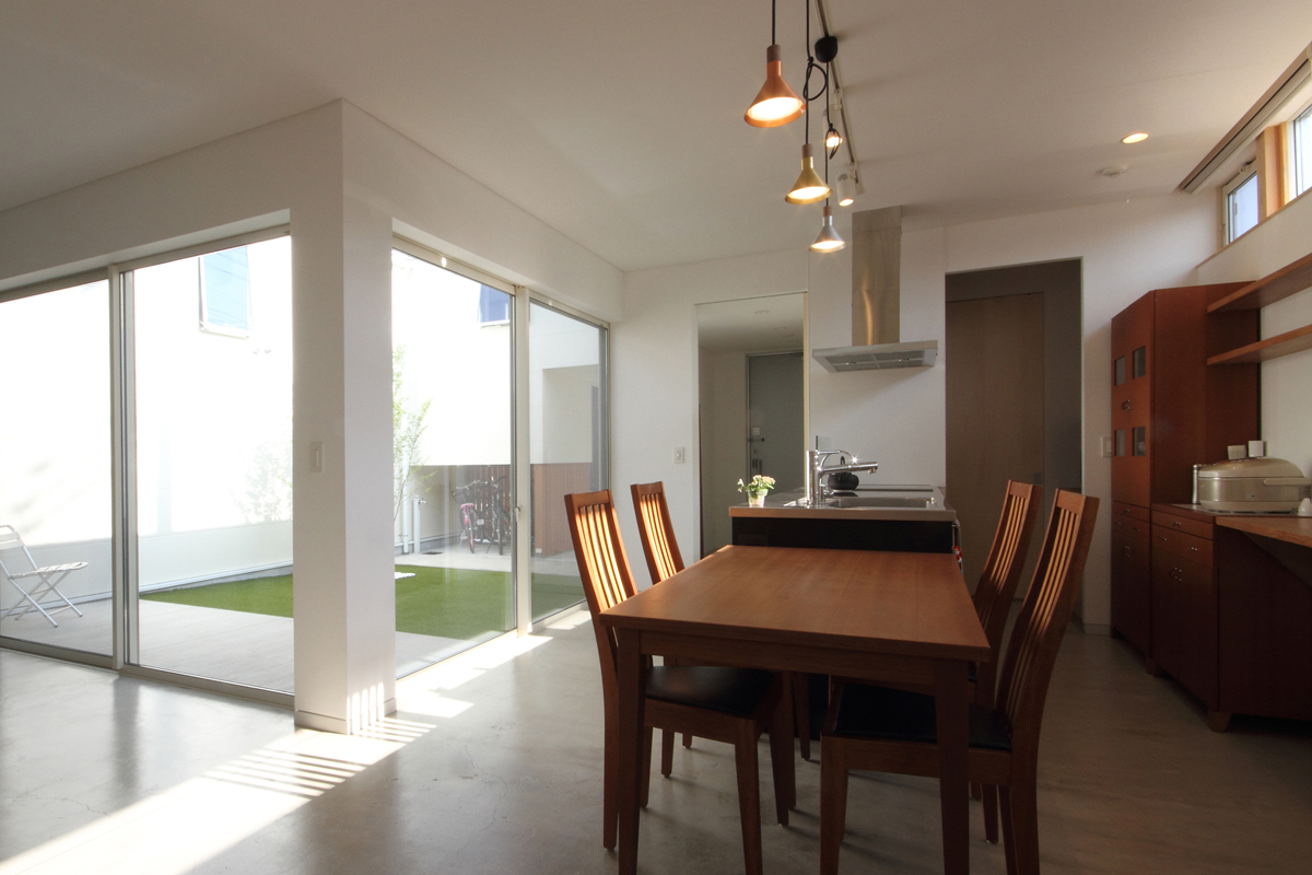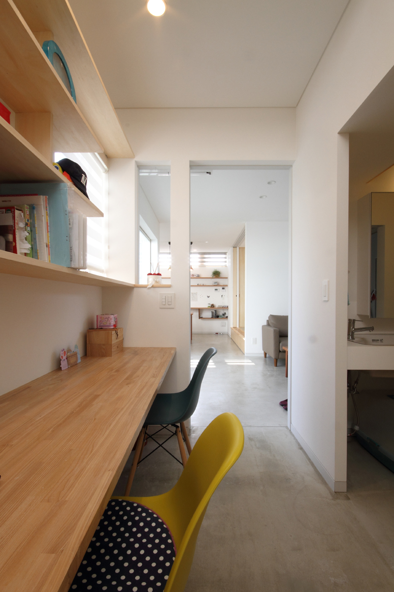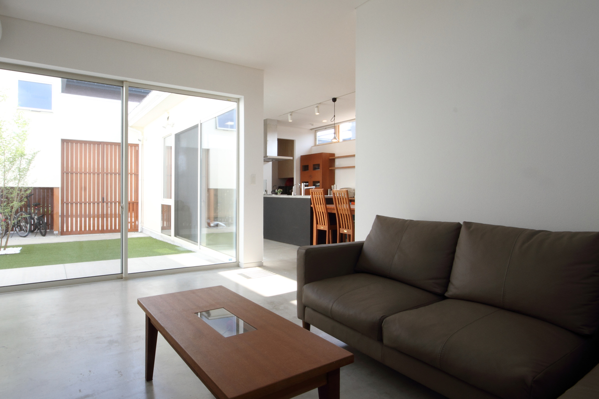 計画地は山形市街地 にあり、比較的交通量の多い通りに面して立地しています。広々とした敷地を周囲の視線を気にせず過ごせるよう鍵括弧を組み合わせたようなボリュームの中に中庭を広く取った平屋建ての間取りとしました。32坪とコンパクトな室内空間ですが、一部床下収納やロフトなどを設け、立体的に空間を使う構成を取ることや・中庭の効果もあり広々とした空間を体感できます。2台分のカーポートは雪の多い地域での車の管理を容易にするだけでなく、外部の作業ヤードとしての機能も有します。室内は中庭を囲むようL型にLDKを配置し、それぞれのエリアが独立しながらつながりも保てるよう配慮しました。個室は最低限の広さながらロフトをそれぞれに設けるなど+αの楽しさを実現しています。床下収納やクローゼットなどの空間を各用途ごとに充実させ、内外のものをすっきりと収納できるようにしました。また、床暖房の入った土間仕上げの床やオガファーザー(ウッドチップ壁紙)やレンガ調タイル等仕上げにもこだわった住宅です。