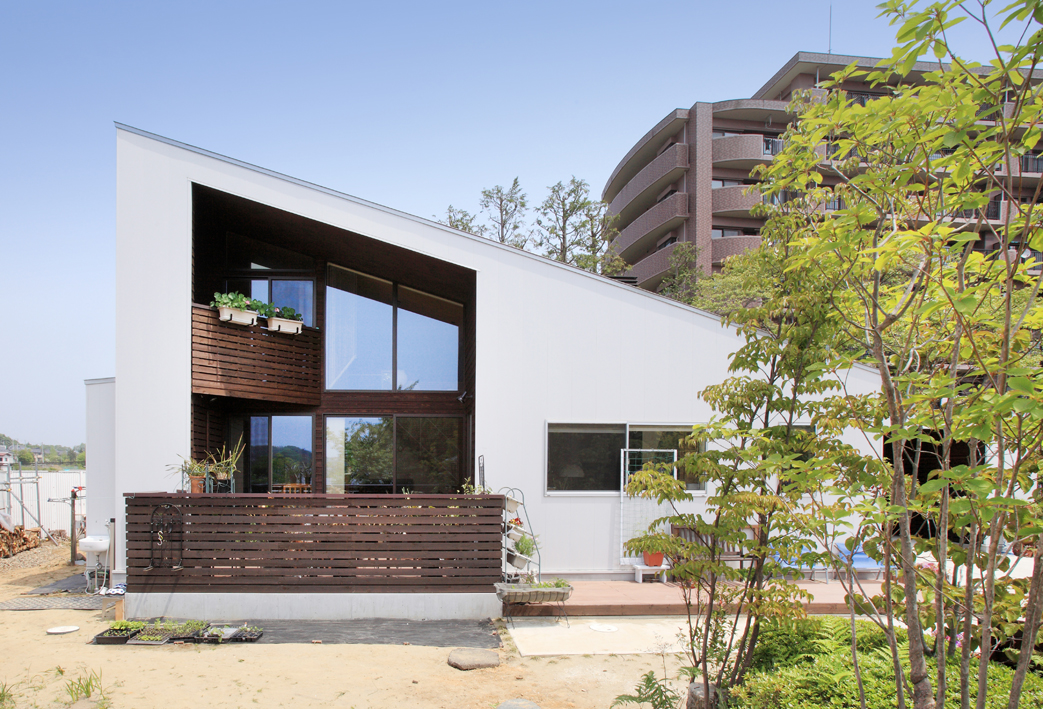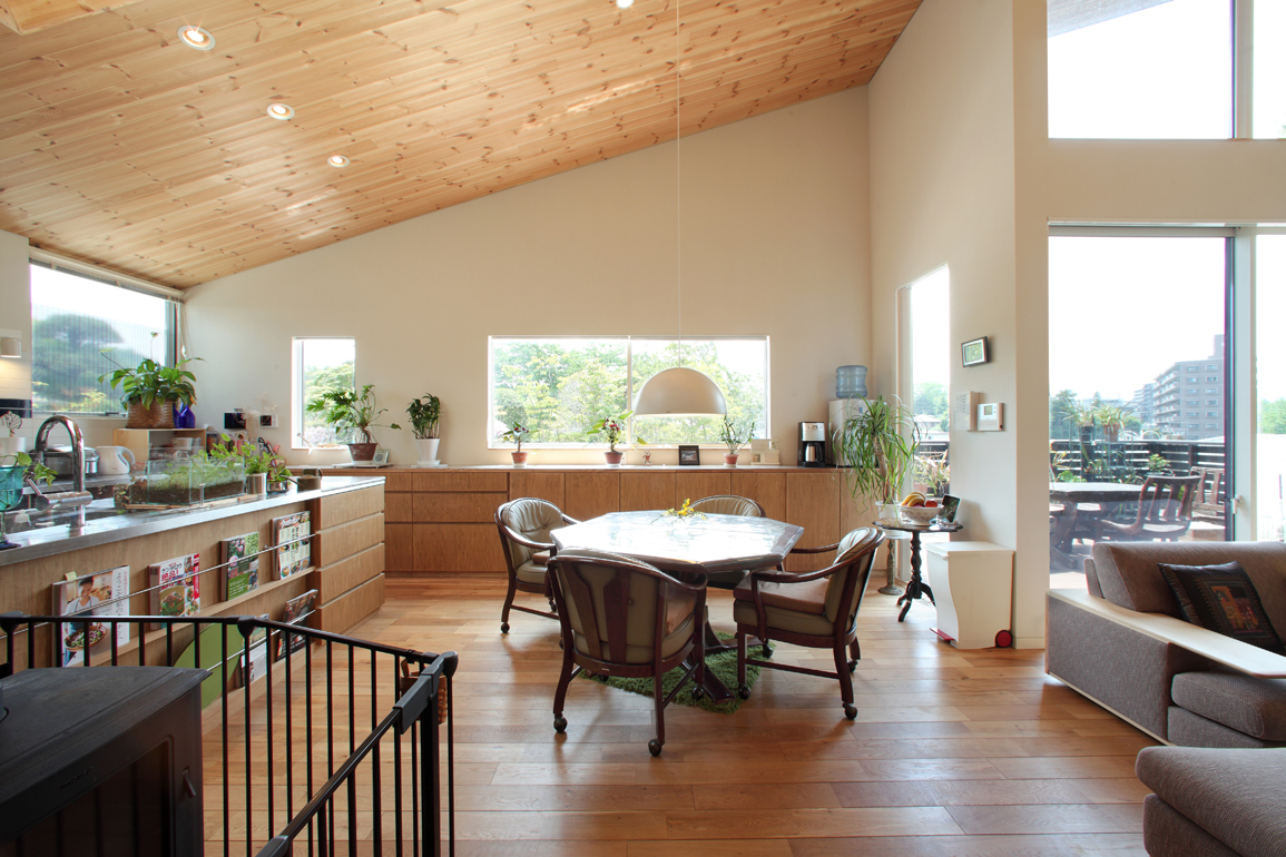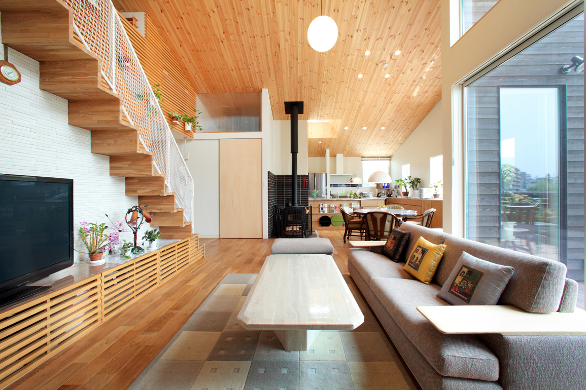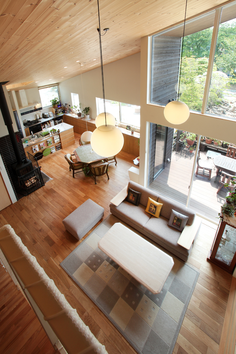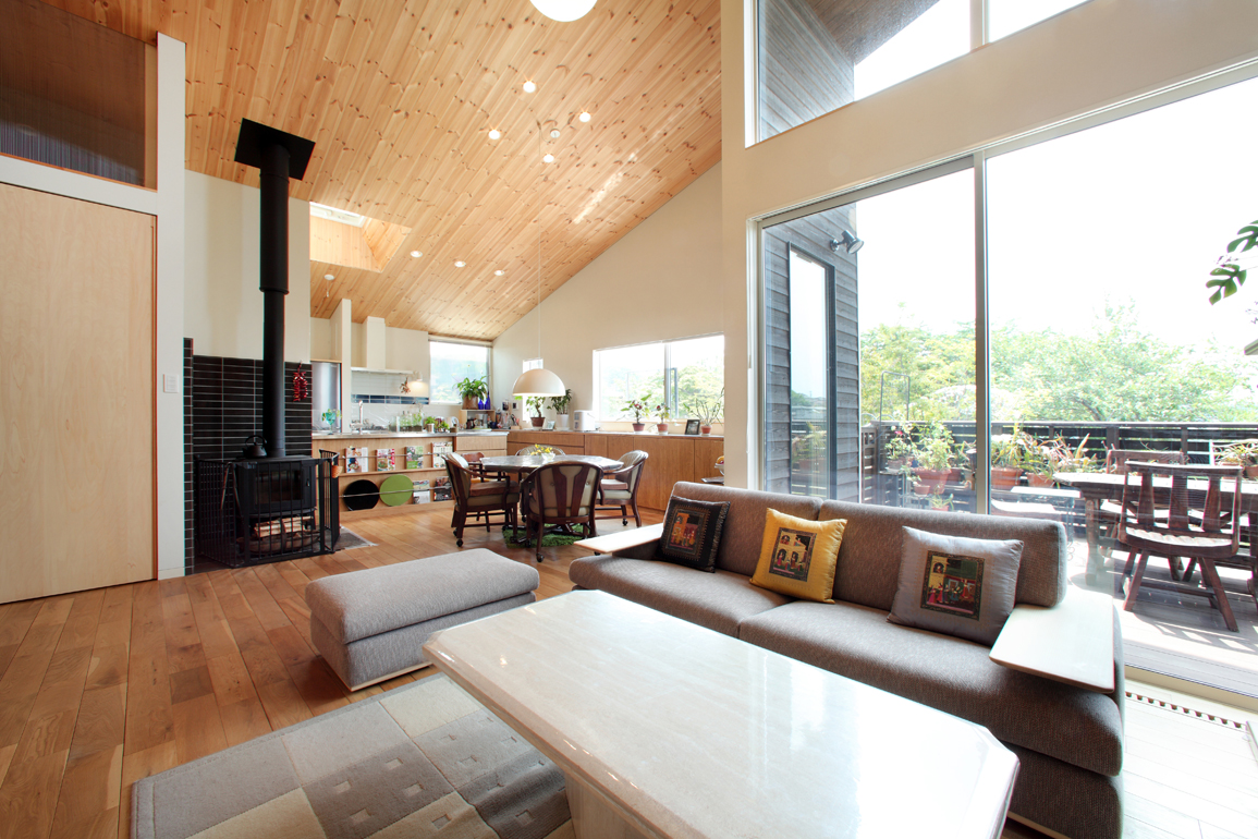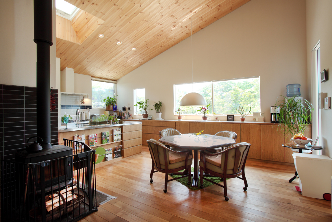 計画地は交通量の多い幹線道から少し入った高台の上にある、畑や林に囲まれた場所です。3.11の地震で全壊した住宅の建替え計画で、老後の生活を見据えたコンパクトで機能的な家事動線を取り入れた間取りが望まれました。震災の教訓から暖炉や太陽光パネル、深夜蓄熱の暖房と給湯、LPGのガスコンロなどを組み合わせて一つのエネルギーに偏らない暮らしを目指しています。家の中心に暖炉を据え、それを取り囲むようにリビングやダイニングキッチンなど家族が集まる場所が広がる伸びやかなワンルーム空間となり、庭へつづくテラスとつながっています。また、廊下がなく回遊性の高い間取りはバリアのない優しい空間を創出しています。