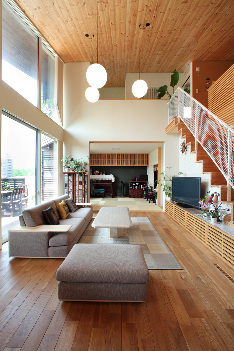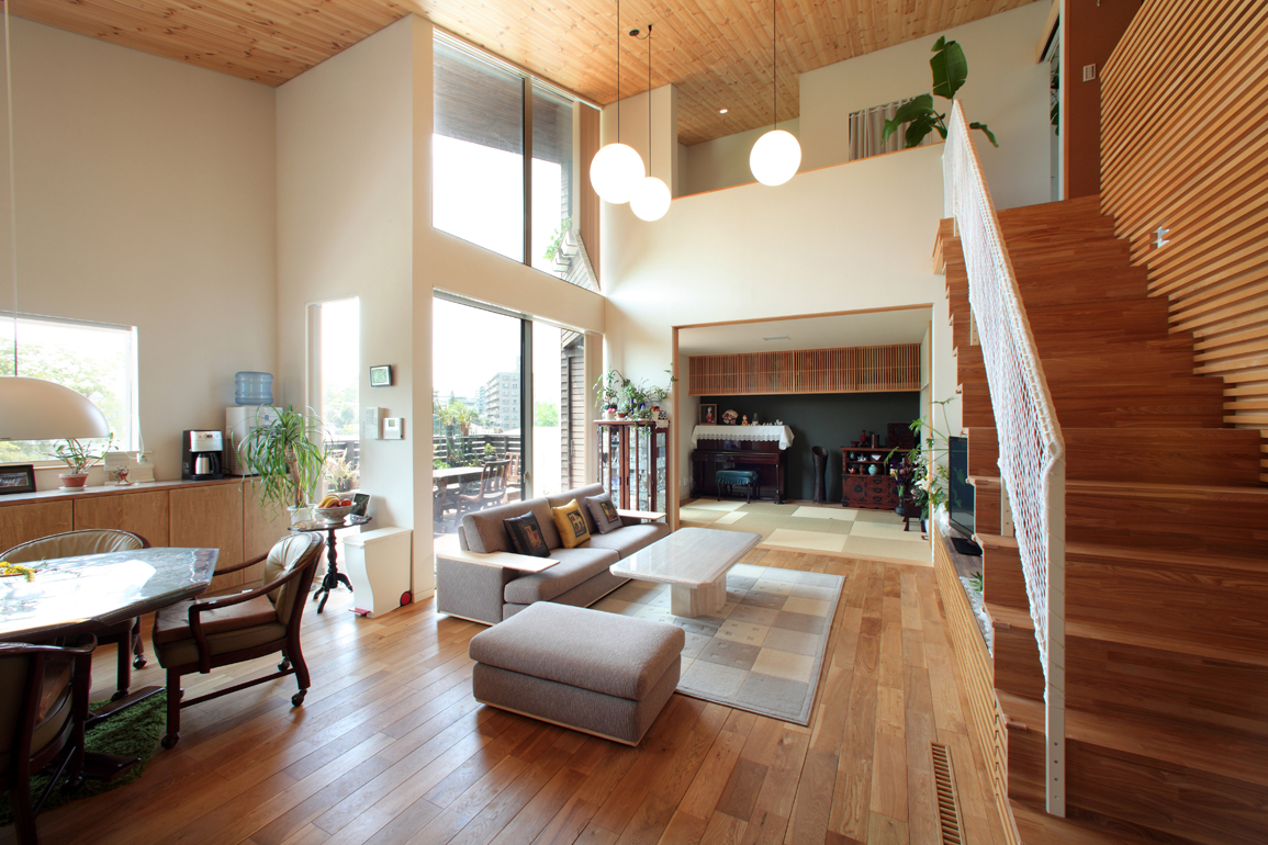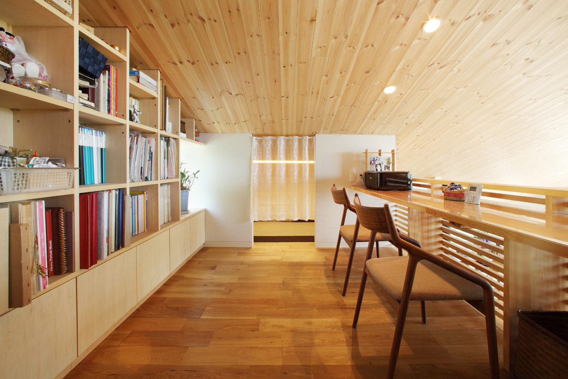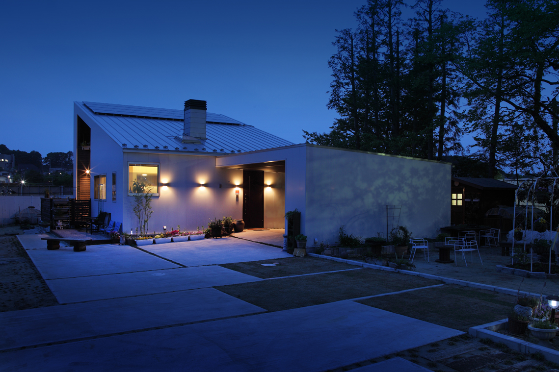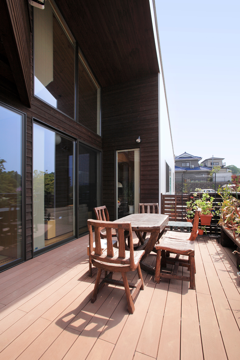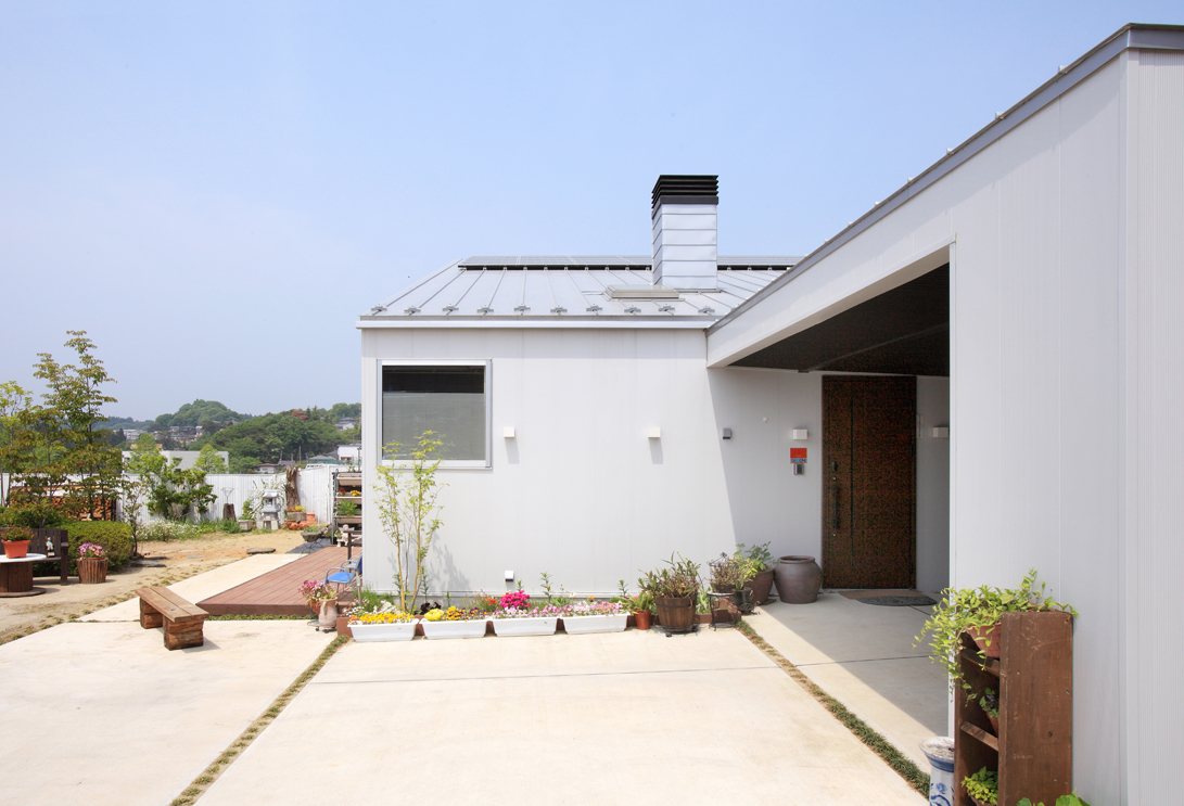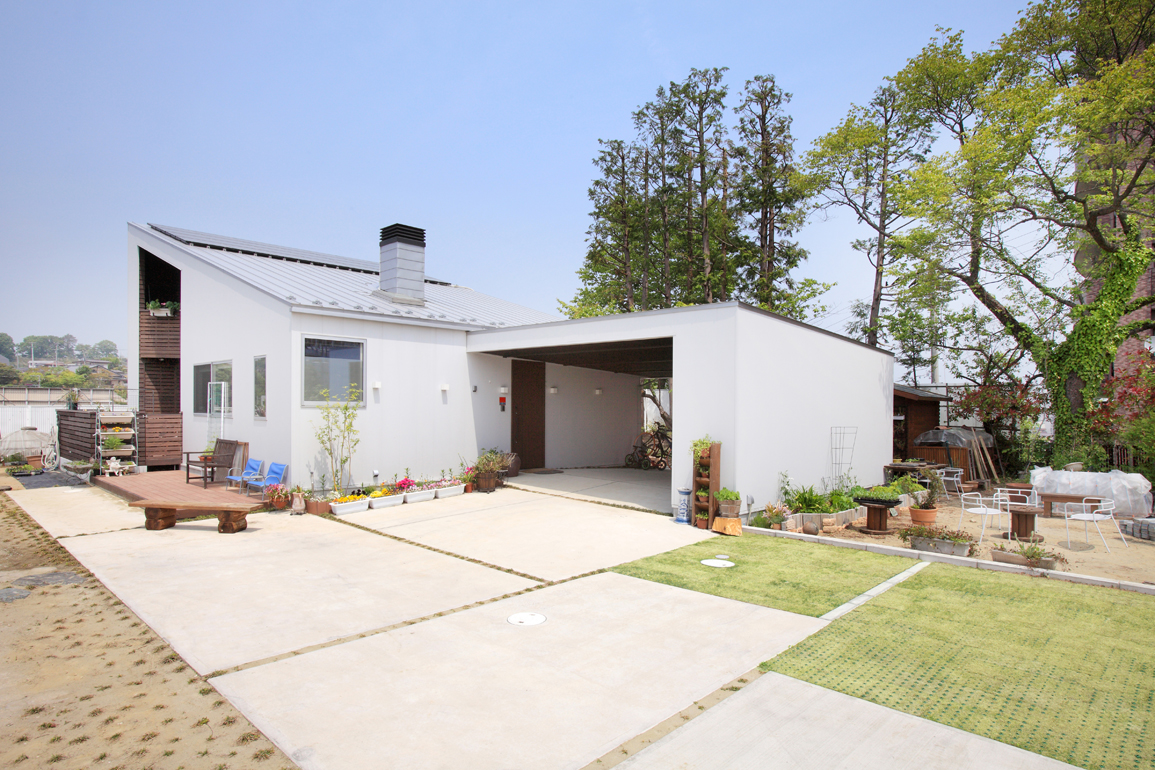 計画地は交通量の多い幹線道から少し入った高台の上にある、畑や林に囲まれた場所です。3.11の地震で全壊した住宅の建替え計画で、老後の生活を見据えたコンパクトで機能的な家事動線を取り入れた間取りが望まれました。震災の教訓から暖炉や太陽光パネル、深夜蓄熱の暖房と給湯、LPGのガスコンロなどを組み合わせて一つのエネルギーに偏らない暮らしを目指しています。家の中心に暖炉を据え、それを取り囲むようにリビングやダイニングキッチンなど家族が集まる場所が広がる伸びやかなワンルーム空間となり、庭へつづくテラスとつながっています。また、廊下がなく回遊性の高い間取りはバリアのない優しい空間を創出しています。