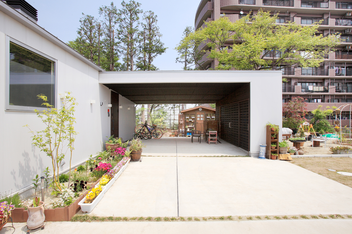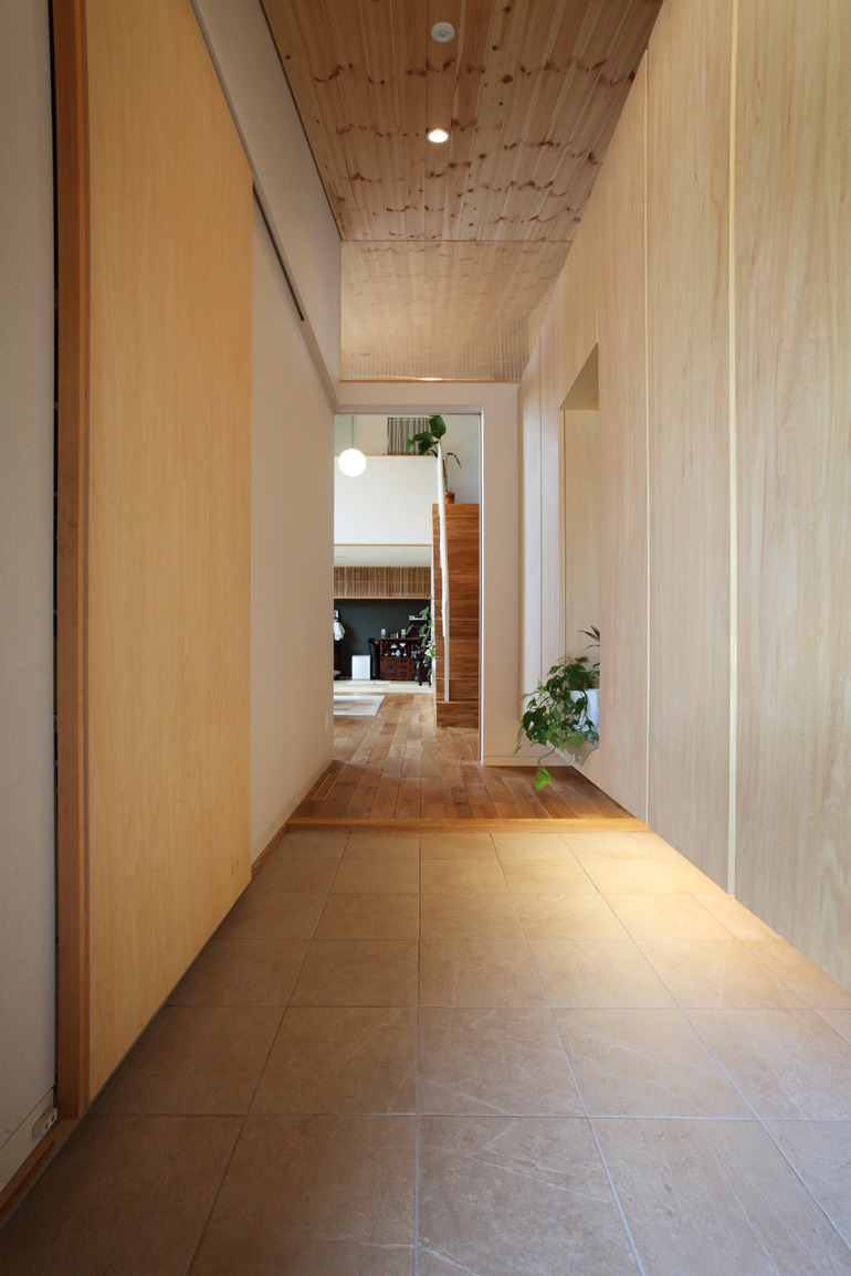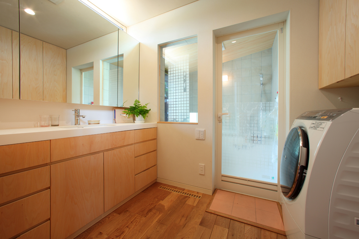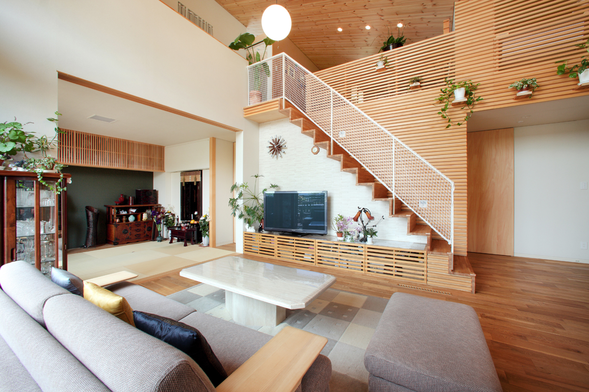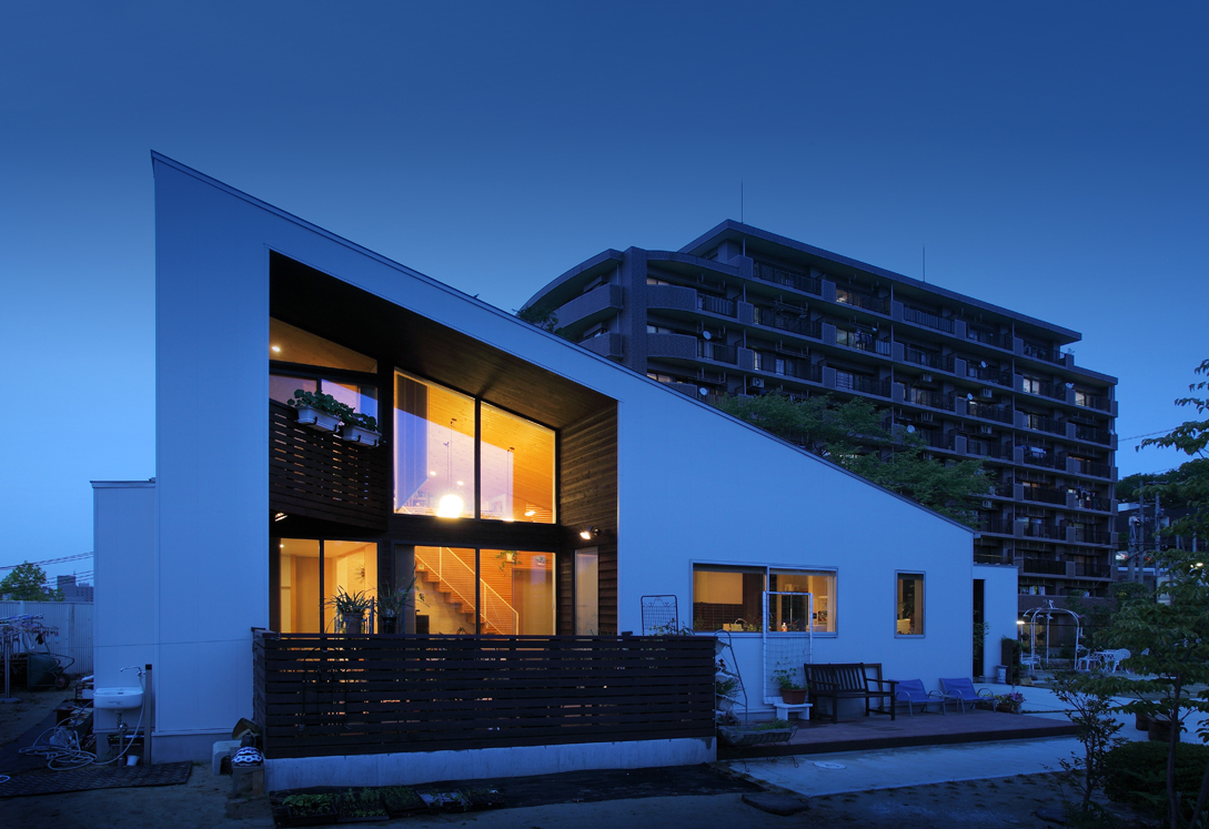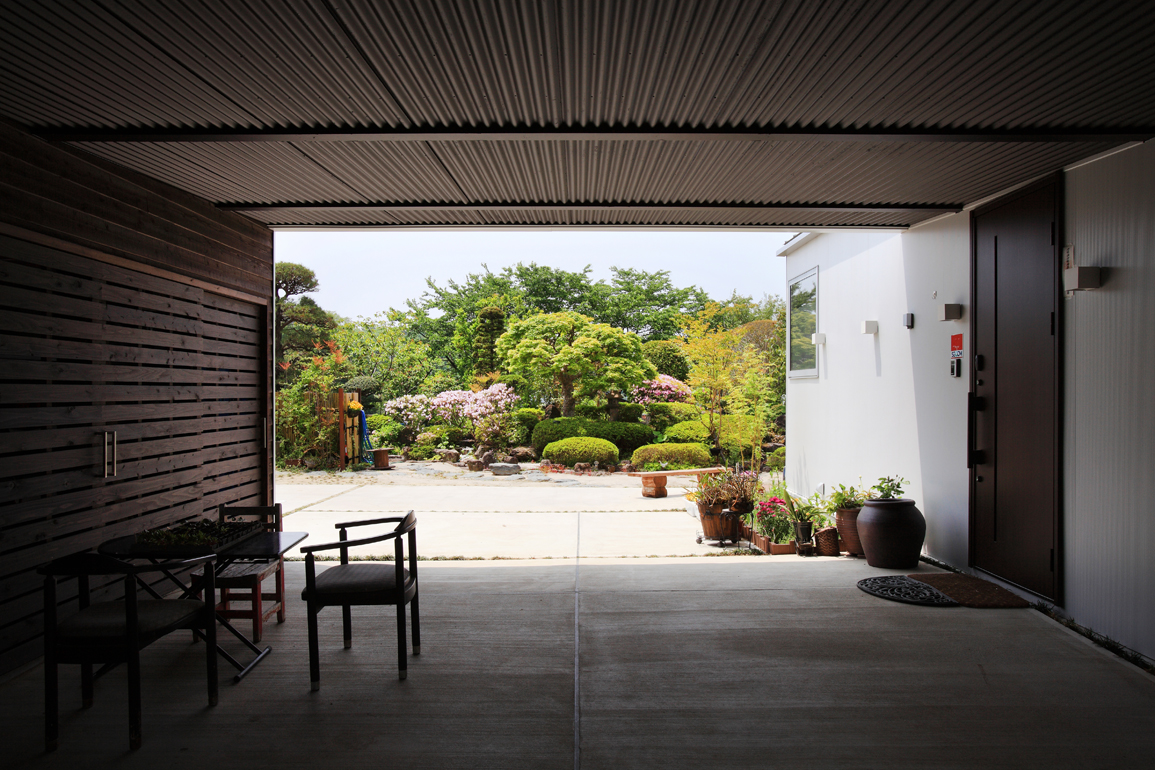 計画地は交通量の多い幹線道から少し入った高台の上にある、畑や林に囲まれた場所です。3.11の地震で全壊した住宅の建替え計画で、老後の生活を見据えたコンパクトで機能的な家事動線を取り入れた間取りが望まれました。震災の教訓から暖炉や太陽光パネル、深夜蓄熱の暖房と給湯、LPGのガスコンロなどを組み合わせて一つのエネルギーに偏らない暮らしを目指しています。家の中心に暖炉を据え、それを取り囲むようにリビングやダイニングキッチンなど家族が集まる場所が広がる伸びやかなワンルーム空間となり、庭へつづくテラスとつながっています。また、廊下がなく回遊性の高い間取りはバリアのない優しい空間を創出しています。