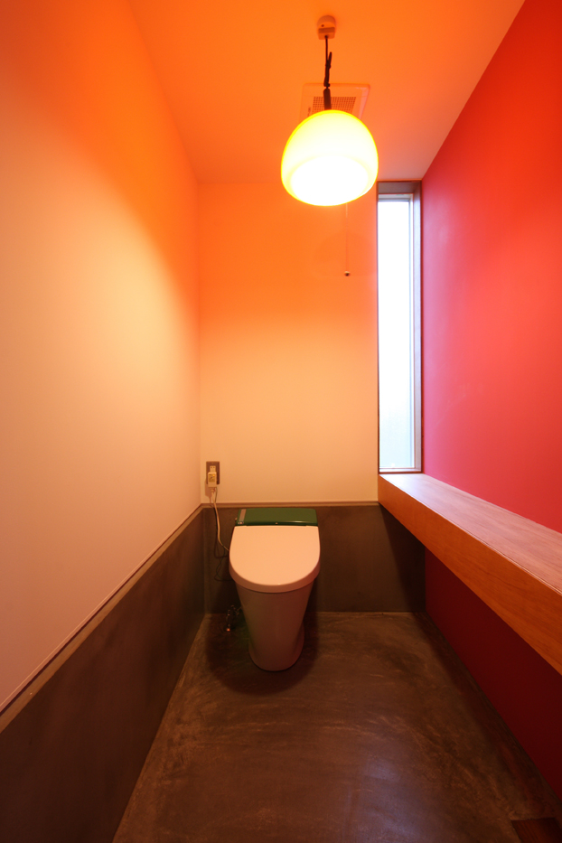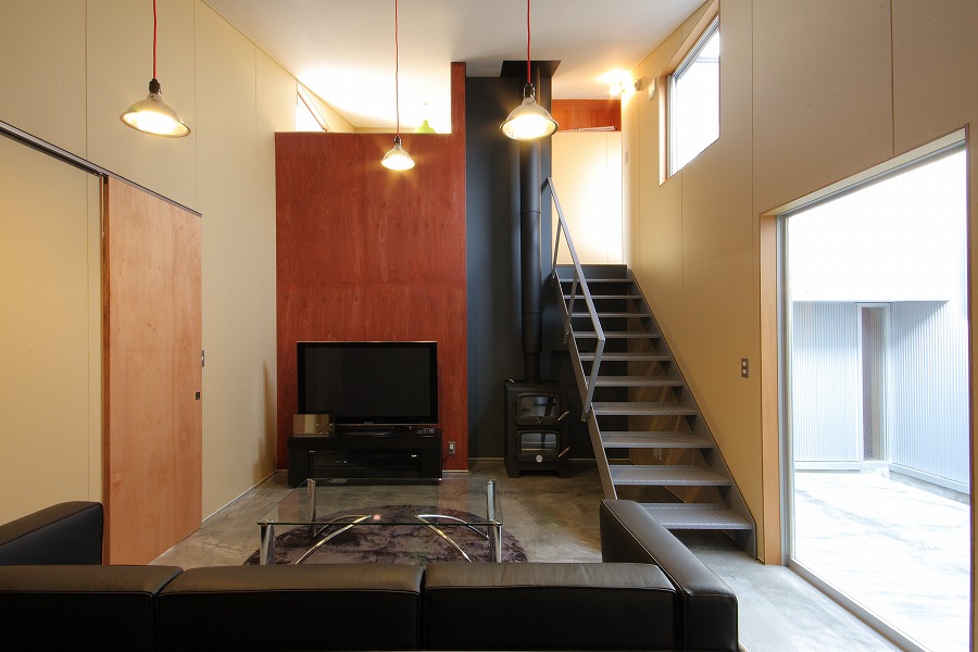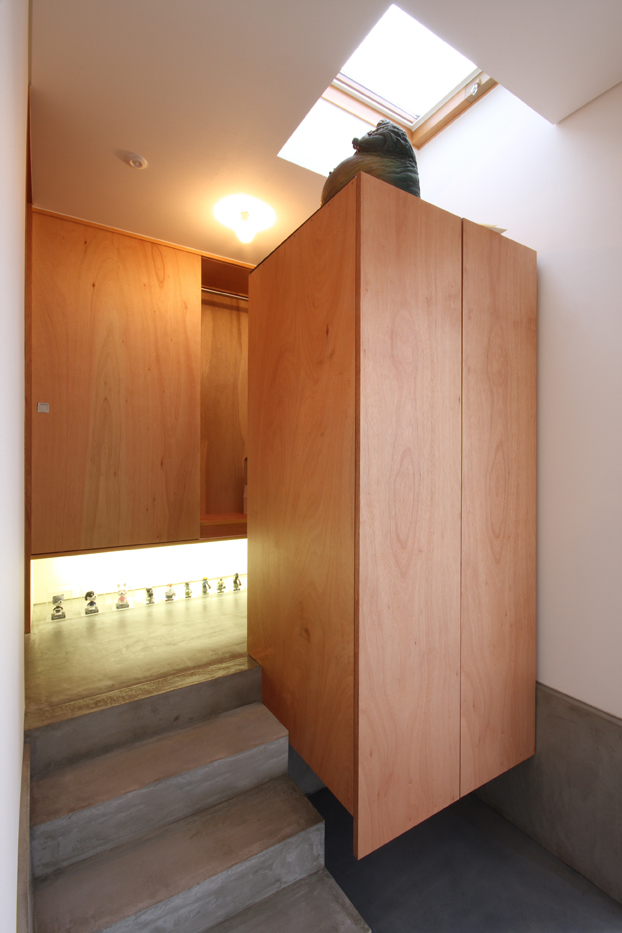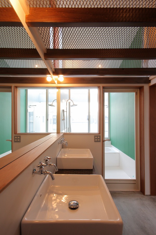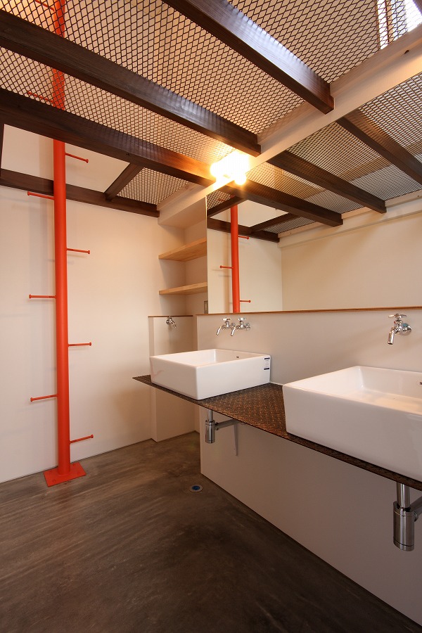 1つ目の”ラフ”な空間演出として、仕上げ材料に工夫をしています。床の土間コンクリートや壁のプラスターボード表し、枠まわりのラワンベニア、洗面カウンターや階段の縞鋼板など、本来の住宅に用いる仕上材では表に出ない素材を仕上材として使用しています。場面ごとに濃淡のある配色を施したり、手間の掛かる施工をして頂いた工務店の協力により、これらの素材を仕上材として成立させています。