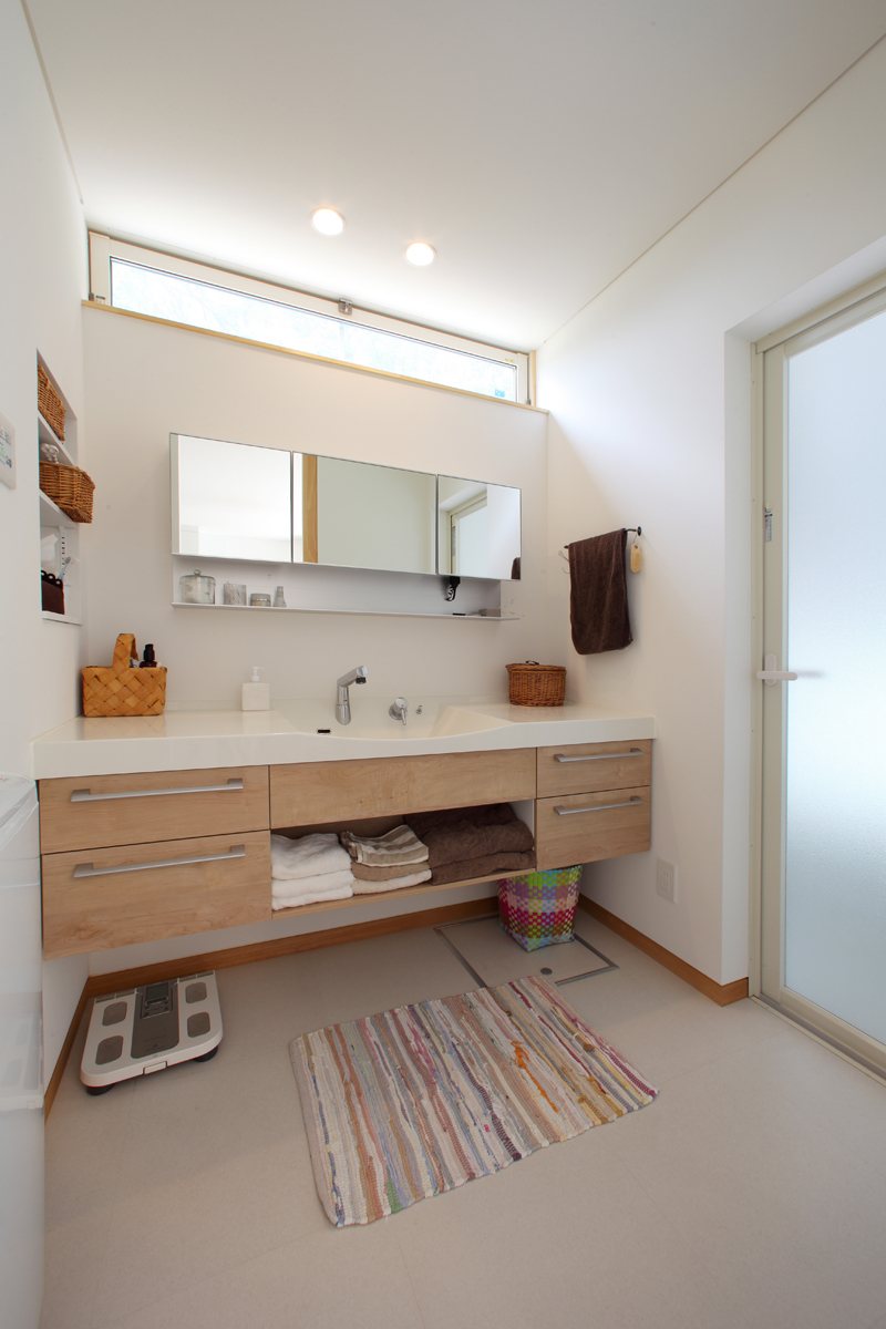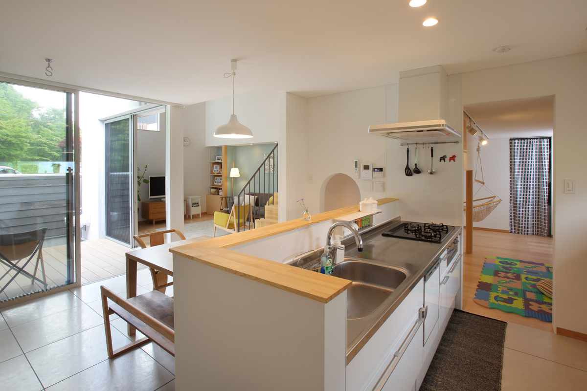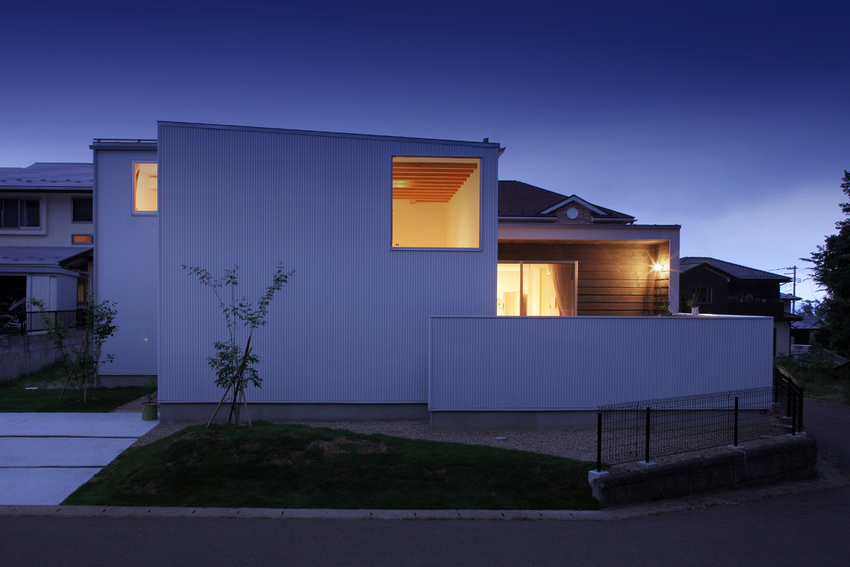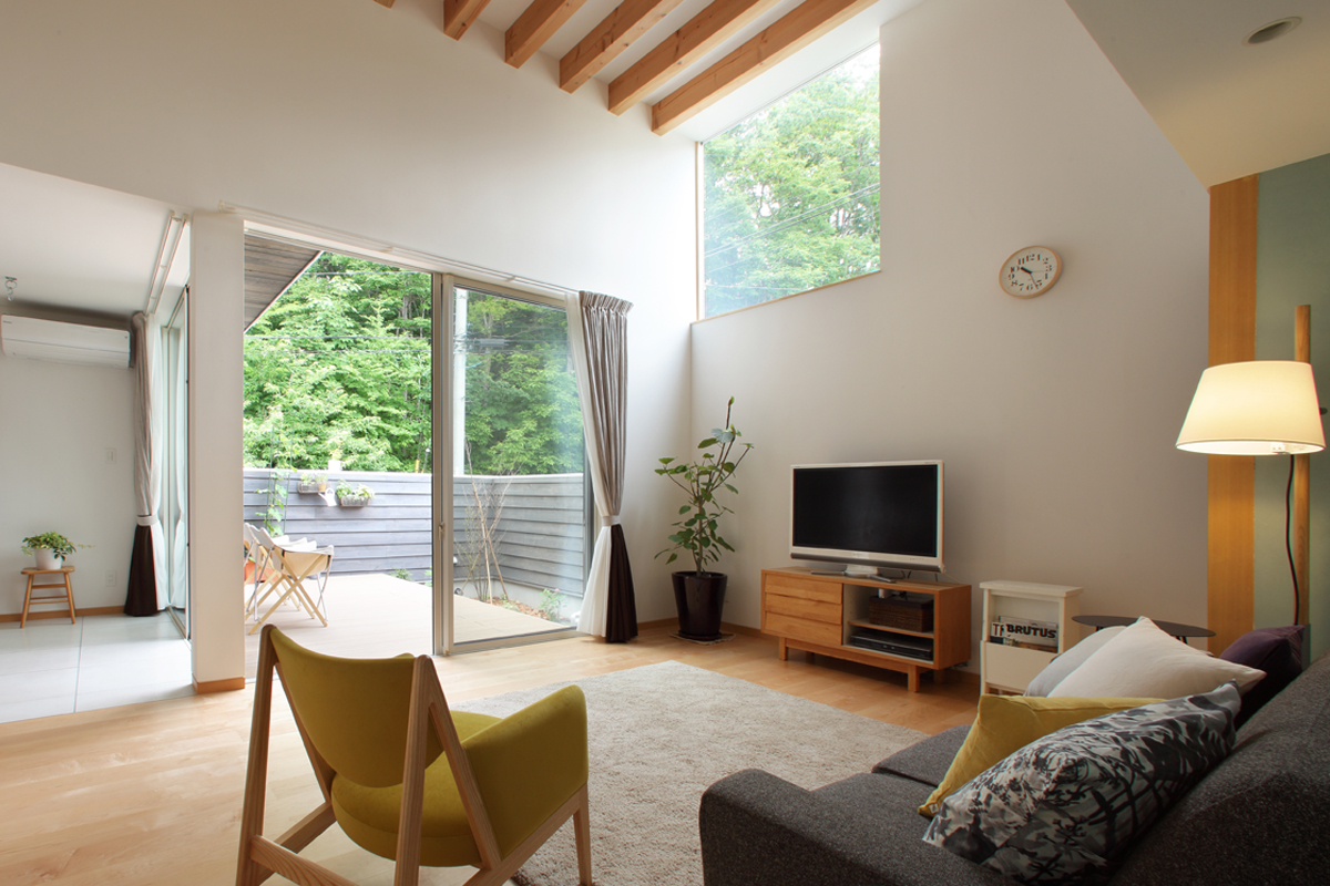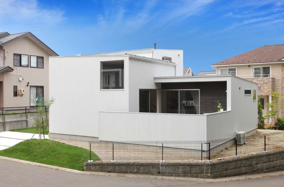 計画地は仙台市郊外丘陵部に位置する新興住宅地の一画で、南東側に区画街路を挟んだ斜面緑地が広がる環境です。周囲の視線を気にせずに室内空間からは斜面の森や空が季節や天候・時間による変化を切り取られた開口部によって楽しめる住まいを目標に親子3人で暮らす住宅を計画しました。