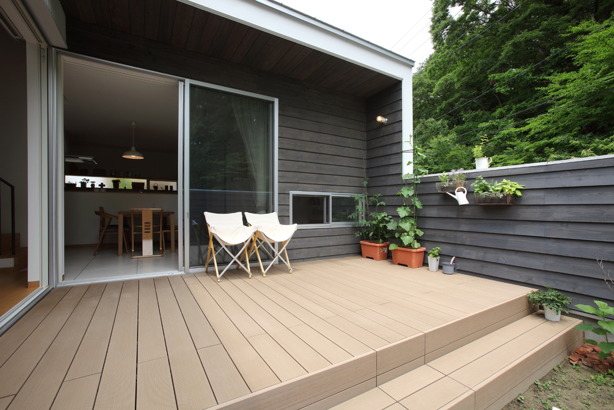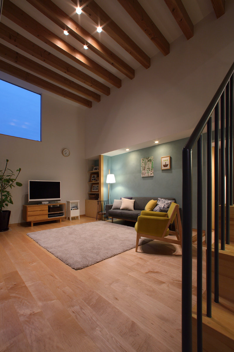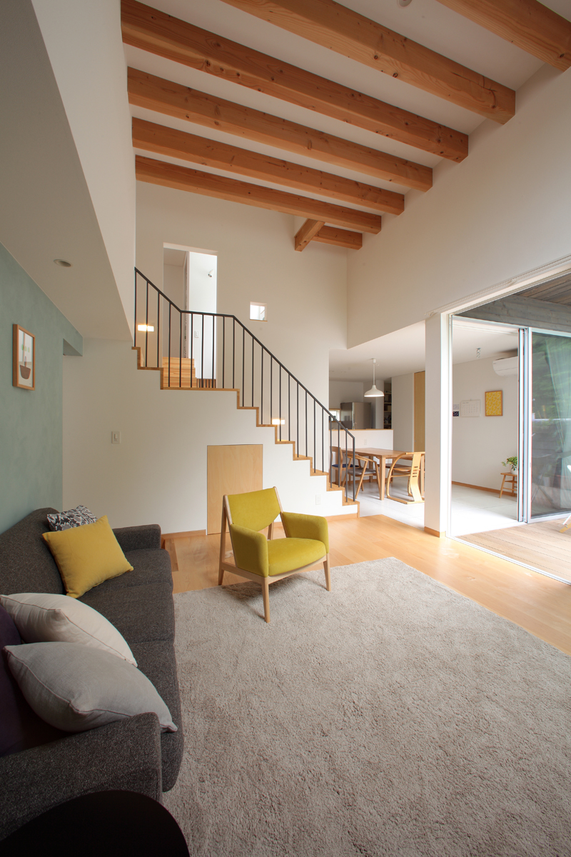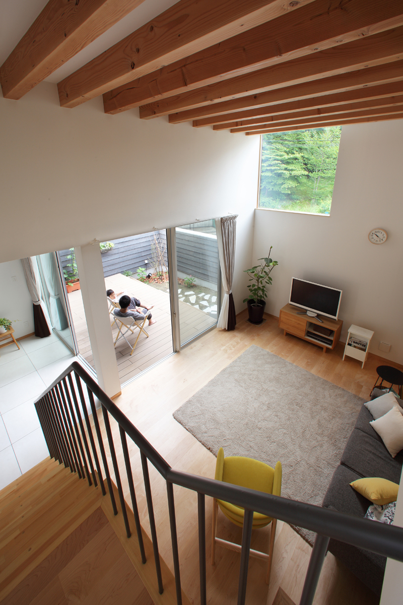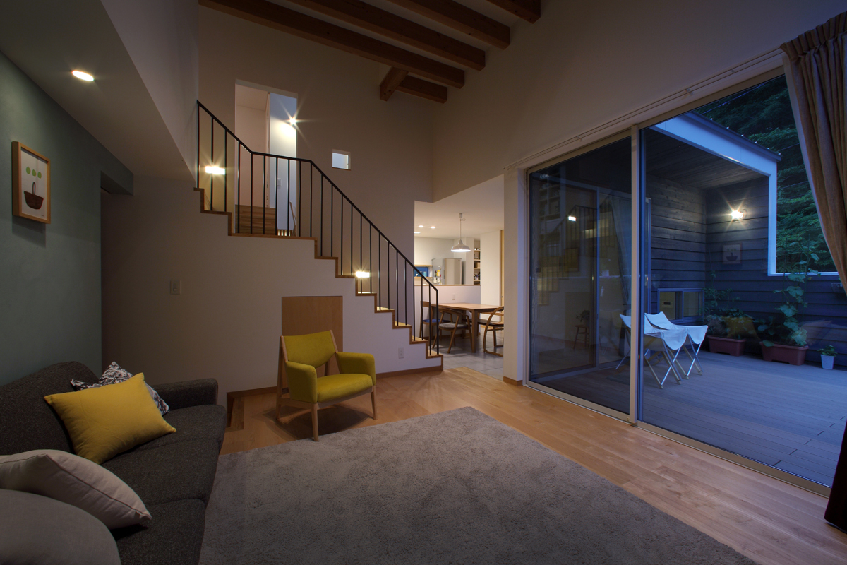 空間の構成は高さの異なる3つの箱が重なり、それぞれに天井高の異なる部屋が折り重なるように配置され、各部屋の独立性を保ちつつも連続性のある空間となり、さらに行き止まりのない回遊性のある平面計画やレベル差を活かした断面計画でコンパクトな室内空間に奥行き感を与える工夫をしています。外壁と一体化した壁で囲まれたデッキテラスの中庭は外部からの視線を遮り、室内とテラス、森や空がひとつに繋がったこの家だけの空間のように味わうことが出来る特別な場所です。セミオープンのご主人の書斎からは大きな窓で切り取られた緑が絵画のように楽しめます。玄関の上には小さな展望テラスがありグレーチングで出来た床からは玄関に光が注ぎます。た、外部倉庫やパントリー、3箇所のウォークインクローゼット、階段下収納等室内外各所にたっぷりの収納空間を用意しました。内装は無垢の質感や樹種本来の色をそのまま活かす自然な仕上がりで、アクセントで配置したオーナーこだわりの色で塗装した壁が柔らかい雰囲気を演出しています。時が経つにつれて味わいのある色味に変化するのもまた楽しみです。