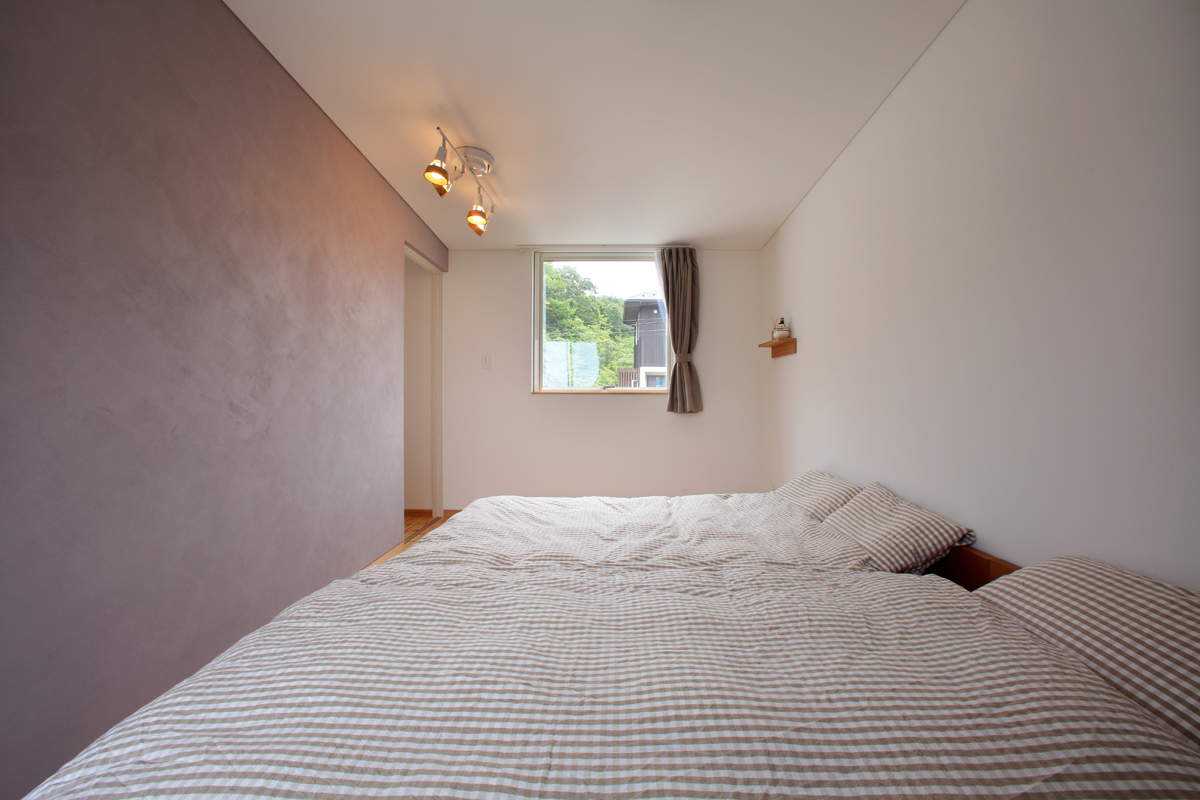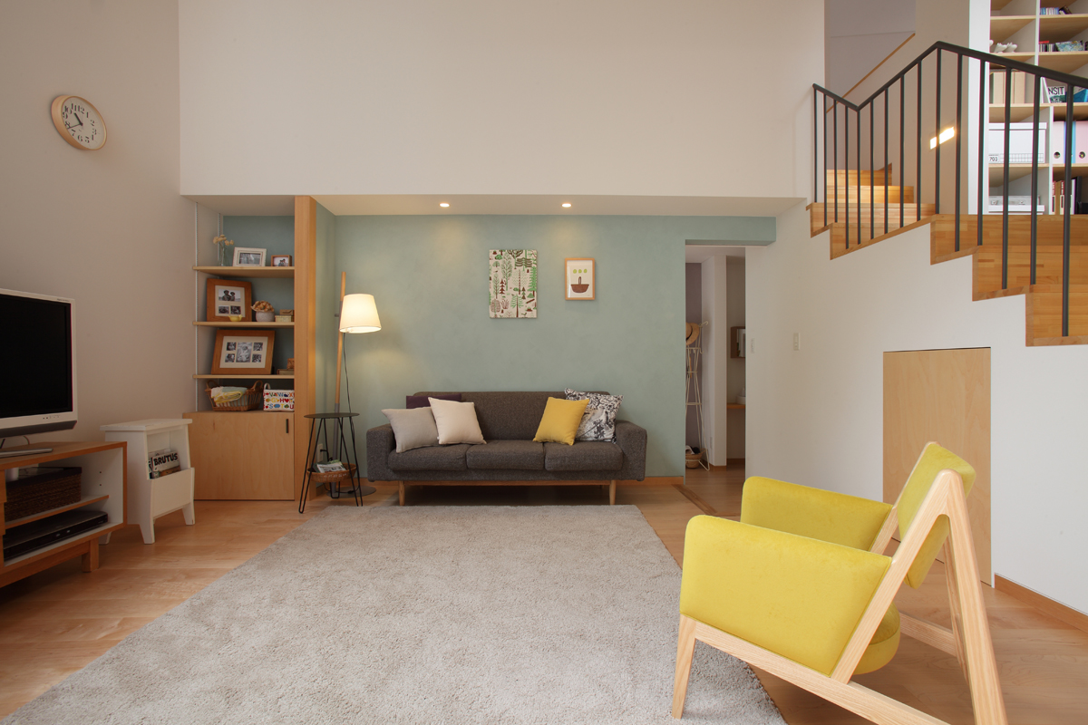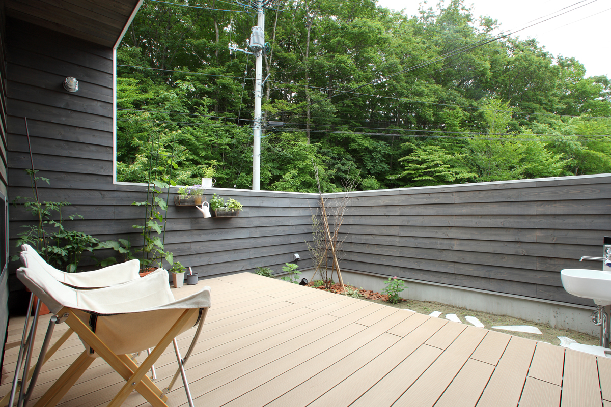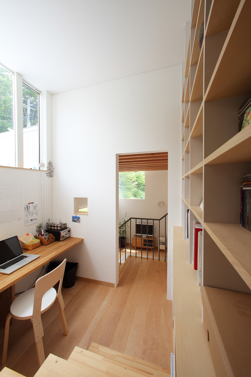 空間の構成は高さの異なる3つの箱が重なり、それぞれに天井高の異なる部屋が折り重なるように配置され、各部屋の独立性を保ちつつも連続性のある空間となり、さらに行き止まりのない回遊性のある平面計画やレベル差を活かした断面計画でコンパクトな室内空間に奥行き感を与える工夫をしています。外壁と一体化した壁で囲まれたデッキテラスの中庭は外部からの視線を遮り、室内とテラス、森や空がひとつに繋がったこの家だけの空間のように味わうことが出来る特別な場所です。セミオープンのご主人の書斎からは大きな窓で切り取られた緑が絵画のように楽しめます。玄関の上には小さな展望テラスがありグレーチングで出来た床からは玄関に光が注ぎます。た、外部倉庫やパントリー、3箇所のウォークインクローゼット、階段下収納等室内外各所にたっぷりの収納空間を用意しました。内装は無垢の質感や樹種本来の色をそのまま活かす自然な仕上がりで、アクセントで配置したオーナーこだわりの色で塗装した壁が柔らかい雰囲気を演出しています。時が経つにつれて味わいのある色味に変化するのもまた楽しみです。