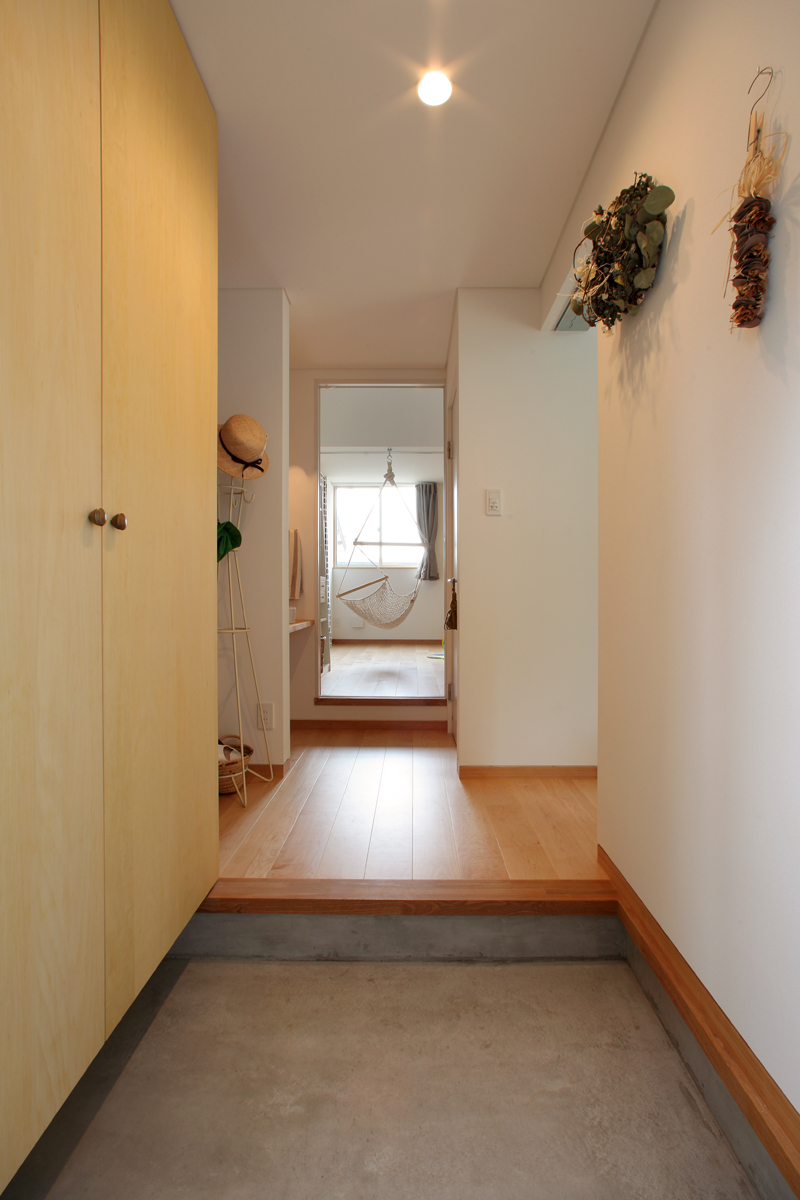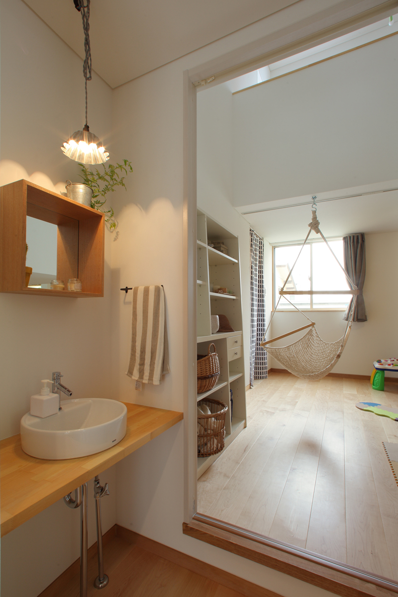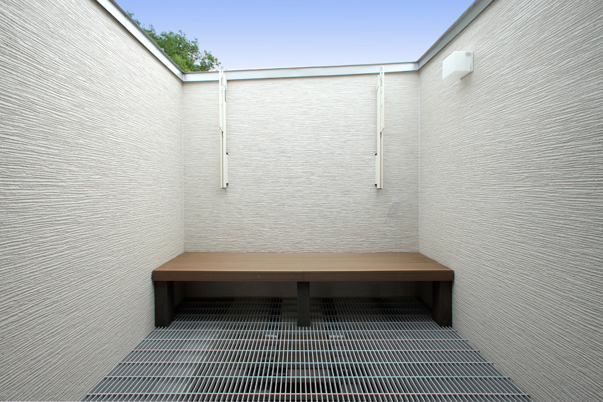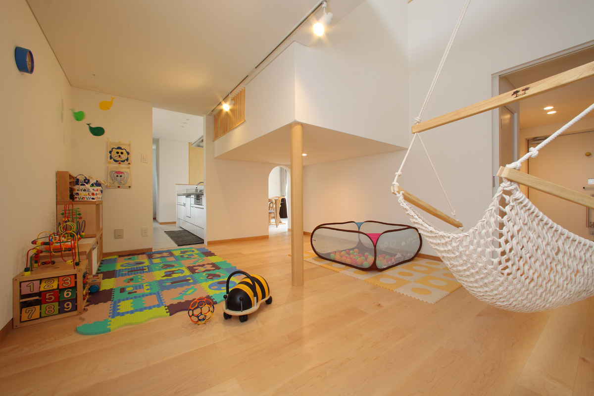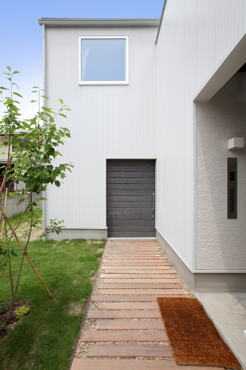 空間の構成は高さの異なる3つの箱が重なり、それぞれに天井高の異なる部屋が折り重なるように配置され、各部屋の独立性を保ちつつも連続性のある空間となり、さらに行き止まりのない回遊性のある平面計画やレベル差を活かした断面計画でコンパクトな室内空間に奥行き感を与える工夫をしています。外壁と一体化した壁で囲まれたデッキテラスの中庭は外部からの視線を遮り、室内とテラス、森や空がひとつに繋がったこの家だけの空間のように味わうことが出来る特別な場所です。セミオープンのご主人の書斎からは大きな窓で切り取られた緑が絵画のように楽しめます。玄関の上には小さな展望テラスがありグレーチングで出来た床からは玄関に光が注ぎます。た、外部倉庫やパントリー、3箇所のウォークインクローゼット、階段下収納等室内外各所にたっぷりの収納空間を用意しました。内装は無垢の質感や樹種本来の色をそのまま活かす自然な仕上がりで、アクセントで配置したオーナーこだわりの色で塗装した壁が柔らかい雰囲気を演出しています。時が経つにつれて味わいのある色味に変化するのもまた楽しみです。