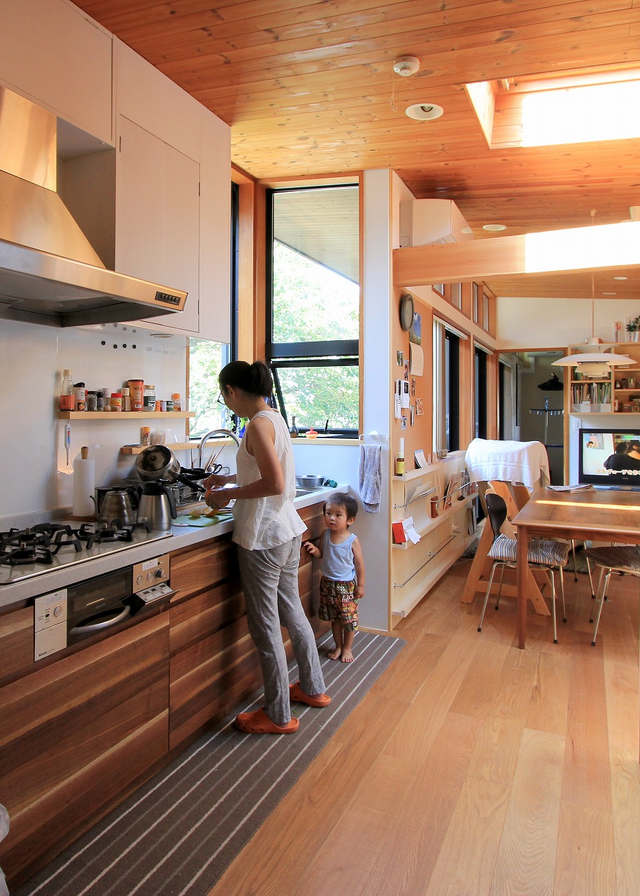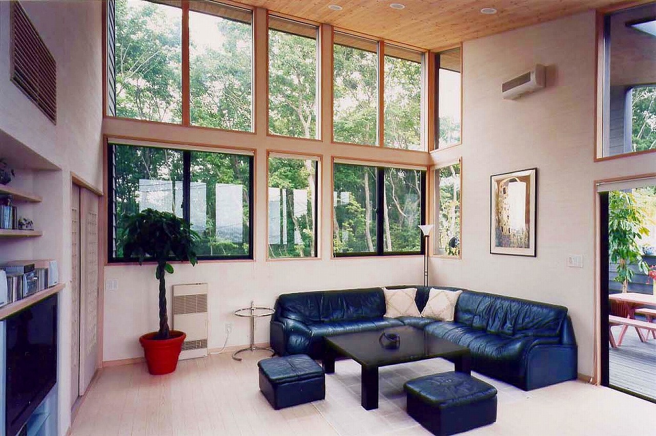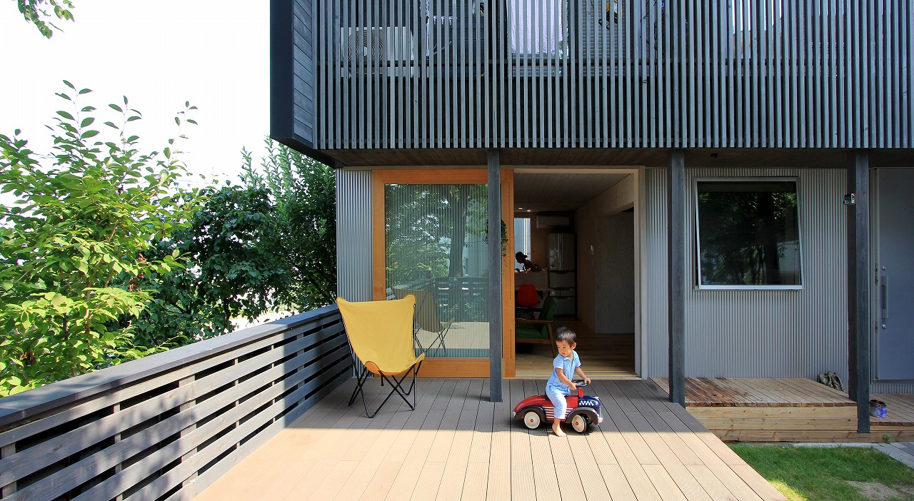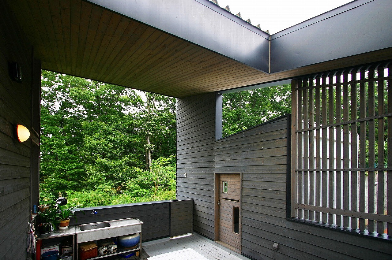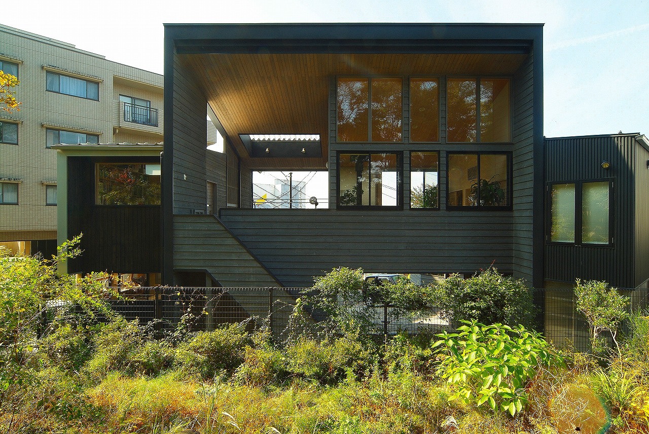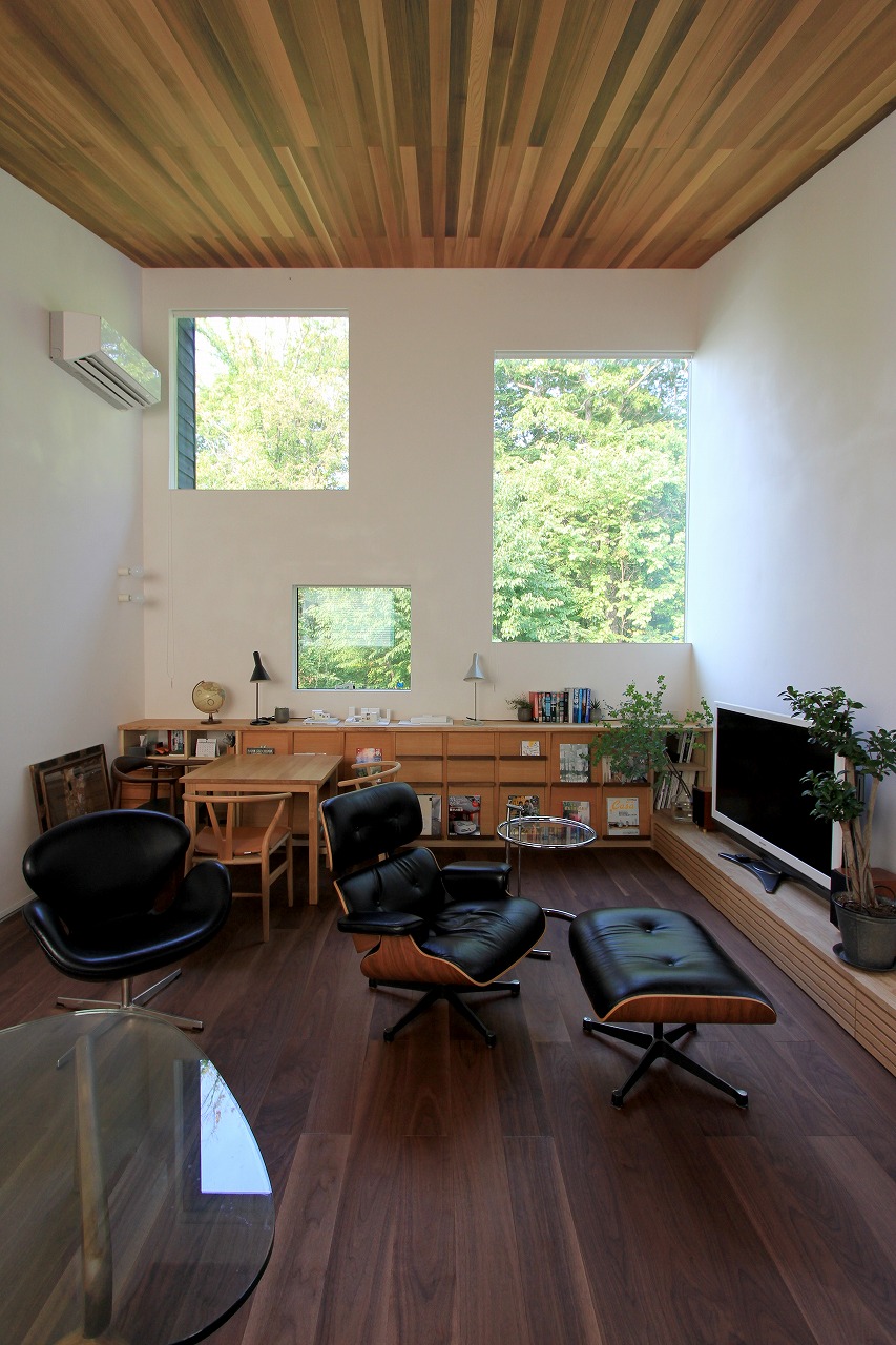 DADA創設者・佐藤忠幸の自邸。天井や壁、床は全て天然素材で仕上げています。天窓や風を通す開口部を随所に配置。外観は緑が映える自然の木肌に近い色としています。森を臨むオープンデッキや豊かな緑が広がる窓など、隣接した公園の自然と一体化するような住宅。