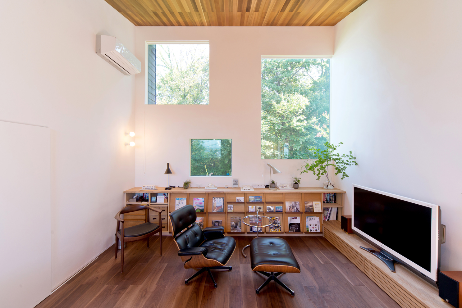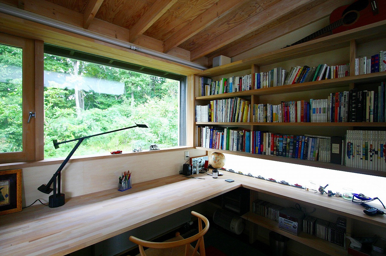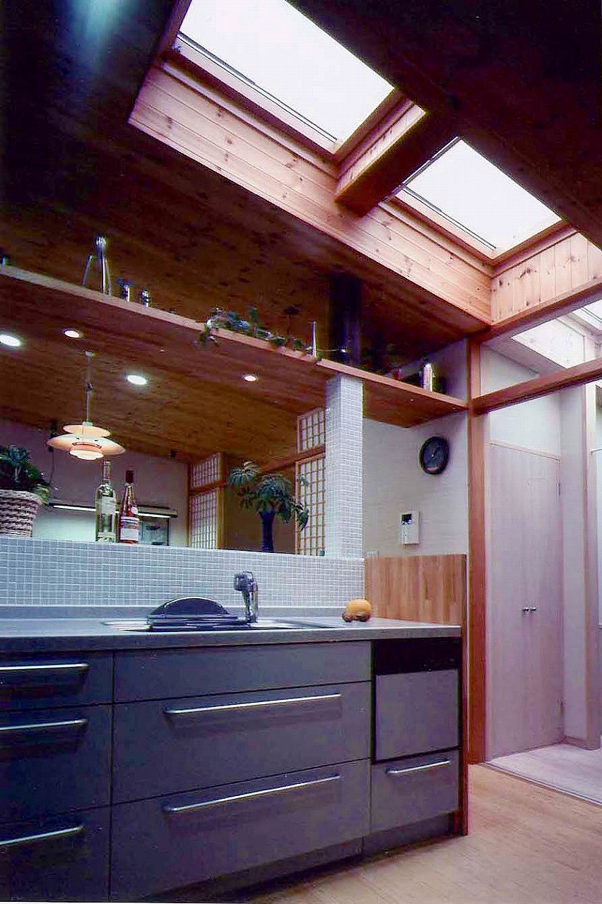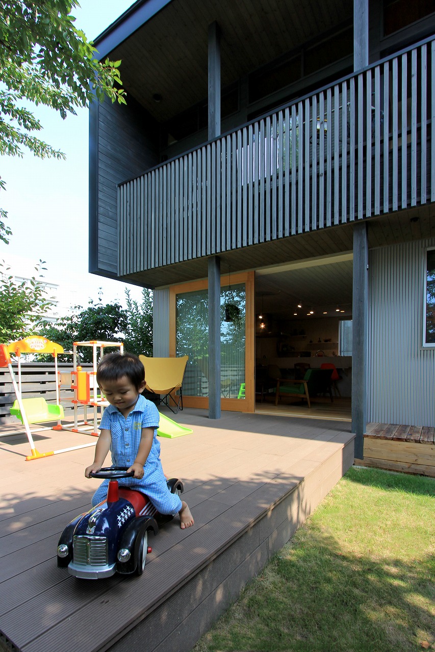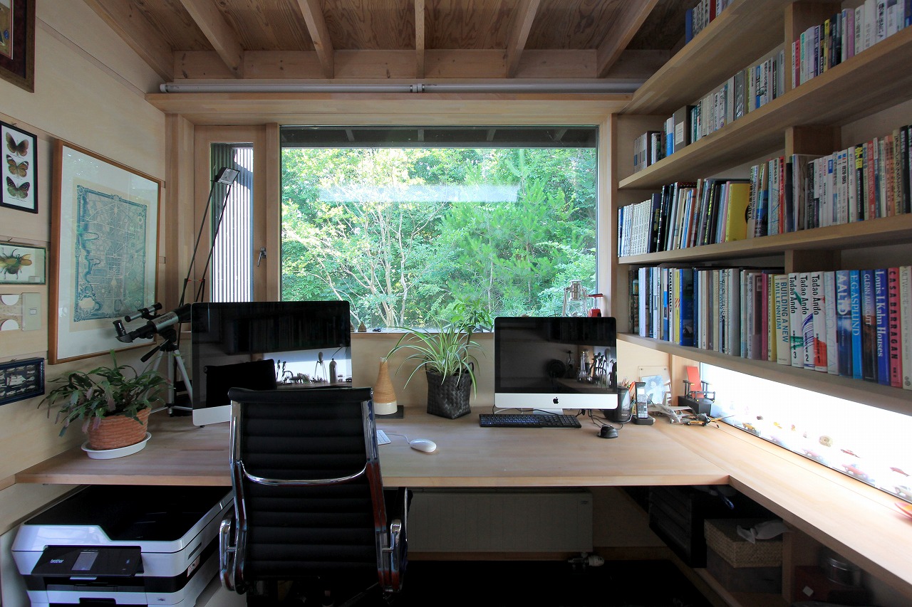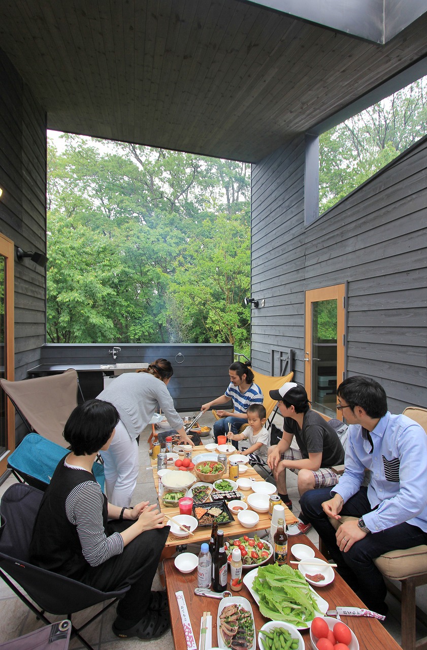 DADA創設者・佐藤忠幸の自邸。天井や壁、床は全て天然素材で仕上げています。天窓や風を通す開口部を随所に配置。外観は緑が映える自然の木肌に近い色としています。森を臨むオープンデッキや豊かな緑が広がる窓など、隣接した公園の自然と一体化するような住宅。