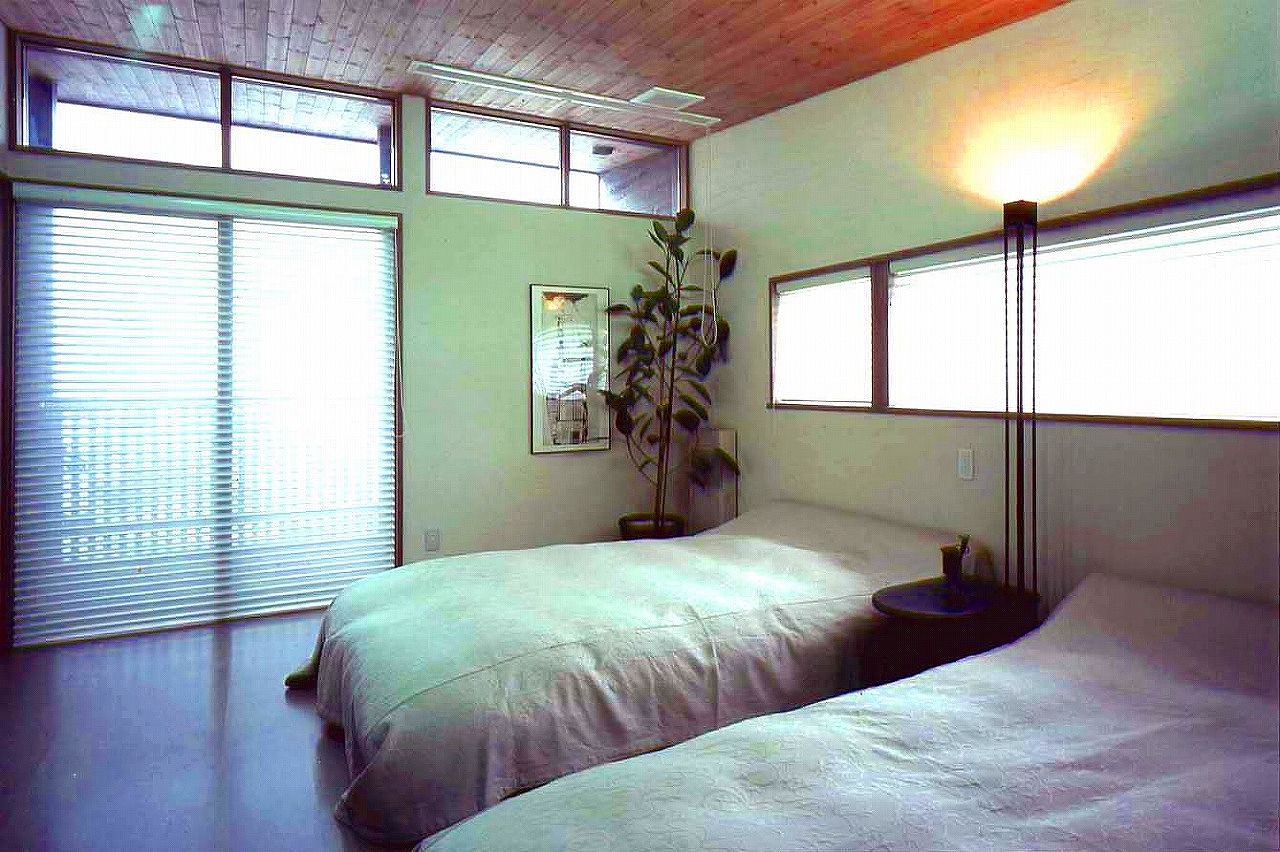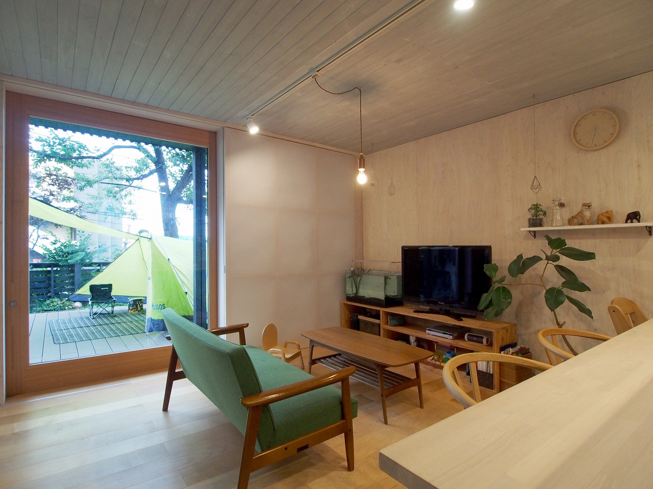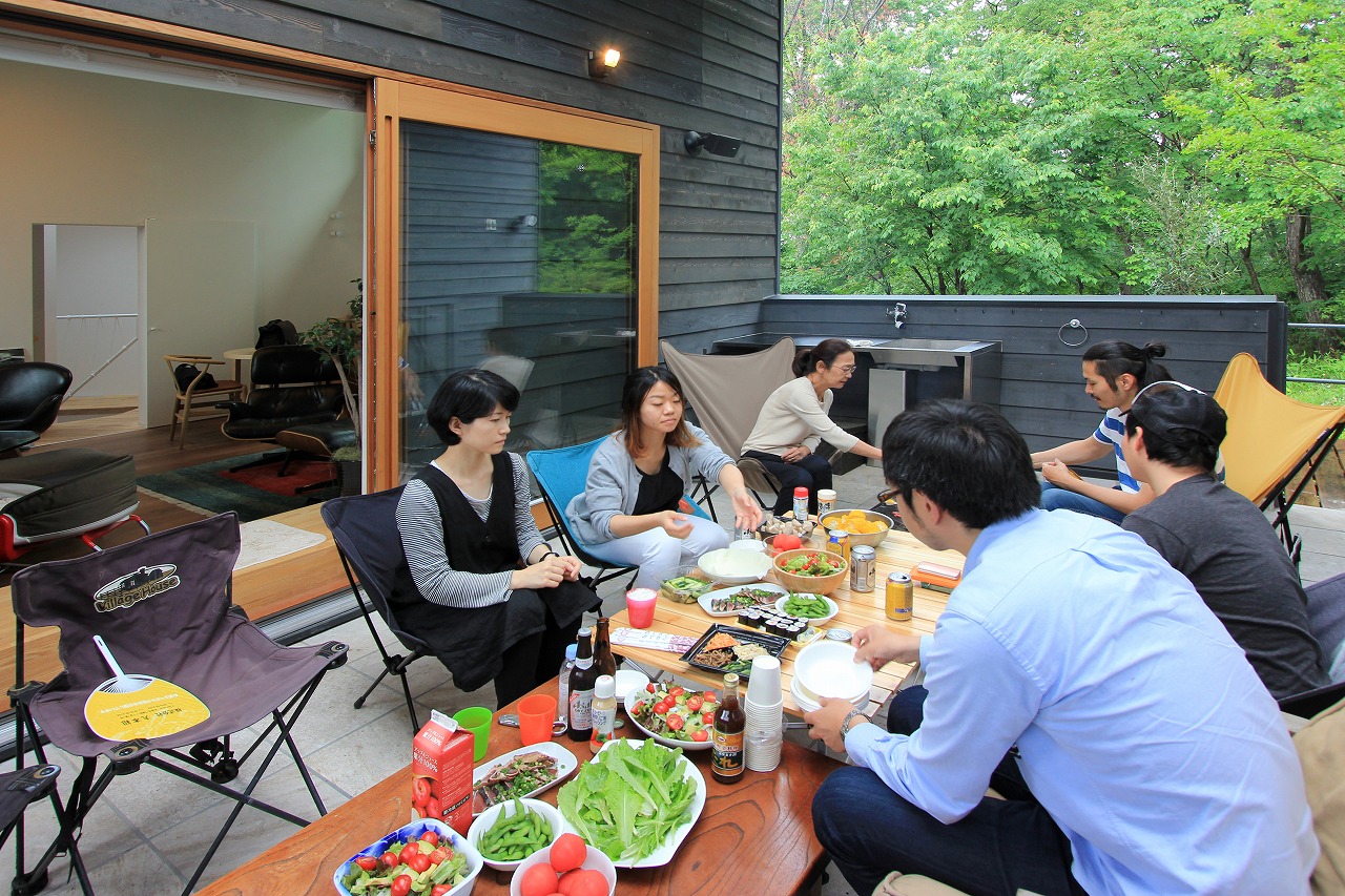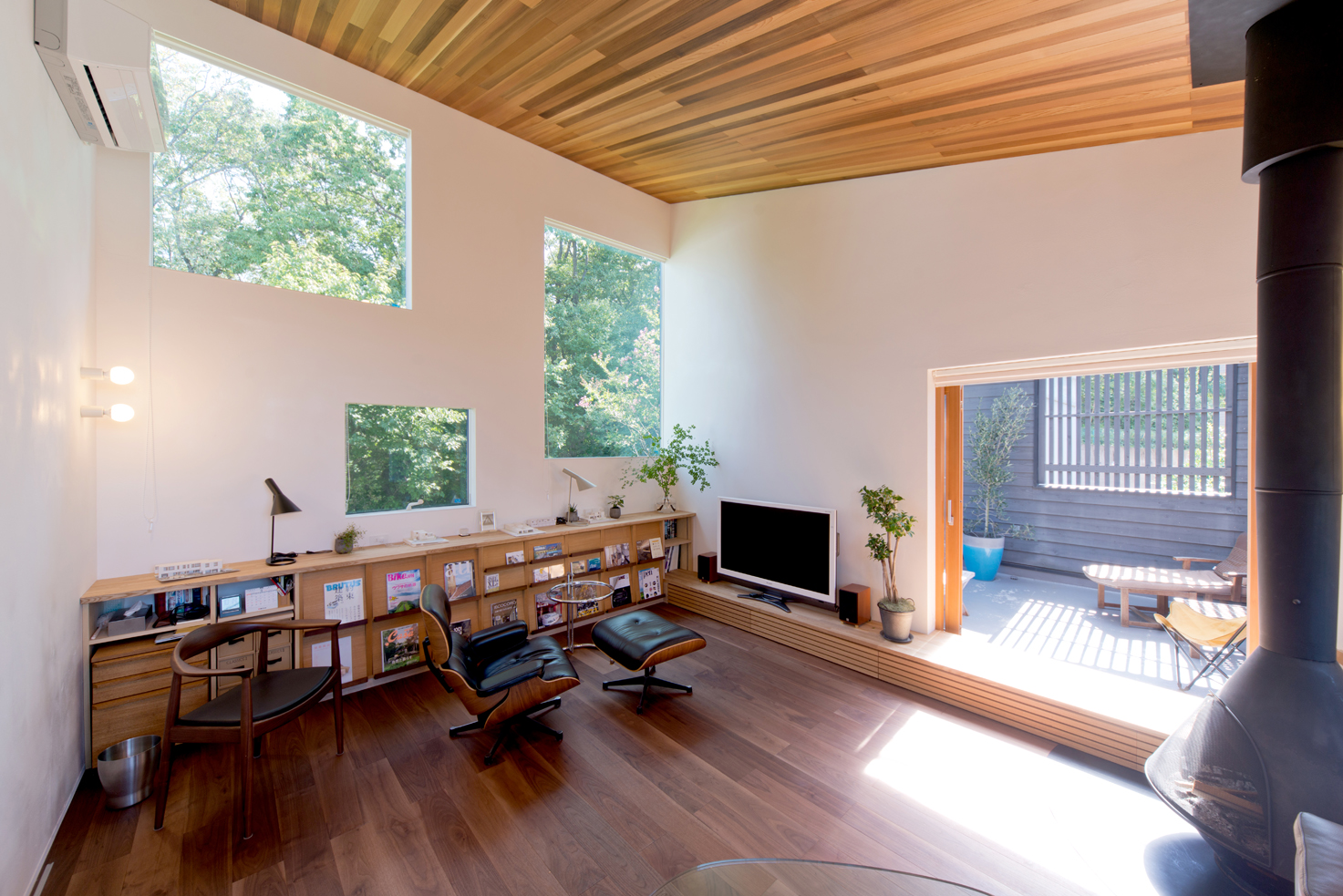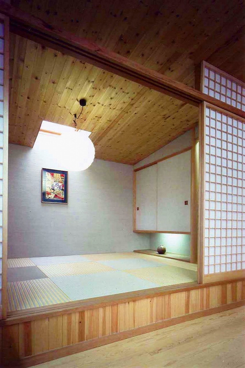DADA創設者・佐藤忠幸の自邸。天井や壁、床は全て天然素材で仕上げています。天窓や風を通す開口部を随所に配置。外観は緑が映える自然の木肌に近い色としています。森を臨むオープンデッキや豊かな緑が広がる窓など、隣接した公園の自然と一体化するような住宅。