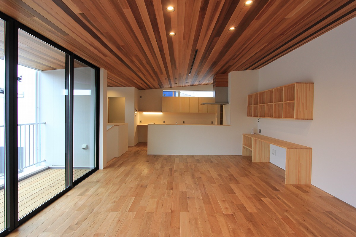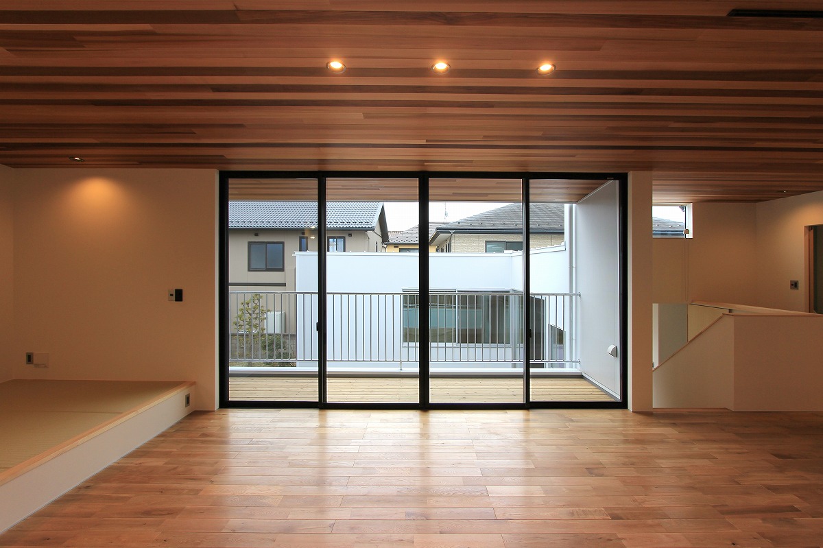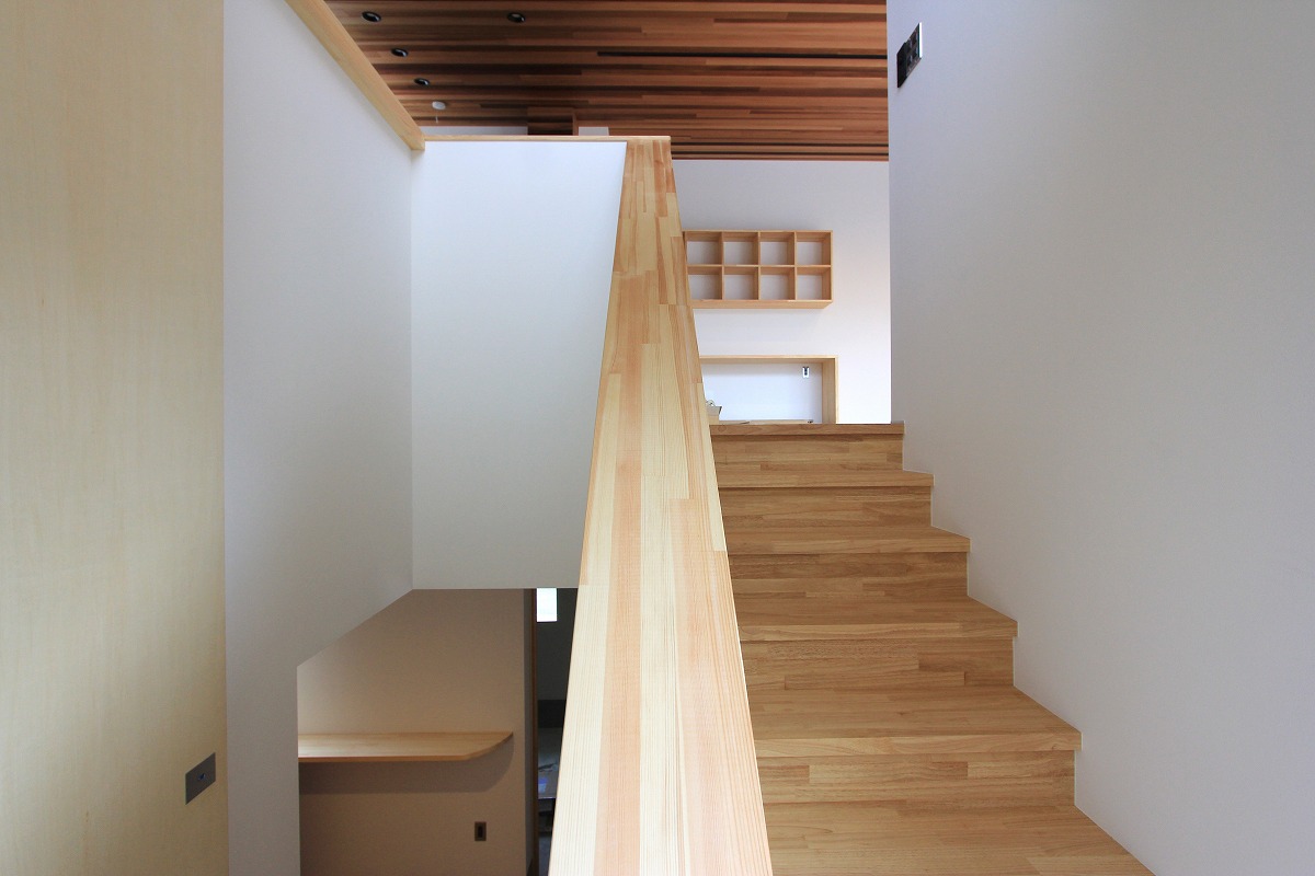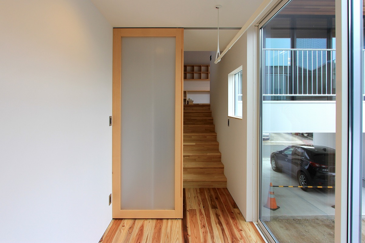 この建物には大きく3つの空間、仕事の空間、プライベートの空間、家族の空間があり、それぞれの空間を段々と繋いでいます。1階に仕事場(DADAの福島分室)としての書斎、少し上がった中二階には水回りと寝室などの個室、さらに少し上がった2階には大きなLDKを配置しました。LDKには中庭をかいして南から採光を確保しつつ周囲の視線をきにしないで生活できるようになっています。