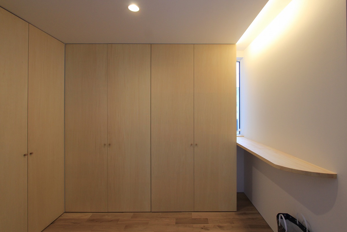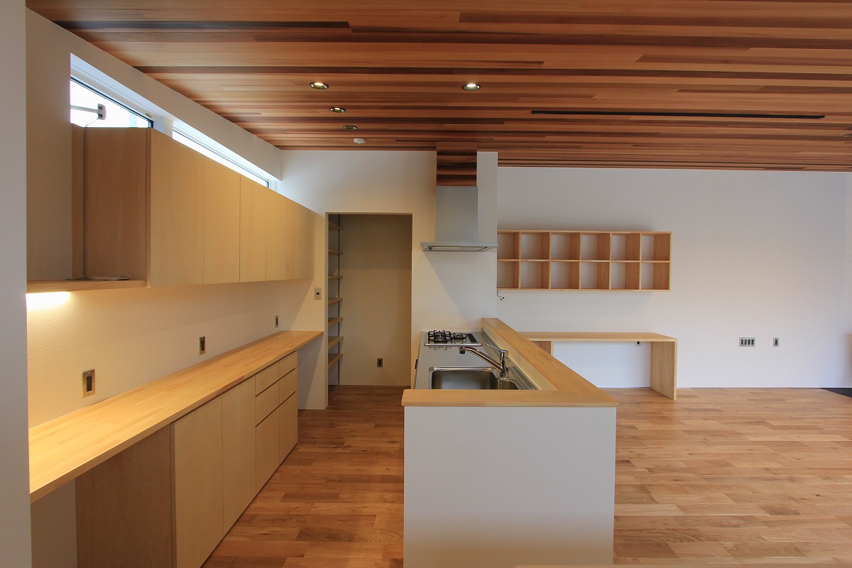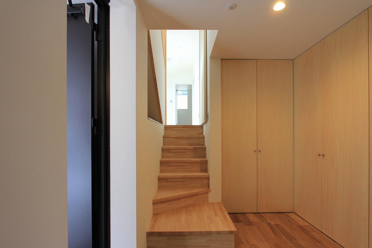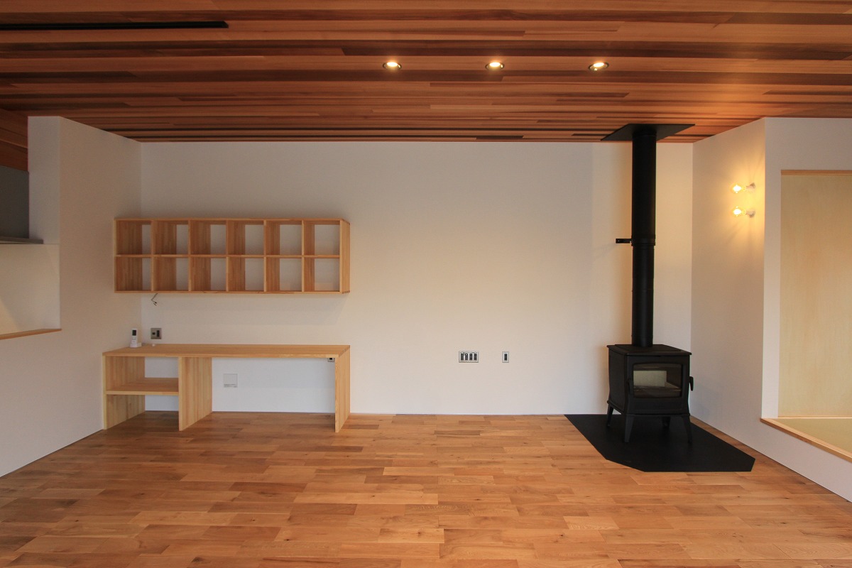 この建物には大きく3つの空間、仕事の空間、プライベートの空間、家族の空間があり、それぞれの空間を段々と繋いでいます。1階に仕事場(DADAの福島分室)としての書斎、少し上がった中二階には水回りと寝室などの個室、さらに少し上がった2階には大きなLDKを配置しました。LDKには中庭をかいして南から採光を確保しつつ周囲の視線をきにしないで生活できるようになっています。