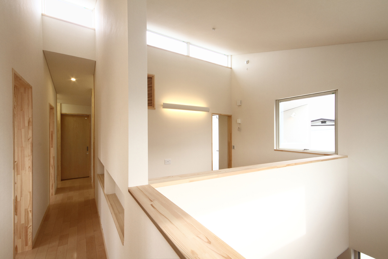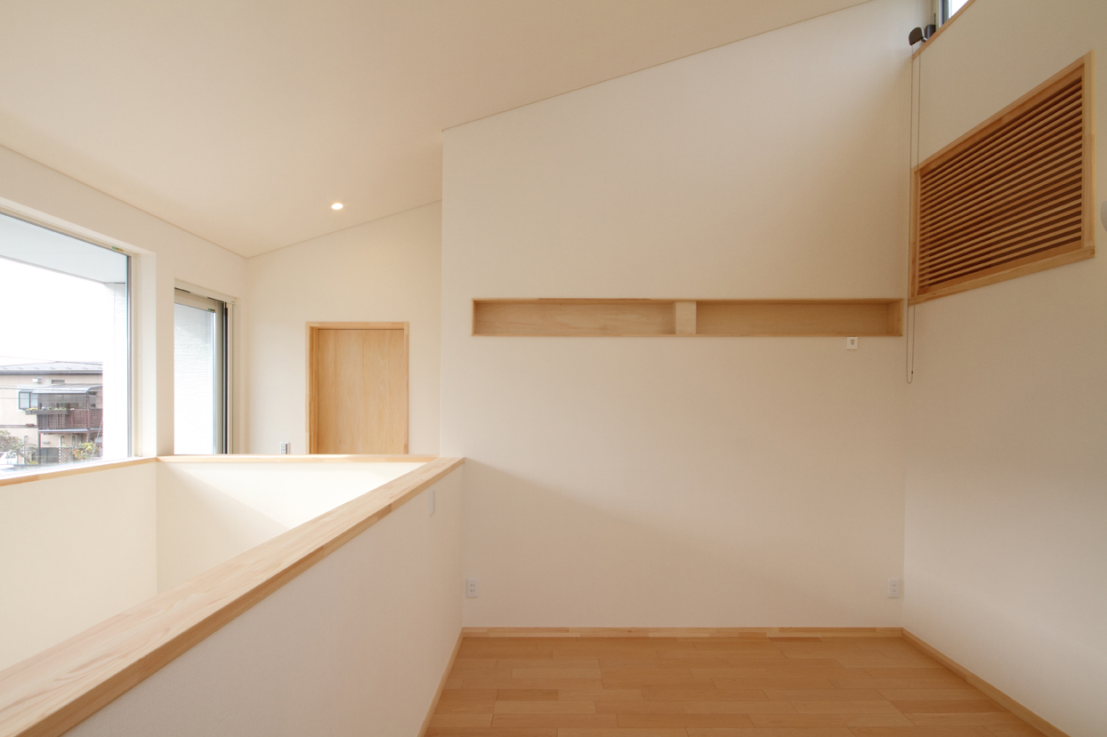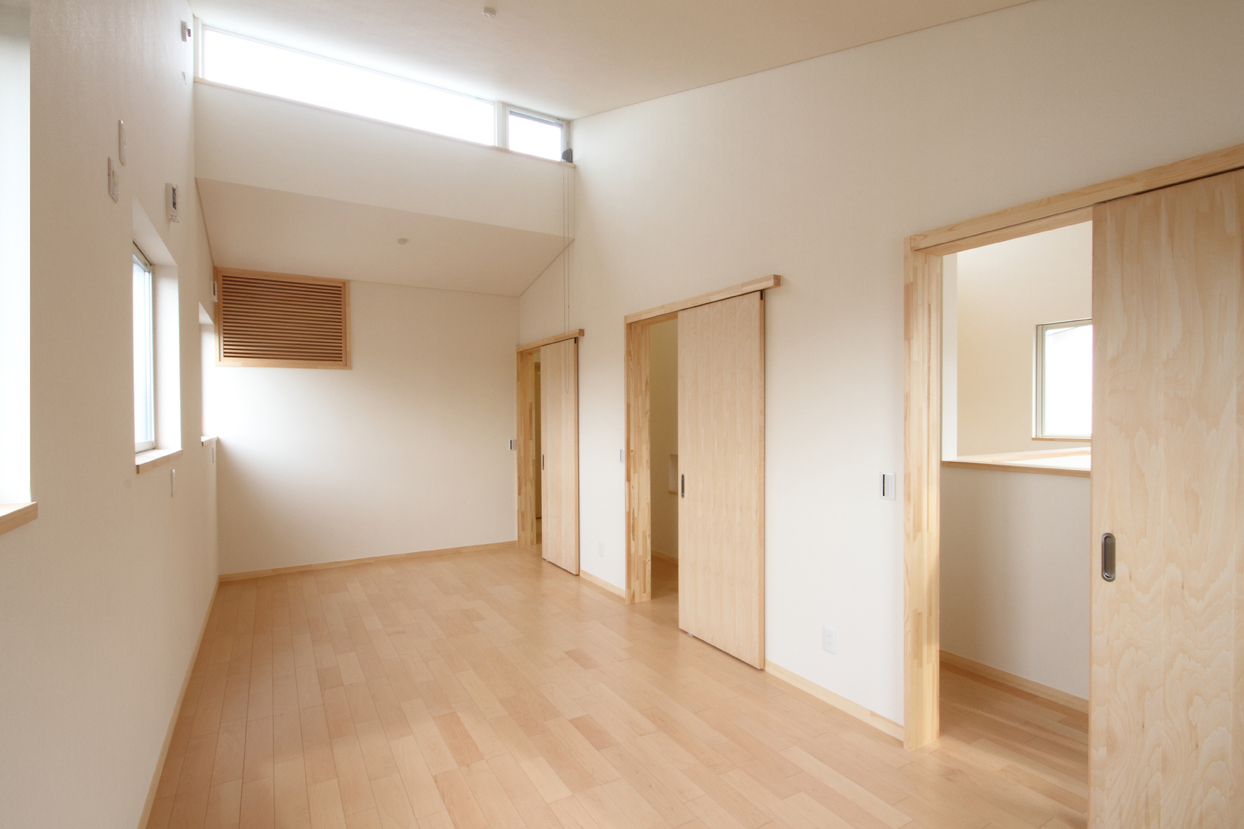 家族の集う明るく開放的なLDKと、施主の要望であった音楽室を1階に配置し、それらを水周りや収納空間を中心に回遊性のある動線で繋いでいます。来客時の裏動線や家事動線にも考慮しています。寝室と3人分の子供部屋は2階に配置し、夫婦とまだ小さいお子さんとの生活空間は吹き抜けで繋いだオープンな空間としています。家族の気配を感じることが出来る空間構成を意識しました。