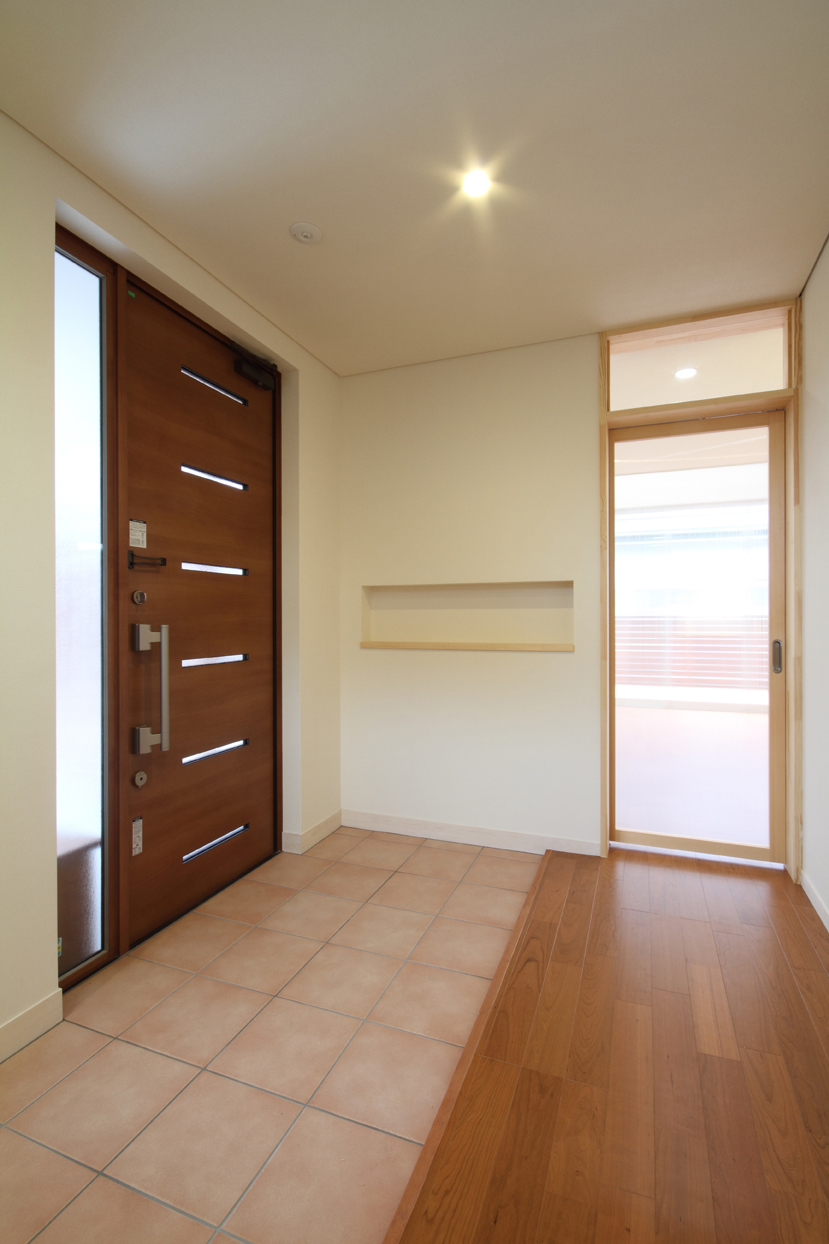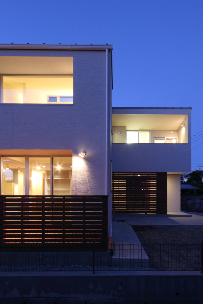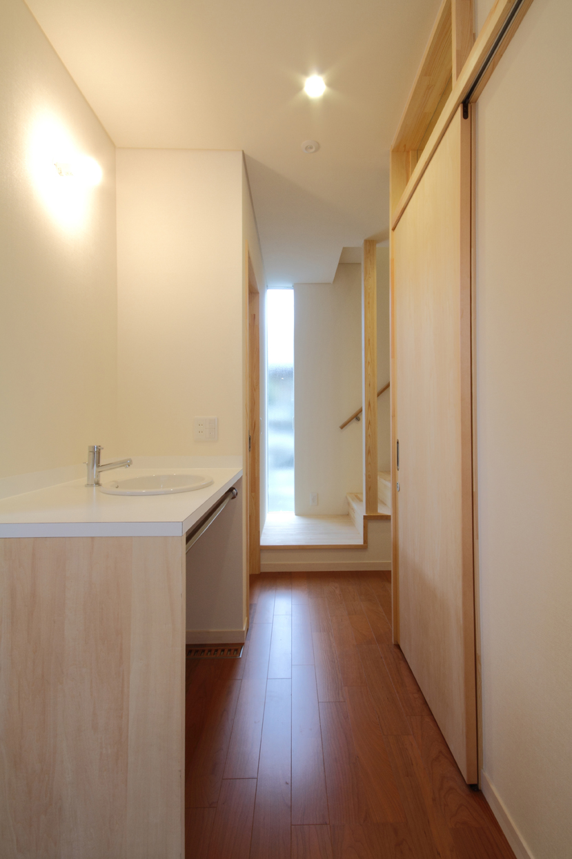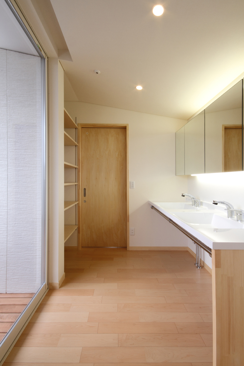 家族の集う明るく開放的なLDKと、施主の要望であった音楽室を1階に配置し、それらを水周りや収納空間を中心に回遊性のある動線で繋いでいます。来客時の裏動線や家事動線にも考慮しています。寝室と3人分の子供部屋は2階に配置し、夫婦とまだ小さいお子さんとの生活空間は吹き抜けで繋いだオープンな空間としています。家族の気配を感じることが出来る空間構成を意識しました。