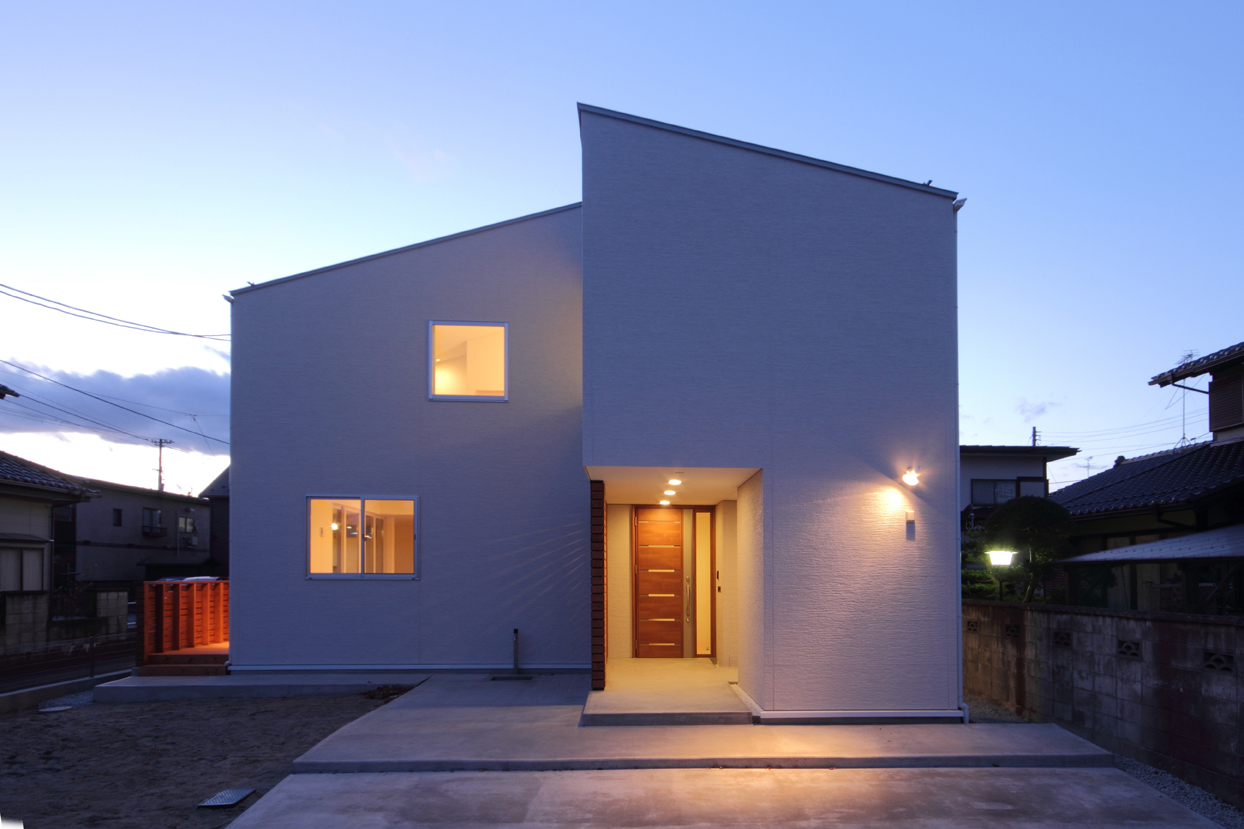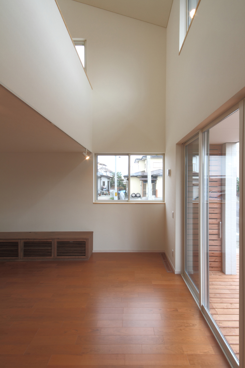 南側に成るべく有効な外部空間を確保するために北側に寄せた配置としていますが、北側斜線が厳しい地域であったため斜線を避けるような変形型の切妻屋根の形態を採用しています。切妻屋根の棟部分を上下にずらし開口部を設けることで、通風と日照を確保しています。