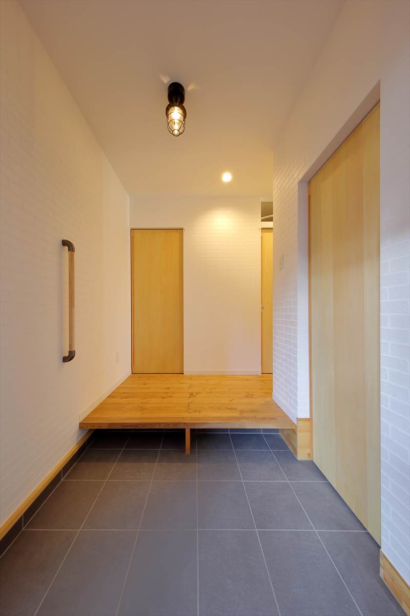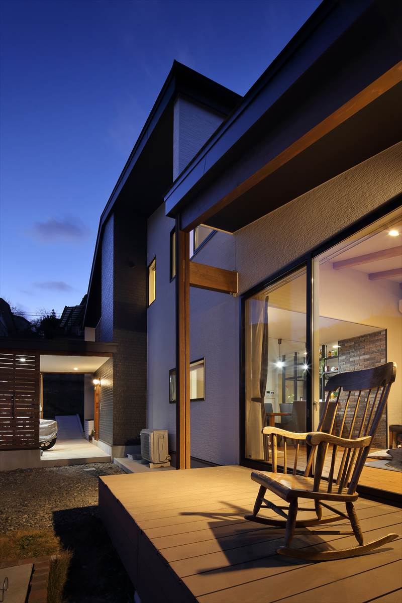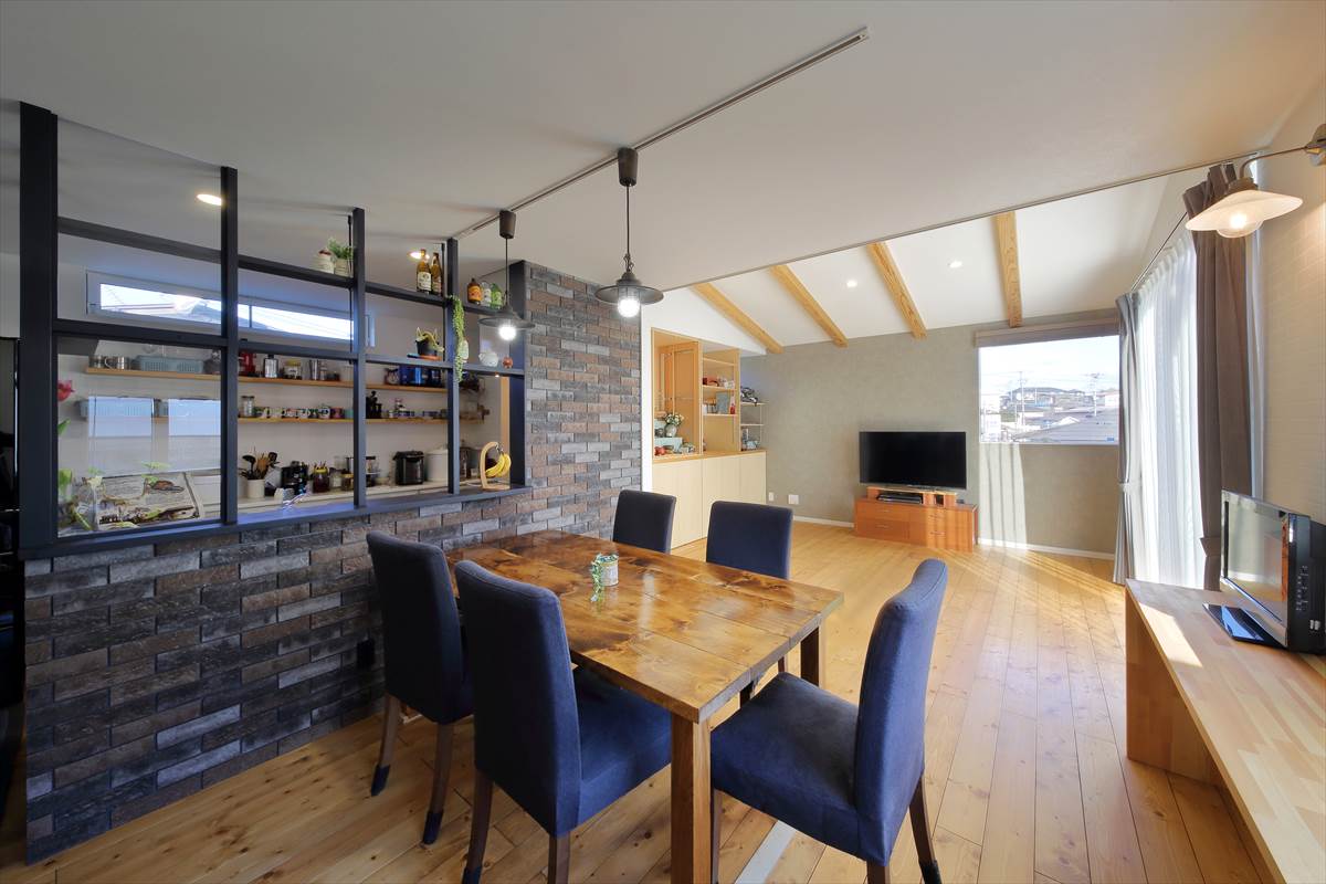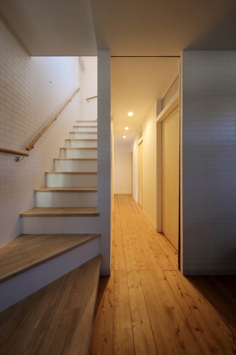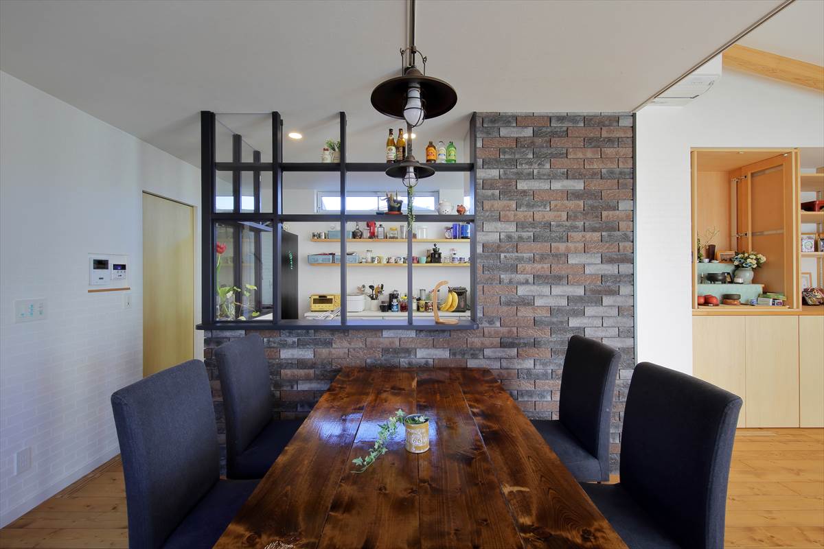 2世帯住宅への建替え計画です。道路と高低差のある敷地で、2世帯の家族の住まいのほかに、将来車の乗り入れが可能になった場合の駐車スペースの確保や、ピアノ教室など外部の人々を招き入れるスペースが求められました。それぞれのスペースとの距離感や動線計画をどうデザインするかが重要な課題でした。親世帯の占有スペースは気兼ねなくピアノを楽しめるよう、メインの居場所から離れた場所に設けました。子世帯との間に共用の玄関や水周りを配置し、お互いのプライバシーを確保しながらエントランス空間をコンパクトにまとめています。仕上げには輸入クロスやレンガタイル、モールガラスなどを用いてお客様がお好きな海外インテリアのテイストとしました。