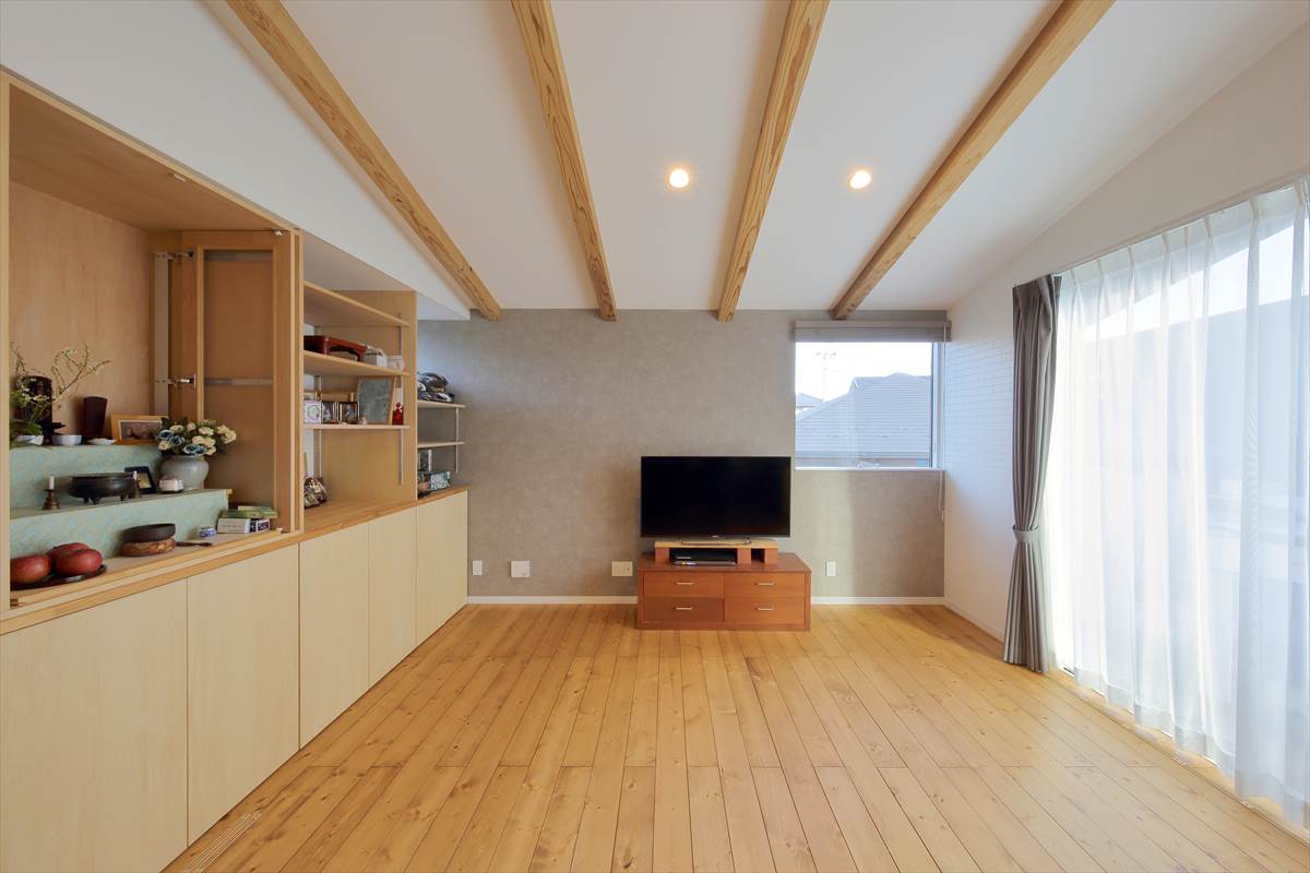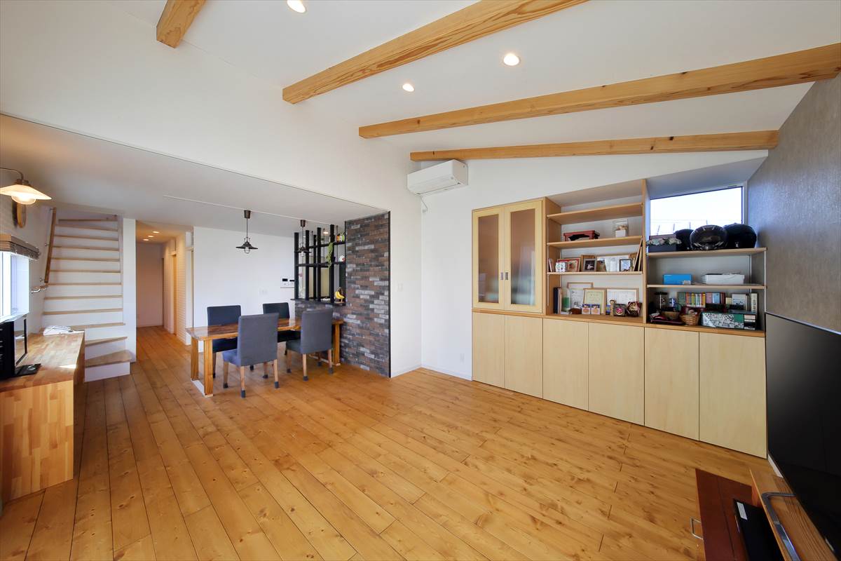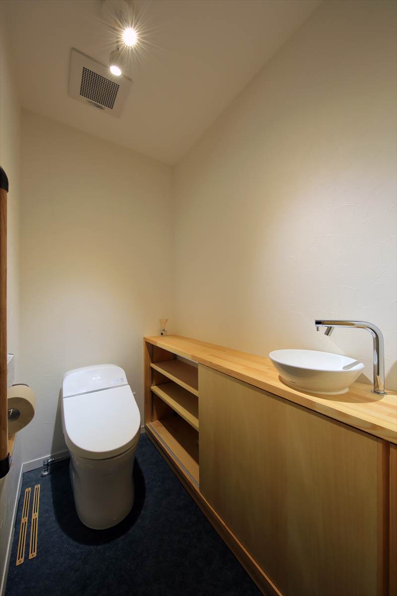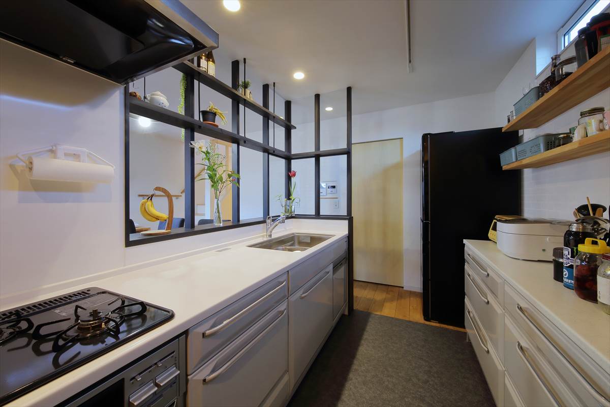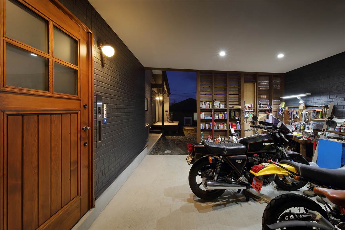 2世帯住宅への建替え計画です。道路と高低差のある敷地で、2世帯の家族の住まいのほかに、将来車の乗り入れが可能になった場合の駐車スペースの確保や、ピアノ教室など外部の人々を招き入れるスペースが求められました。それぞれのスペースとの距離感や動線計画をどうデザインするかが重要な課題でした。親世帯の占有スペースは気兼ねなくピアノを楽しめるよう、メインの居場所から離れた場所に設けました。子世帯との間に共用の玄関や水周りを配置し、お互いのプライバシーを確保しながらエントランス空間をコンパクトにまとめています。仕上げには輸入クロスやレンガタイル、モールガラスなどを用いてお客様がお好きな海外インテリアのテイストとしました。