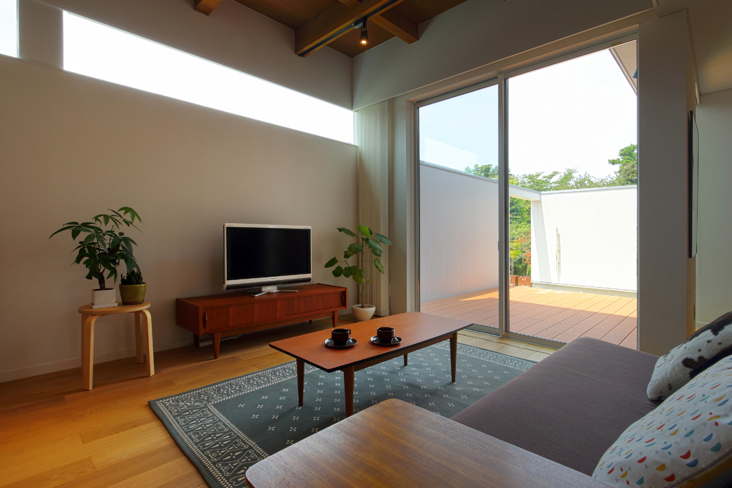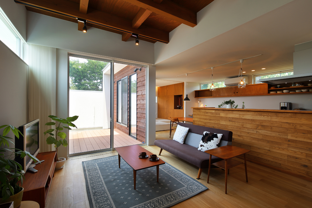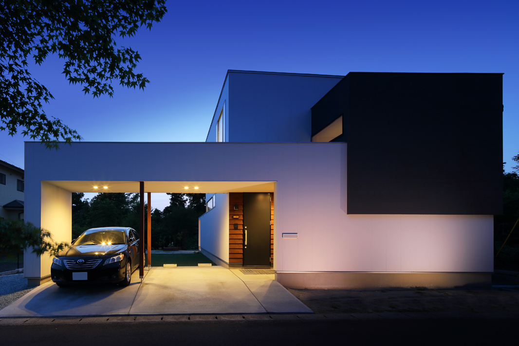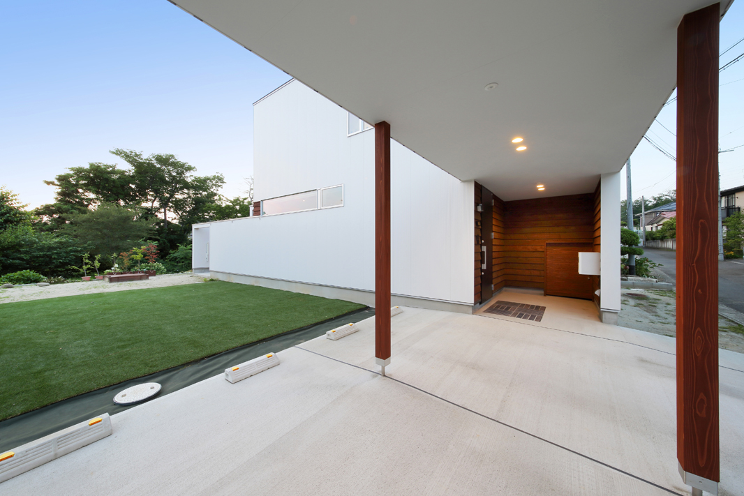 ポーチを兼ねた自動車2台分の差し掛けが家全体のゲートとなり、庭への期待感と道路と敷地の間の緩衝材の役割も果たします。敷地の外周に高い塀を設けずに室内が快適になるよう開口部位置を工夫し、景色のよい北側の風景を取り込む計画としました。広く残した南側の庭では家庭菜園を行ったり、外壁に取り付けたフックからタープを張ることで活用の幅が広がります。