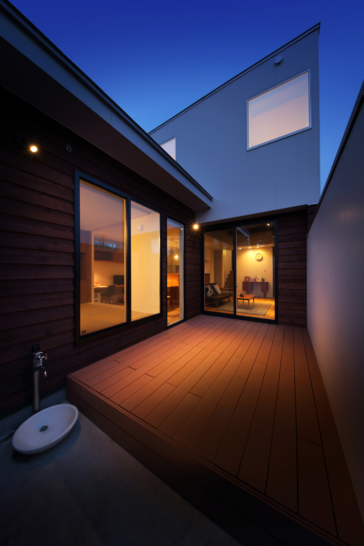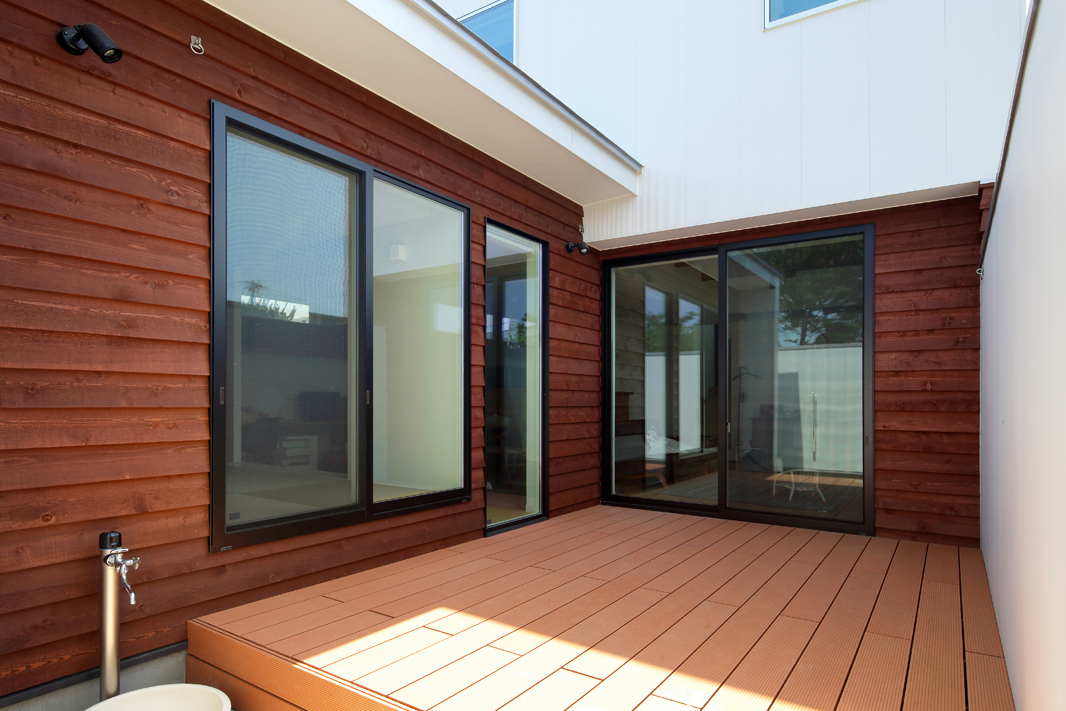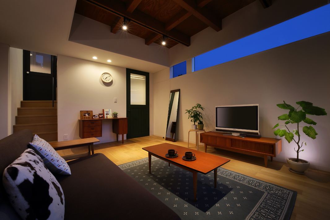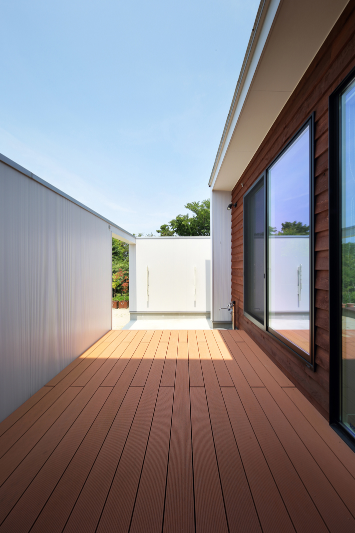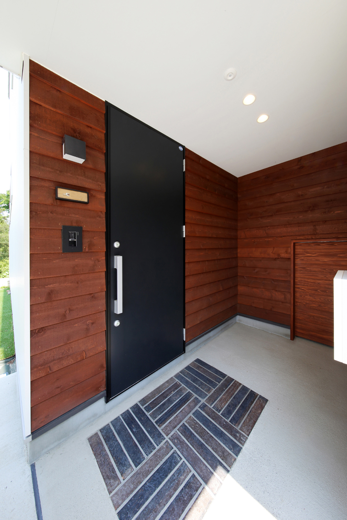 ポーチを兼ねた自動車2台分の差し掛けが家全体のゲートとなり、庭への期待感と道路と敷地の間の緩衝材の役割も果たします。敷地の外周に高い塀を設けずに室内が快適になるよう開口部位置を工夫し、景色のよい北側の風景を取り込む計画としました。広く残した南側の庭では家庭菜園を行ったり、外壁に取り付けたフックからタープを張ることで活用の幅が広がります。