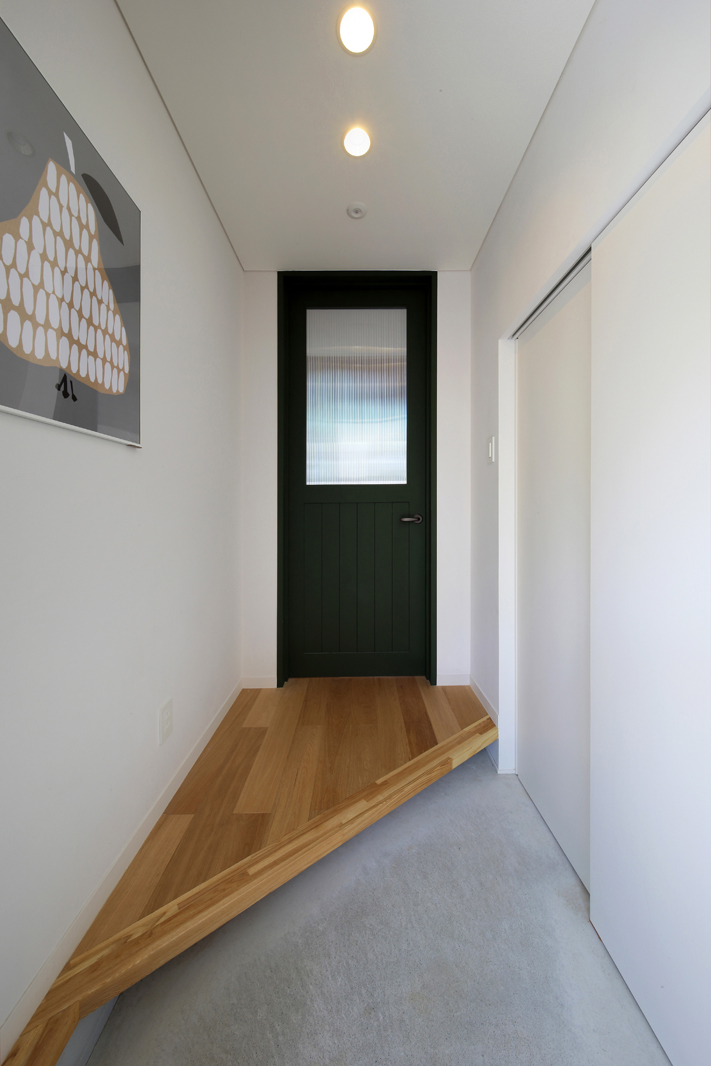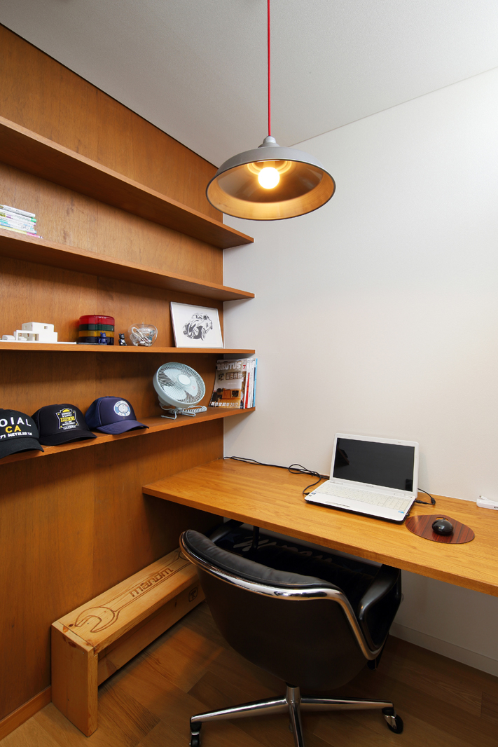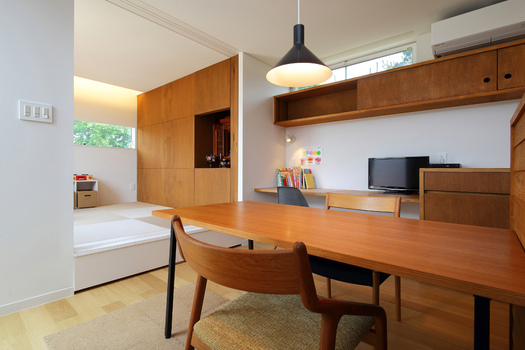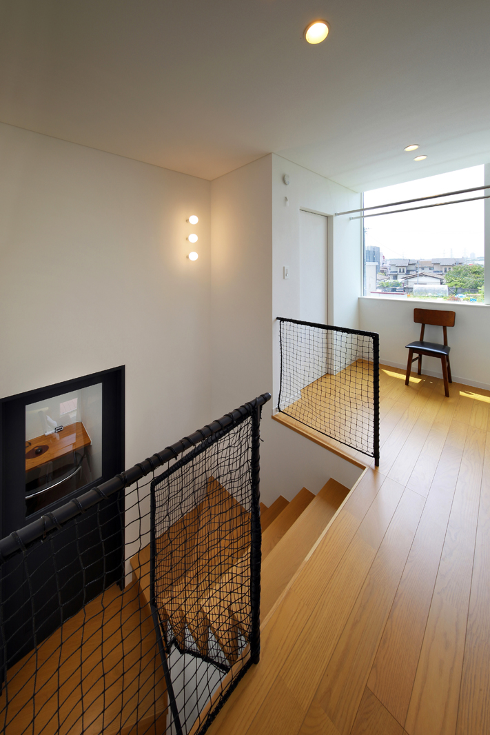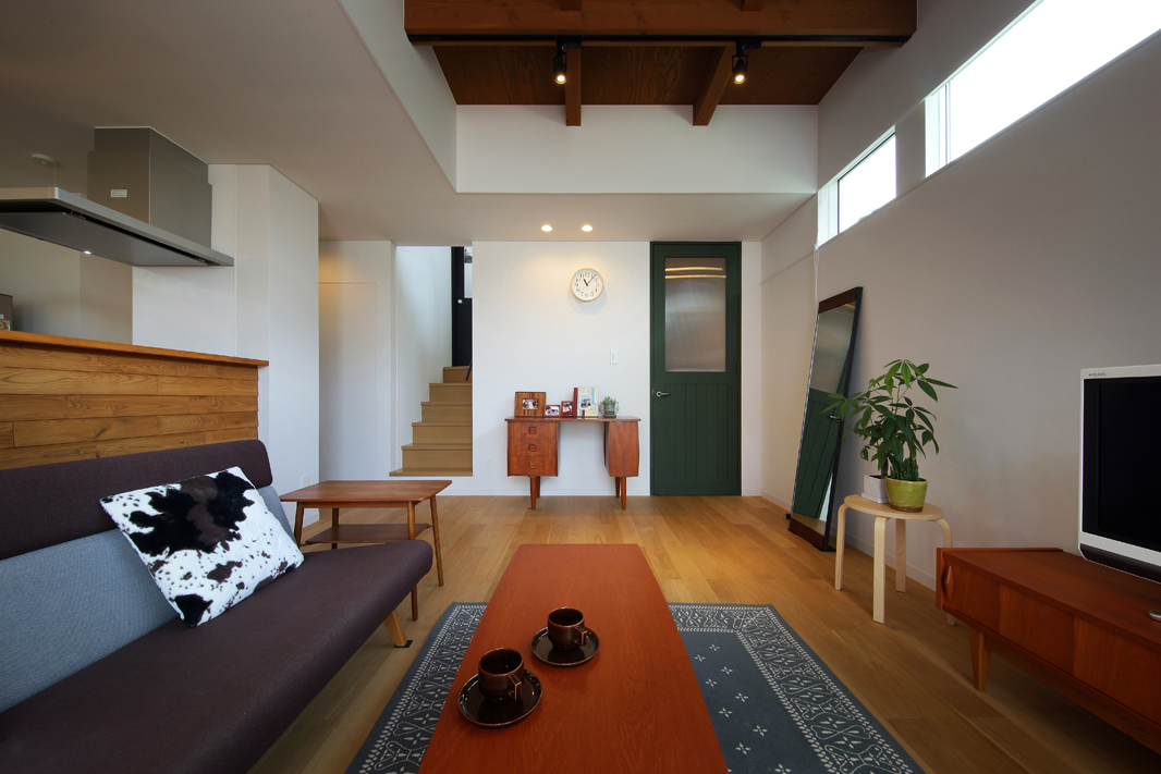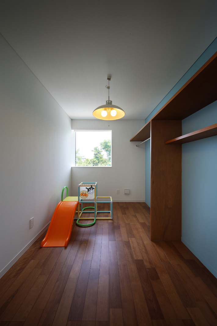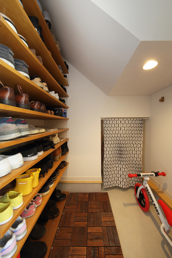 室内空間は必要最低限のボリュームとしながらも、天井高の工夫やコートテラスとのつながりでリビングスペースに広がりを持たせています。家事動線も極力シンプルに計画。日当たりがよく、外から見えづらい位置に物干しスペースを確保し、各所に収納空間を確保するなど、すっきりと暮らせる工夫もたくさん盛り込みました。お客様自ら塗装した子供部屋の壁、オリジナルの木の表札、ドアノブ、フック等々オーナーのこだわりが随所に散りばめられています。