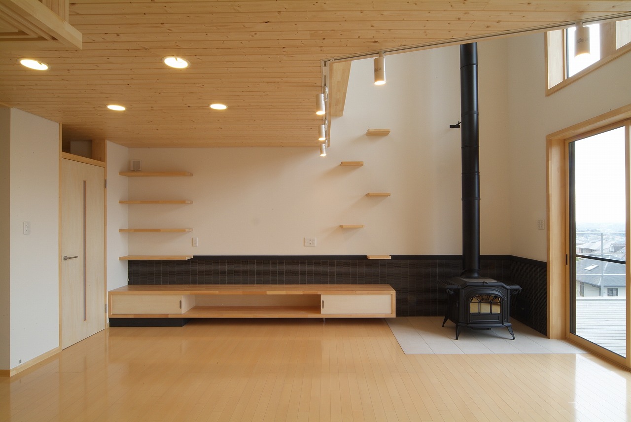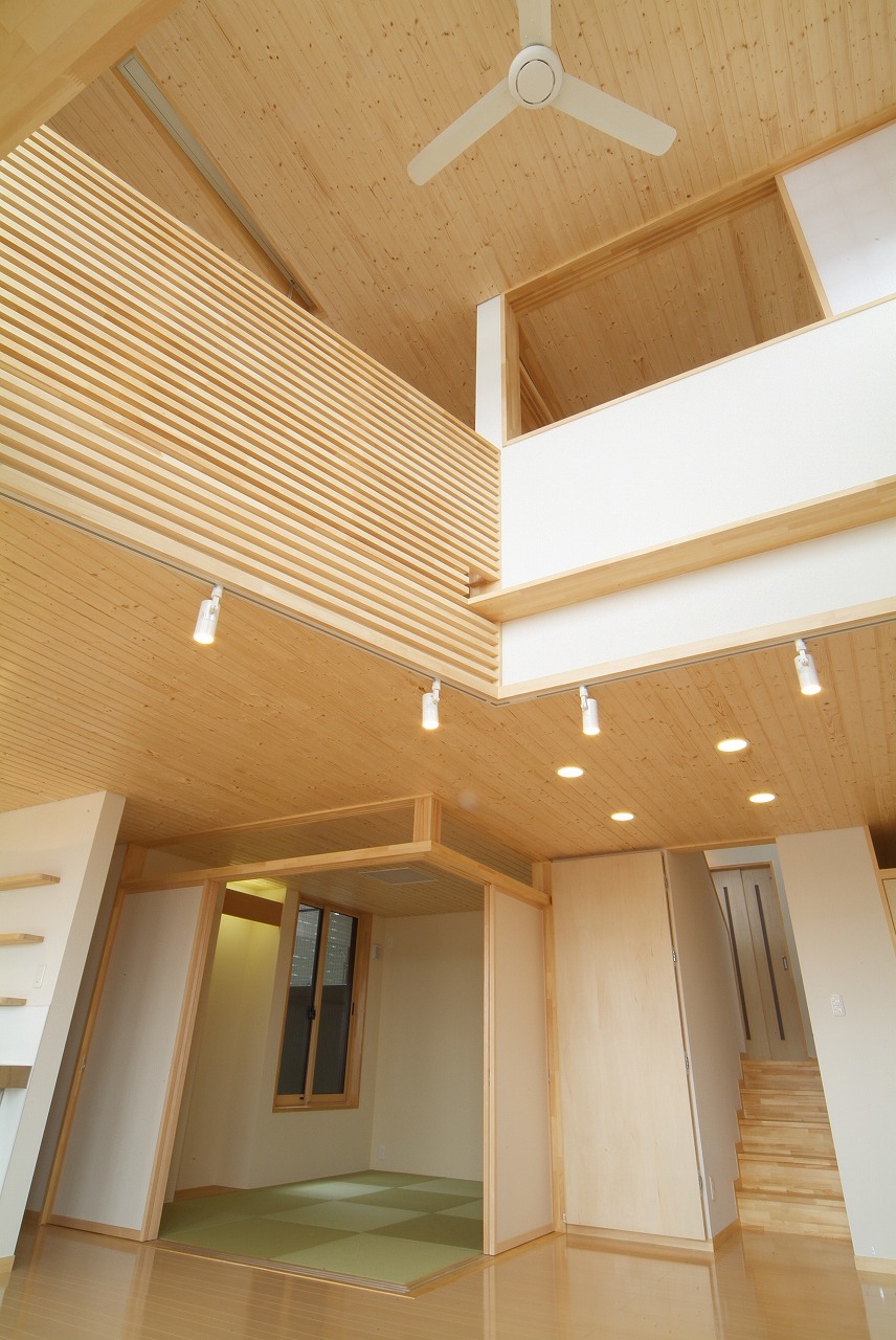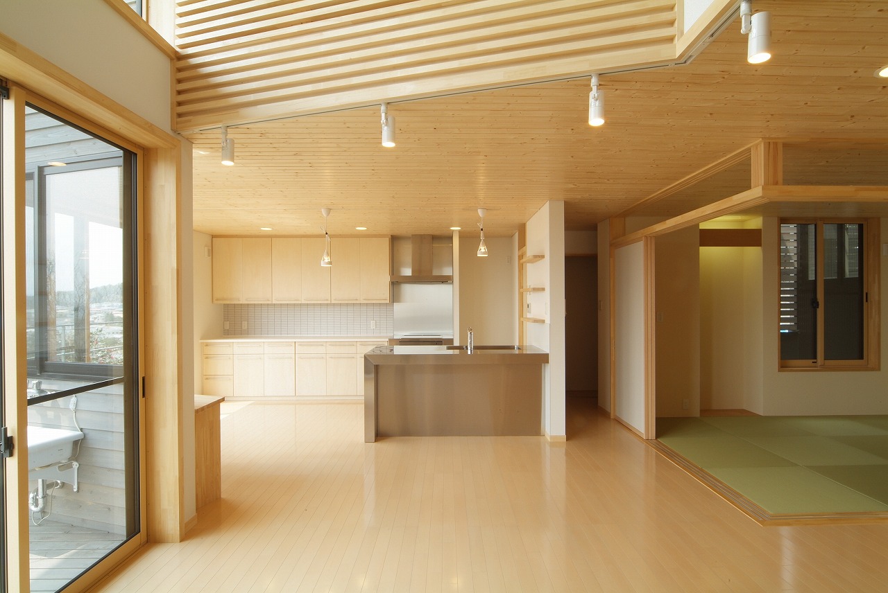 本計画ではこの眺望をいかした室内空間を敷地の傾斜に添って床レベルを設定したスキップフロアの構成となっている。道路側は平屋のシンプルなが低く延びたポーチがこの風景を切り取る額縁となっている。南側は大きな庇をはりだし、この下に眺望を楽しむ空間がガラスとやわらかい木貼りの壁で包まれる構成とし、内部の吹き抜け空間と呼応する開放的なテラスリビングが広がっている。内部には明るい吹き抜けが外部とつながる空間となっているが、天井や壁面の一部に自然木を使用するなど、伸びやかながら落ち着きと温かみのある空間としている。また、動物好きな家族の一員であるカメや熱帯魚のコーナー、猫の入り口やキャットウォークがもうけられた。また、浴室や和室は落ち着いた坪庭に面しプライバシーを守りながら開放感を味わうことができる。