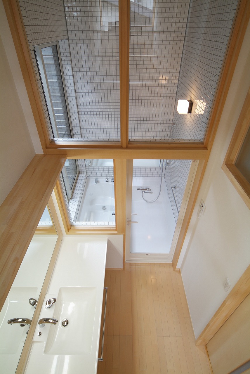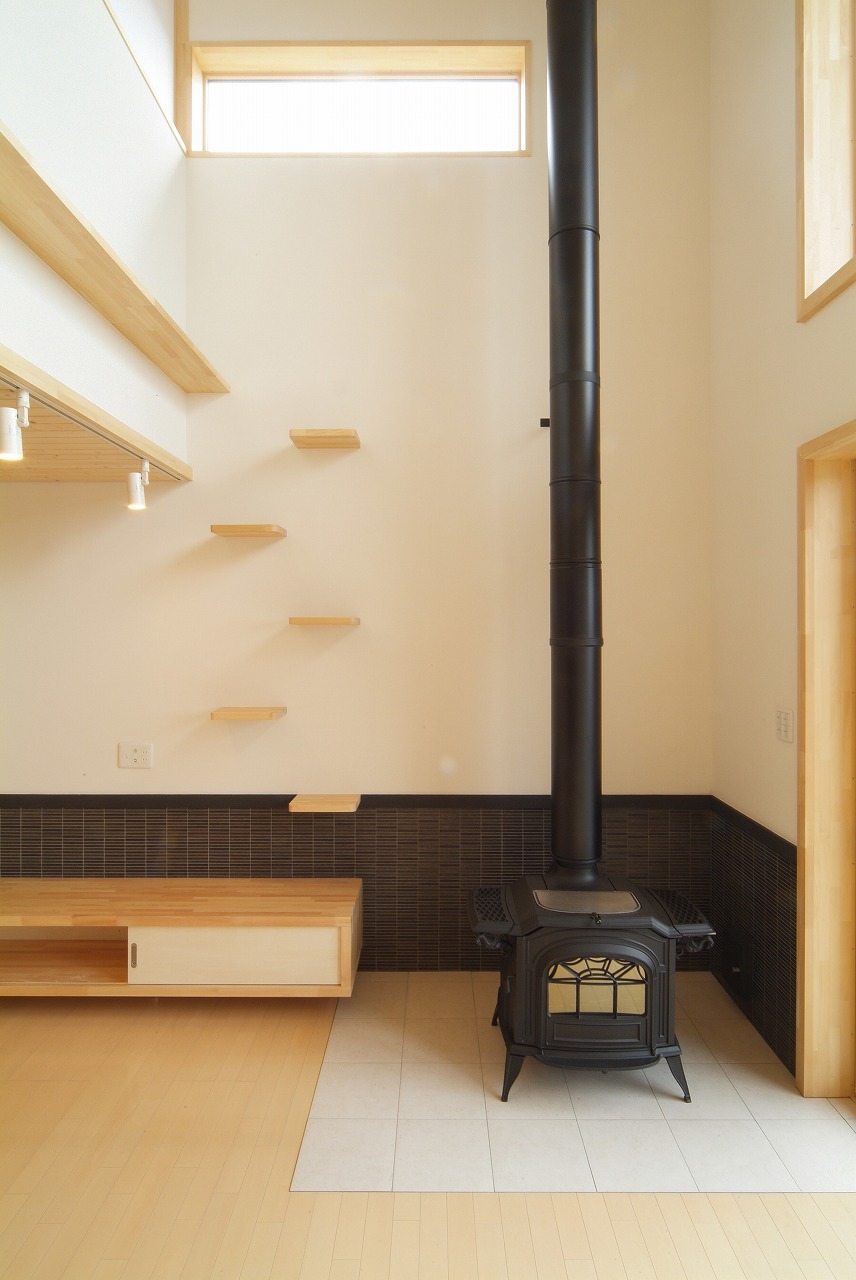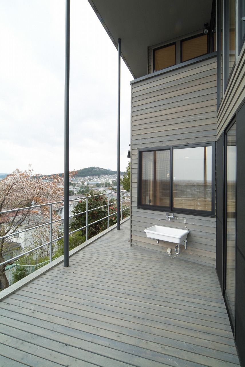 本計画ではこの眺望をいかした室内空間を敷地の傾斜に添って床レベルを設定したスキップフロアの構成となっている。道路側は平屋のシンプルなが低く延びたポーチがこの風景を切り取る額縁となっている。南側は大きな庇をはりだし、この下に眺望を楽しむ空間がガラスとやわらかい木貼りの壁で包まれる構成とし、内部の吹き抜け空間と呼応する開放的なテラスリビングが広がっている。内部には明るい吹き抜けが外部とつながる空間となっているが、天井や壁面の一部に自然木を使用するなど、伸びやかながら落ち着きと温かみのある空間としている。また、動物好きな家族の一員であるカメや熱帯魚のコーナー、猫の入り口やキャットウォークがもうけられた。また、浴室や和室は落ち着いた坪庭に面しプライバシーを守りながら開放感を味わうことができる。