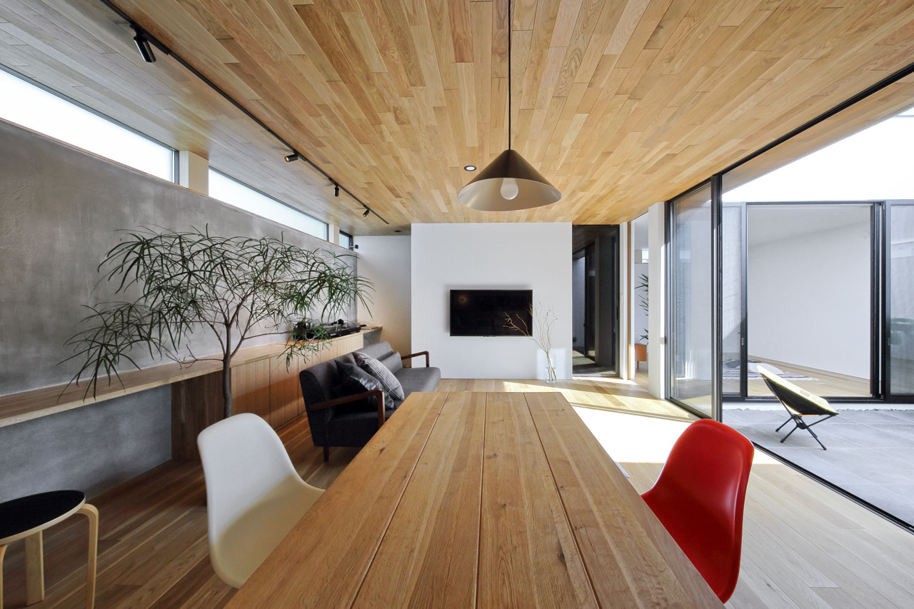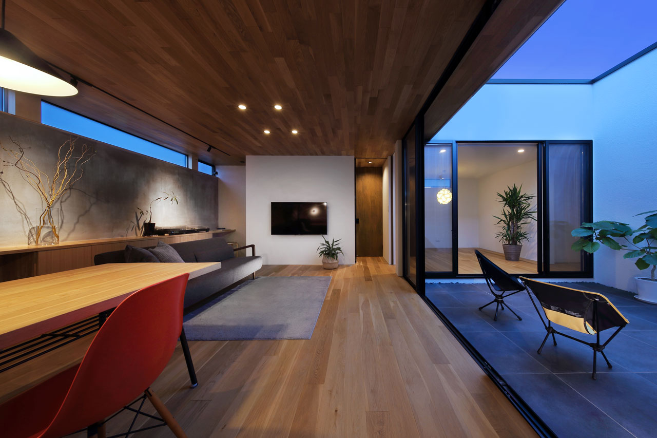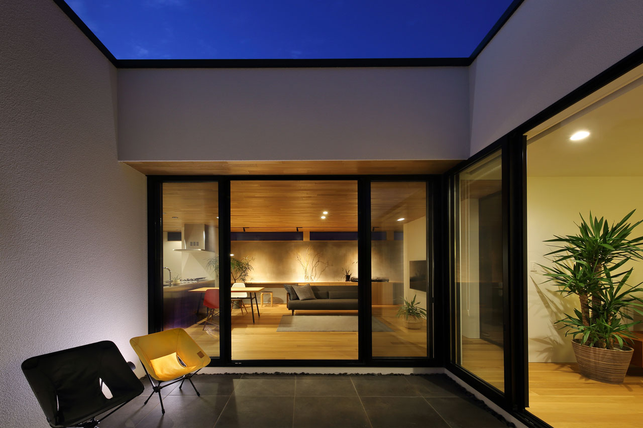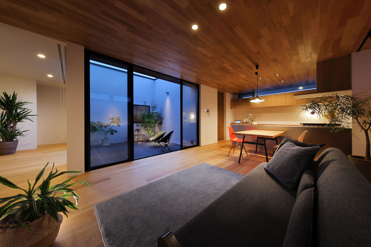 建物内部に設けた二つの中庭は、それぞれ違った形でこの家での暮らしに豊かさを与えます。家の中心の「表の中庭」は内部に採光と通風をもたらすと同時にLDKと隣接させることにより、私的な外部空間として室内との複合利用も出来ます。左官仕上げの中庭部分の外壁は、太陽の光をやさしく反射させ室内に明るさを届けます。この中庭に取り巻くように各居室を配置したことで、気兼ねなく外部空間と繋がることが出来ます。
