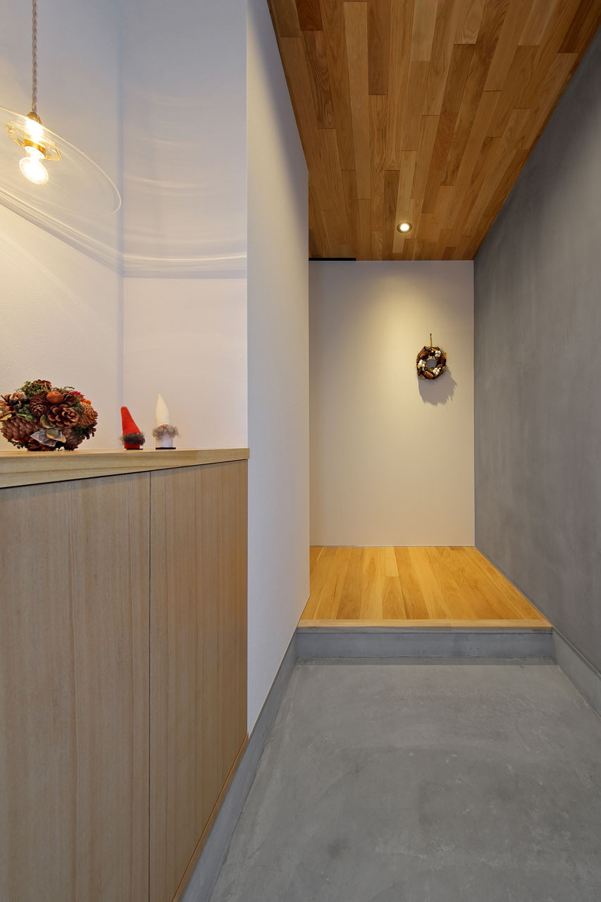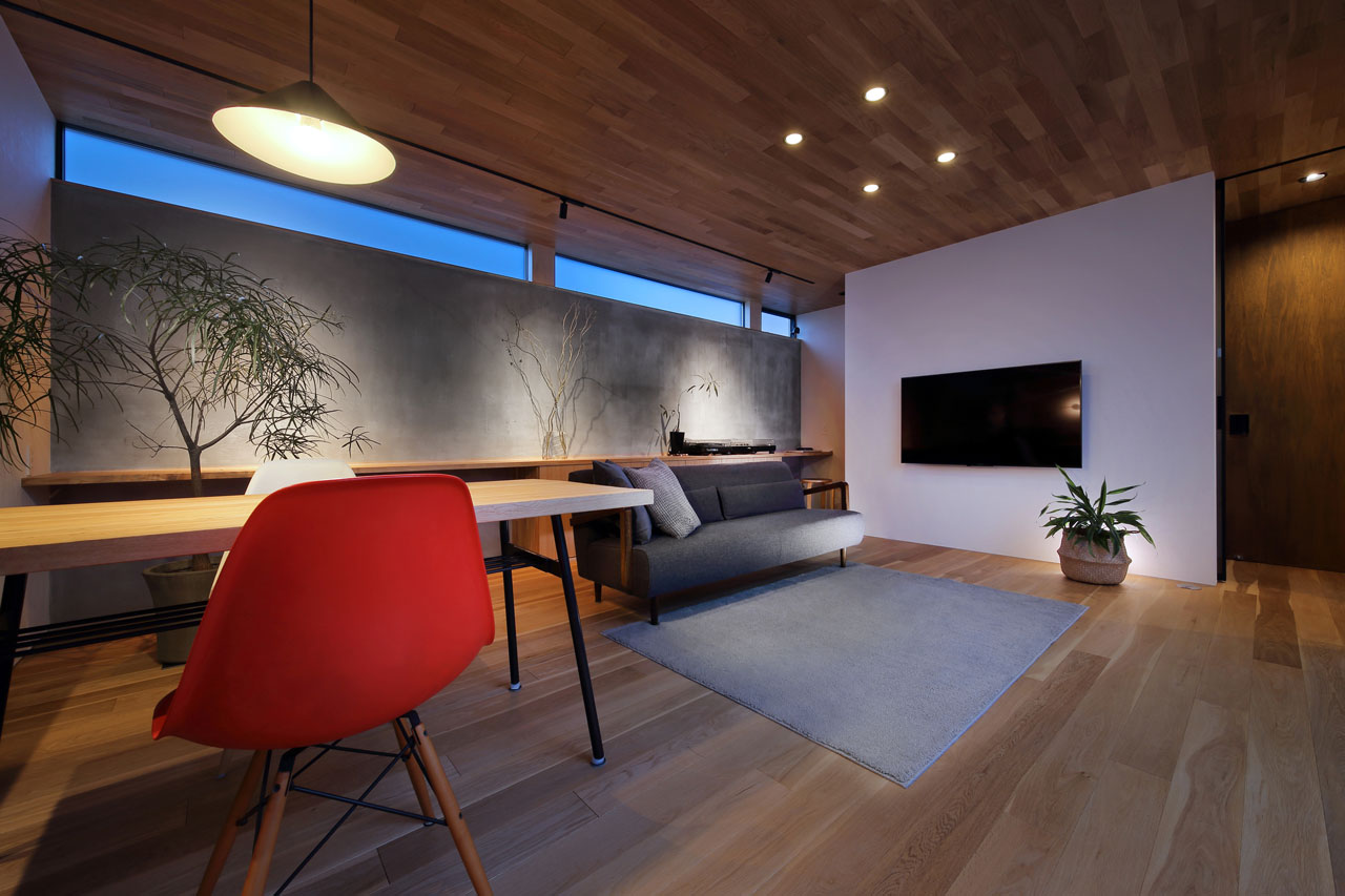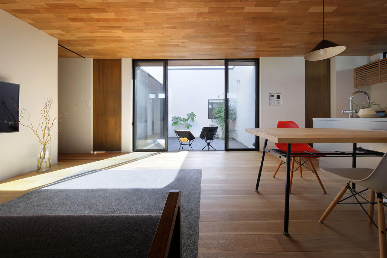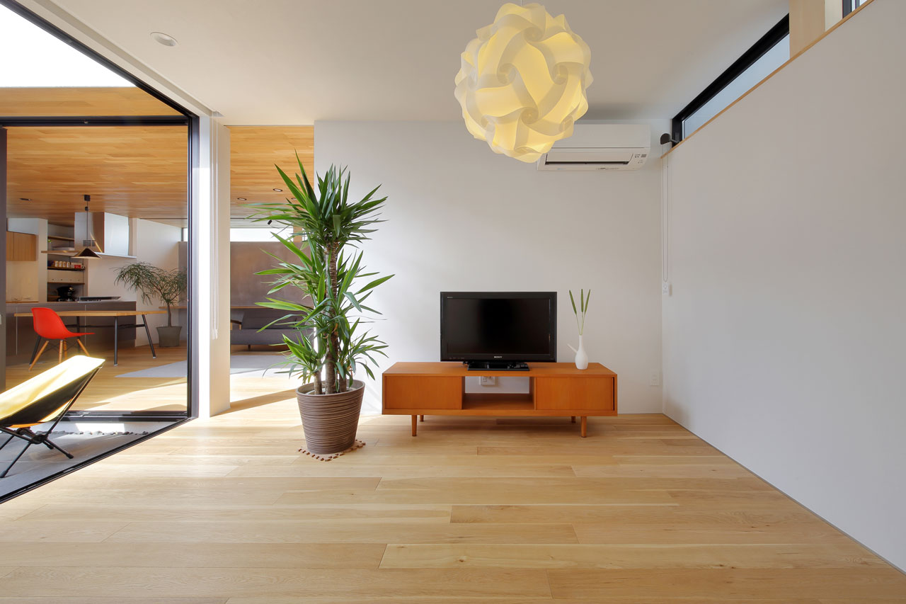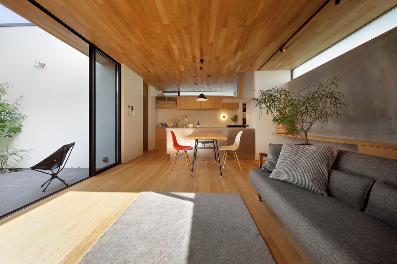 建物内部に設けた二つの中庭は、それぞれ違った形でこの家での暮らしに豊かさを与えます。家の中心の「表の中庭」は内部に採光と通風をもたらすと同時にLDKと隣接させることにより、私的な外部空間として室内との複合利用も出来ます。左官仕上げの中庭部分の外壁は、太陽の光をやさしく反射させ室内に明るさを届けます。この中庭に取り巻くように各居室を配置したことで、気兼ねなく外部空間と繋がることが出来ます。