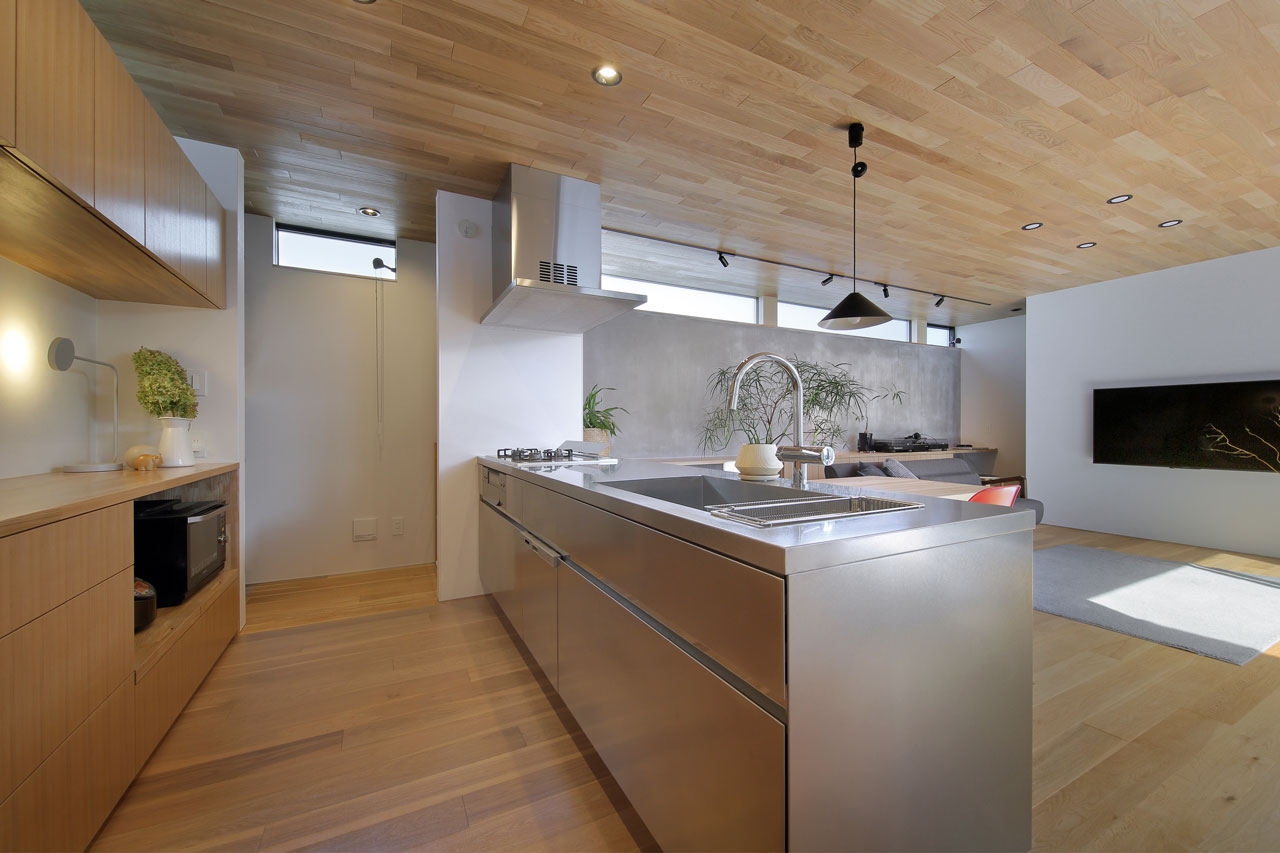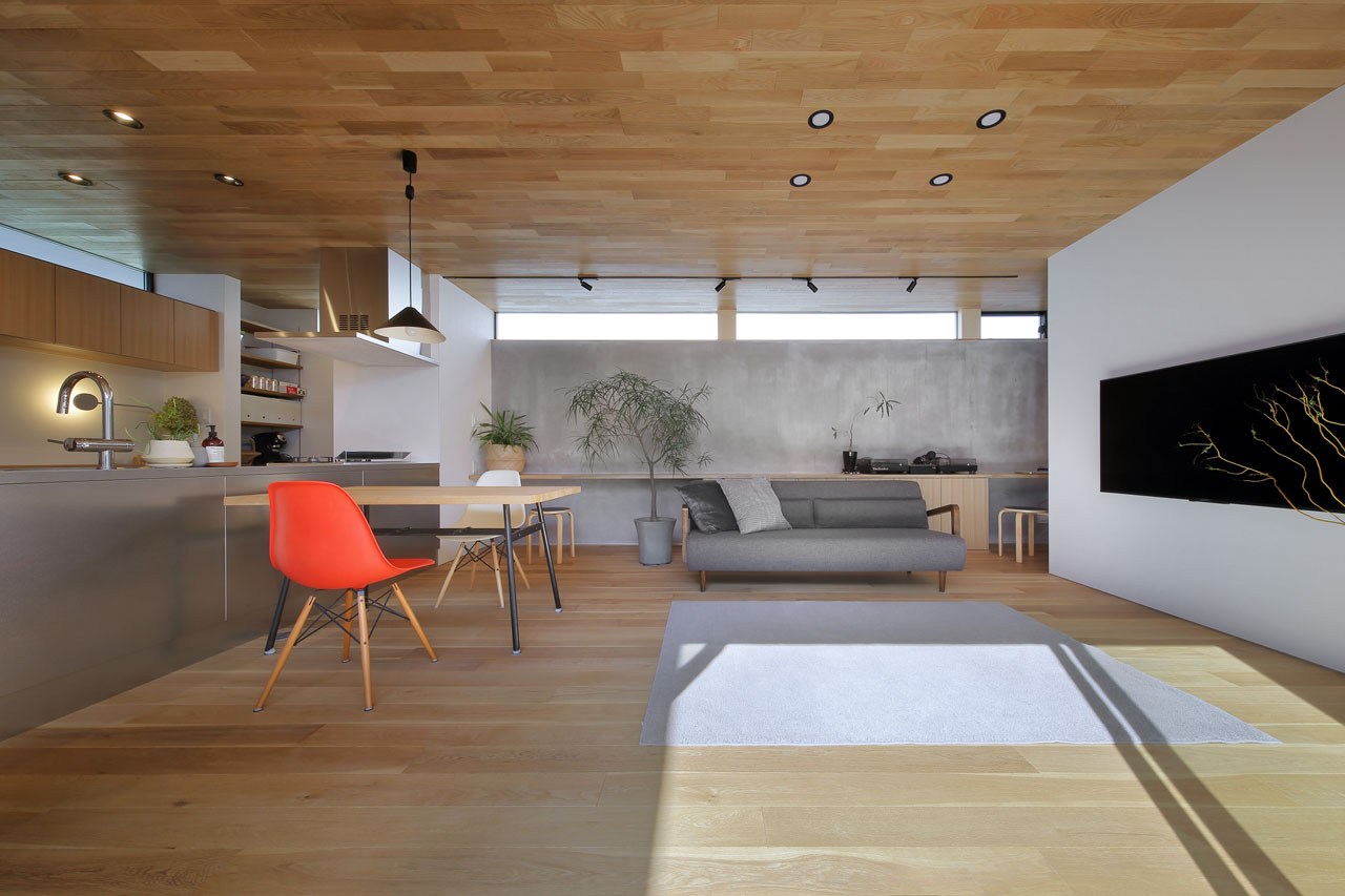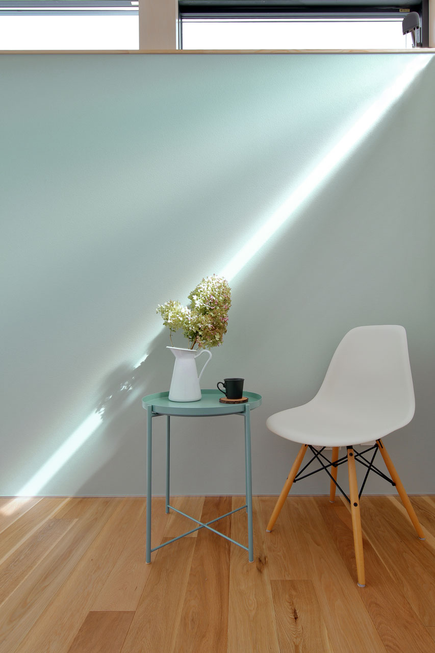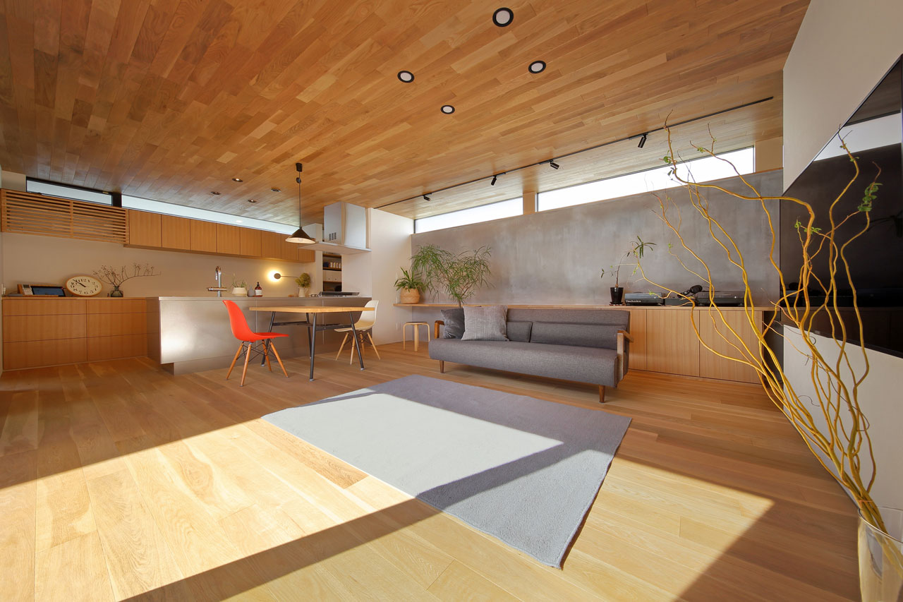 建物内部に設けた二つの中庭は、それぞれ違った形でこの家での暮らしに豊かさを与えます。家の中心の「表の中庭」は内部に採光と通風をもたらすと同時にLDKと隣接させることにより、私的な外部空間として室内との複合利用も出来ます。左官仕上げの中庭部分の外壁は、太陽の光をやさしく反射させ室内に明るさを届けます。この中庭に取り巻くように各居室を配置したことで、気兼ねなく外部空間と繋がることが出来ます。