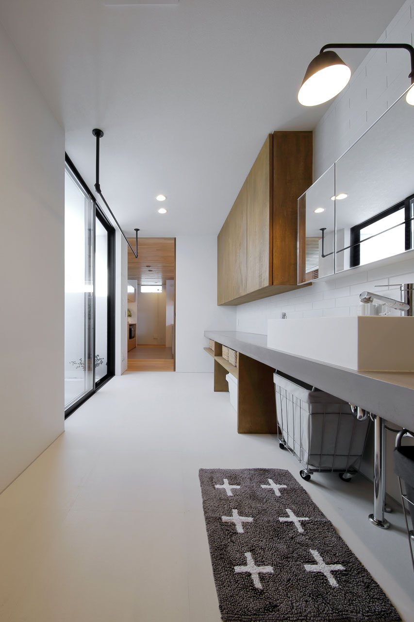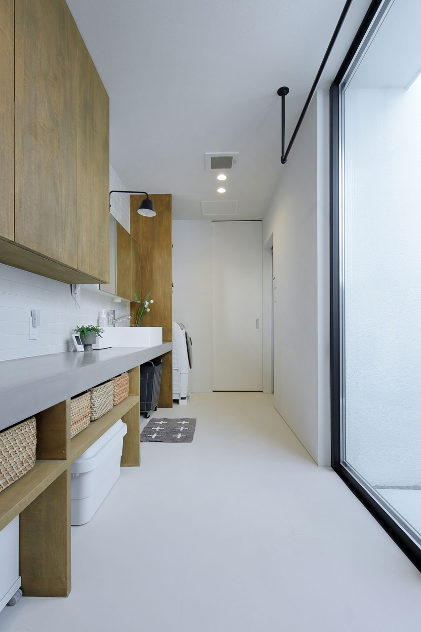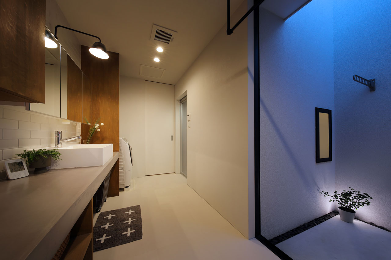 それに対し「裏の中庭」は水回りとの複合利用が出来る空間となっています。物干しテラスや勝手口へ繋がる裏動線の一部として使い勝手の良い外部空間としての役割があります。裏の中庭と水回り・ウォークインクローゼットは隣接させ、家事動線を短く一連の流れで完結できるように考慮しています。