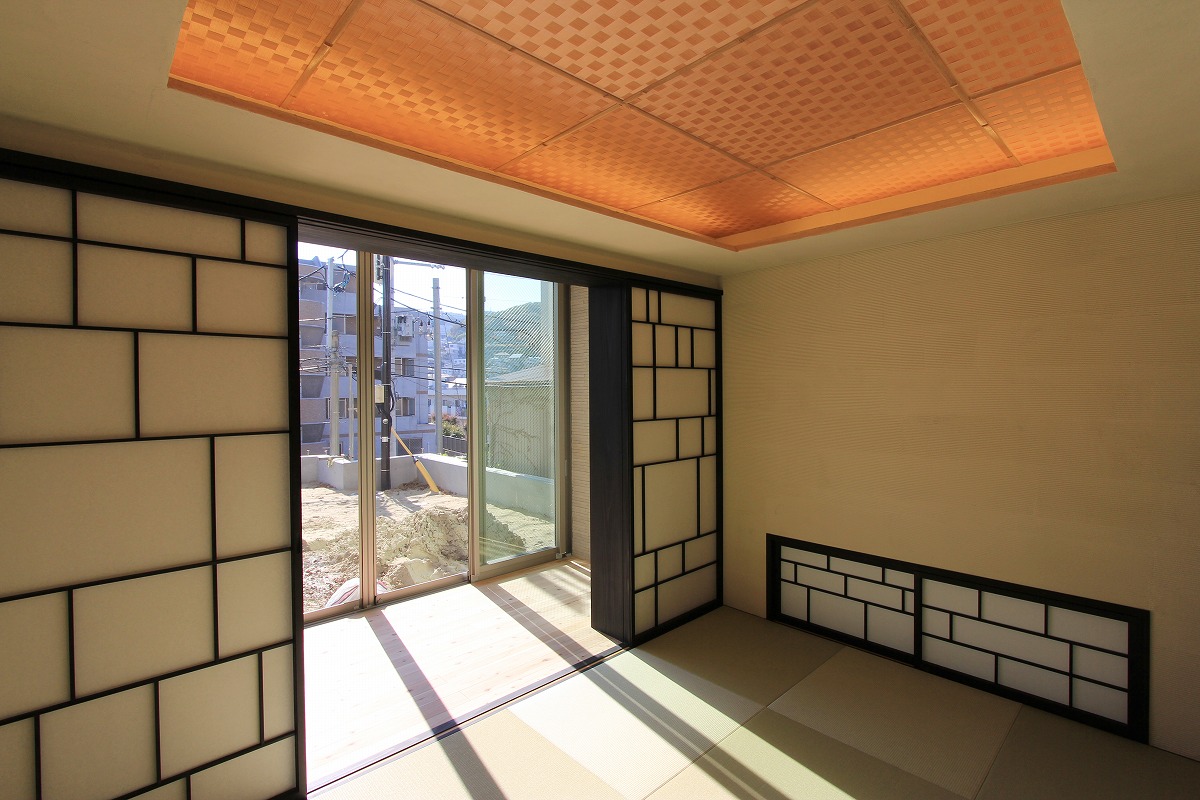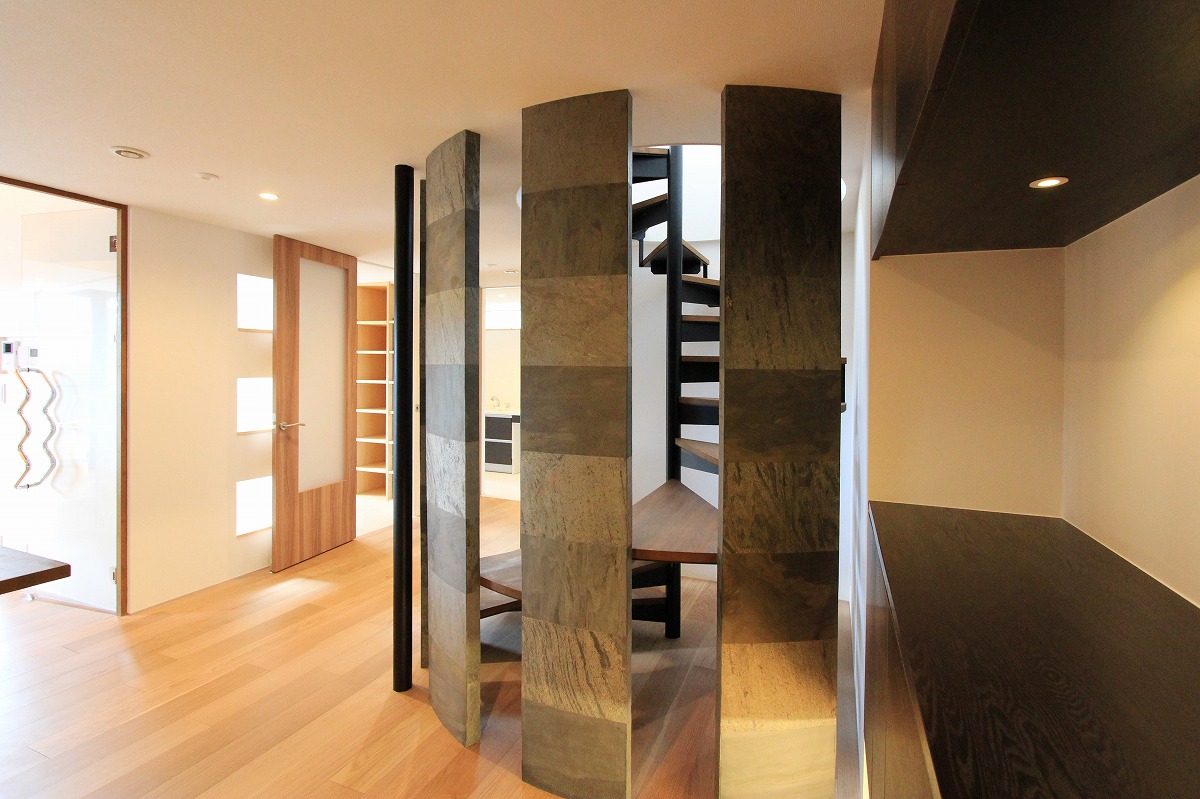 予算や法規に大きく左右される為、基本計画では地階を除く2階建てとして既存地盤面を活かしながら設計した。高低差が6.5mあるので大きく領域が3つに分かれている。領域1では道路からの地下ダレージを計画し、これが擁壁の構造を兼ねている。領域2では既存地盤面に対してリビングを設計し、外部とのつながりを意識した。部屋の真ん中にある暖炉はRC造という蓄熱体を活かすことで相乗効果が見込まれる。領域3では地階にあたる部分にオーディオルームや和室を設計。和室を離れのように設計し、おもてなし空間として演出している。オーディオルームについては地下にあることで防音効果も高めている。地上1階については普段使いのガレージ・玄関を設計している。車の乗り入れを考えて、転回スペースを北東側に計画している。玄関の正面のらせん階段上にあるトップライトから光が差し込むことで北側に配置しているエントランスに清潔感と印象的なオブジェとしての効果をもたらしている。家事動線はこの階に集約しており、浴室からも眺望を楽しめるようにした。地上2階についてはプライベートな空間を配置し、眺望のよい南側に寝室などを計画した。隠れ部屋になる最上階には旦那さんの書斎を設け、専用テラスに出ることで広瀬川に向かう専用のスカイデッキにしている。