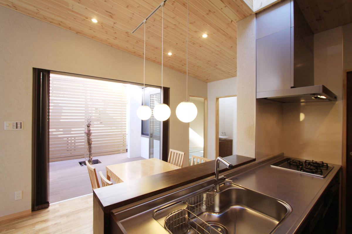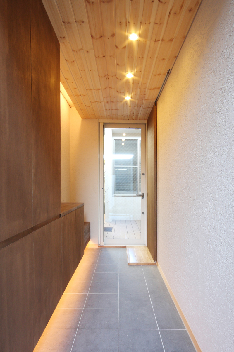 人や車の往来が多いメイン通りからの視線や騒音を遮るように設けた塀を抜けると、通り土間の玄関へとつながる。玄関は狭いながらも上下に接照明を配置し空間を広く見せる工夫をしている。間口が狭く、外部と閉鎖的なアプローチとは対照的に通り土間からコートテラス、さらには裏手の歩道へと、敷地内部は外部環境も含めたプランで広がりを持たせてる。