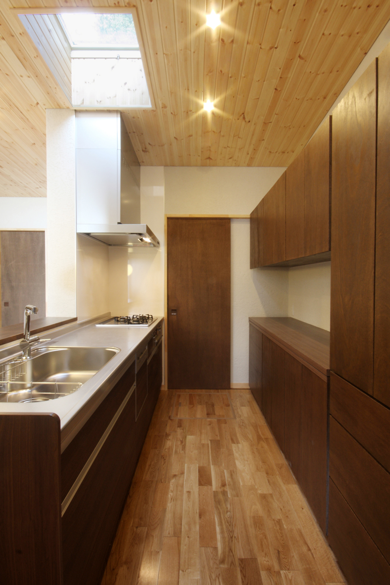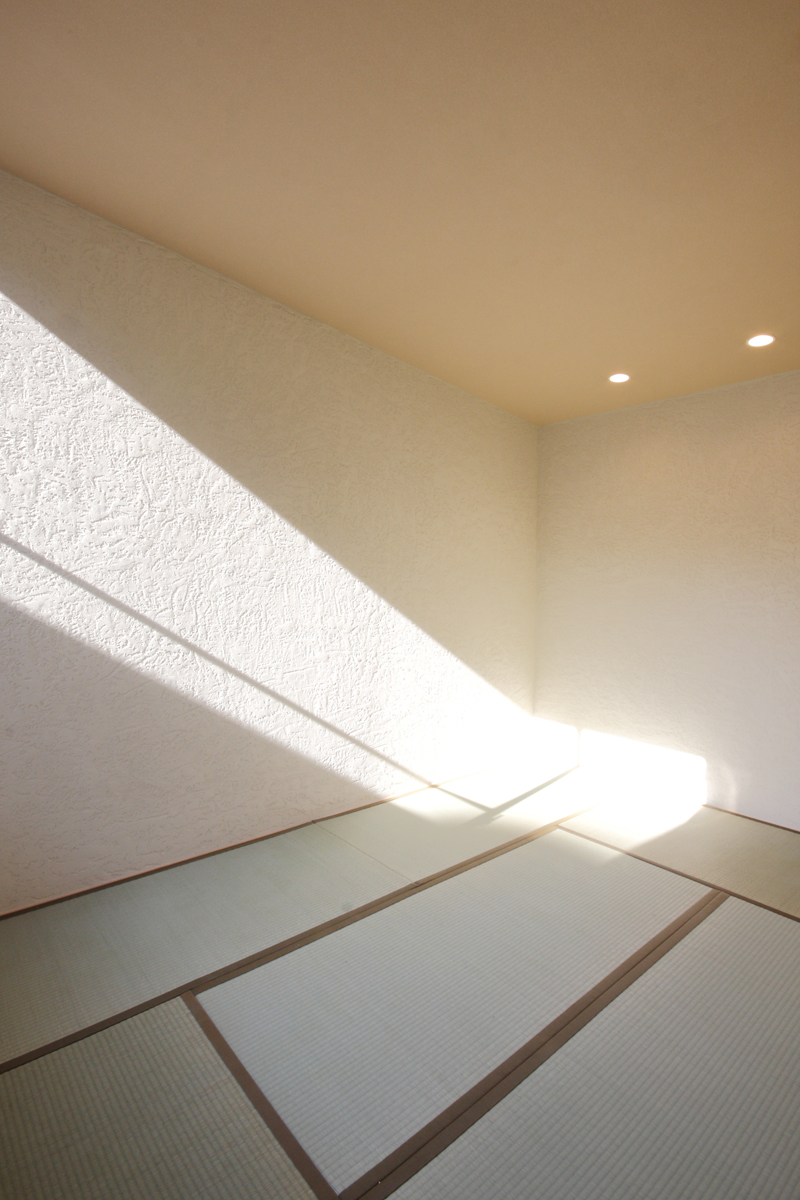 住宅内部もコートテラスを中心としてダイニング・キッチン・リビング・和室が一体として機能している。リビングの一角に設けられた書斎コーナーには、TV台と共用の家具が造り付けられ、必要最小限の収納を確保している。客間としての機能も付加した和室には専用の庭園、縁側が配置され、特別な空間を演出している。さらに上部には、施主の大量の本などがしまえるロフトも完備している。ルーバーにより外部から遮断されたコートテラスによって採光・通風を確保した寝室は、落ち着きのある空間としている。