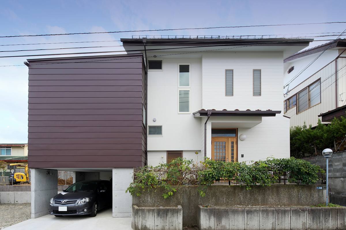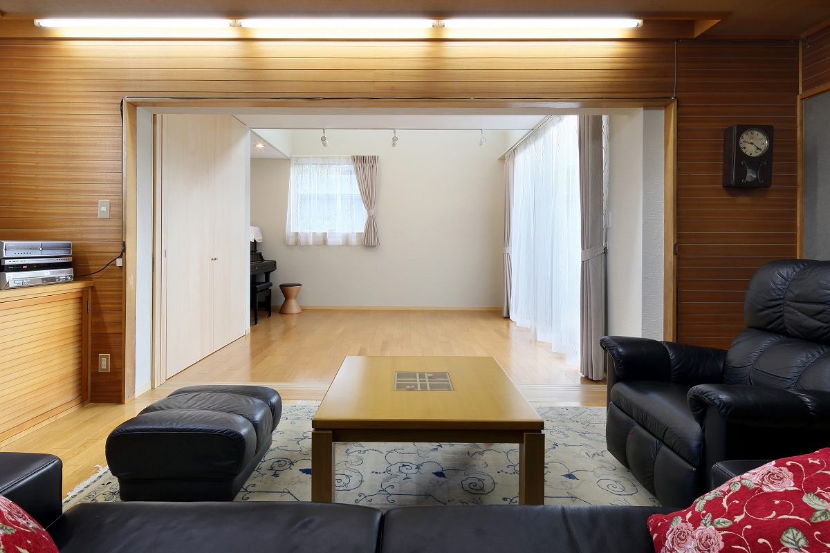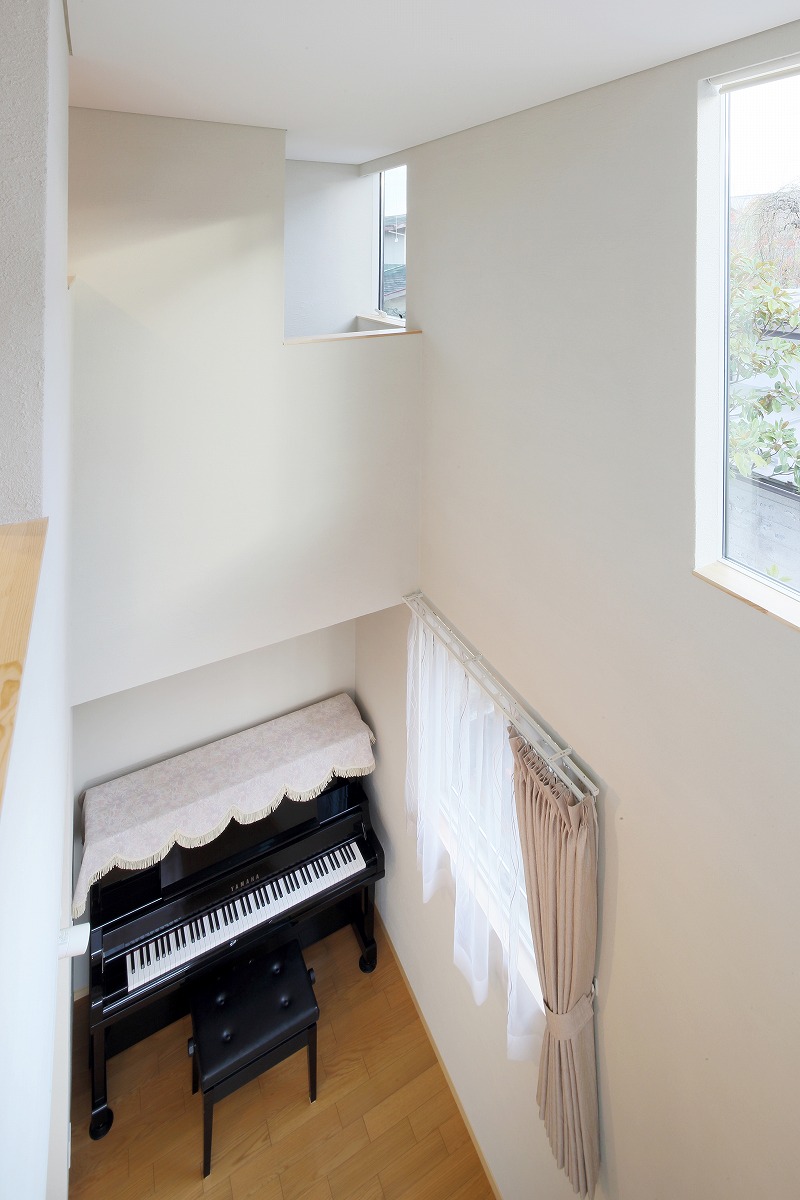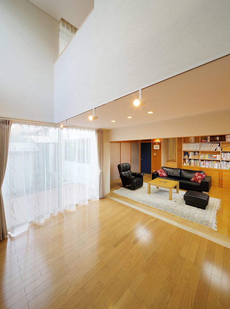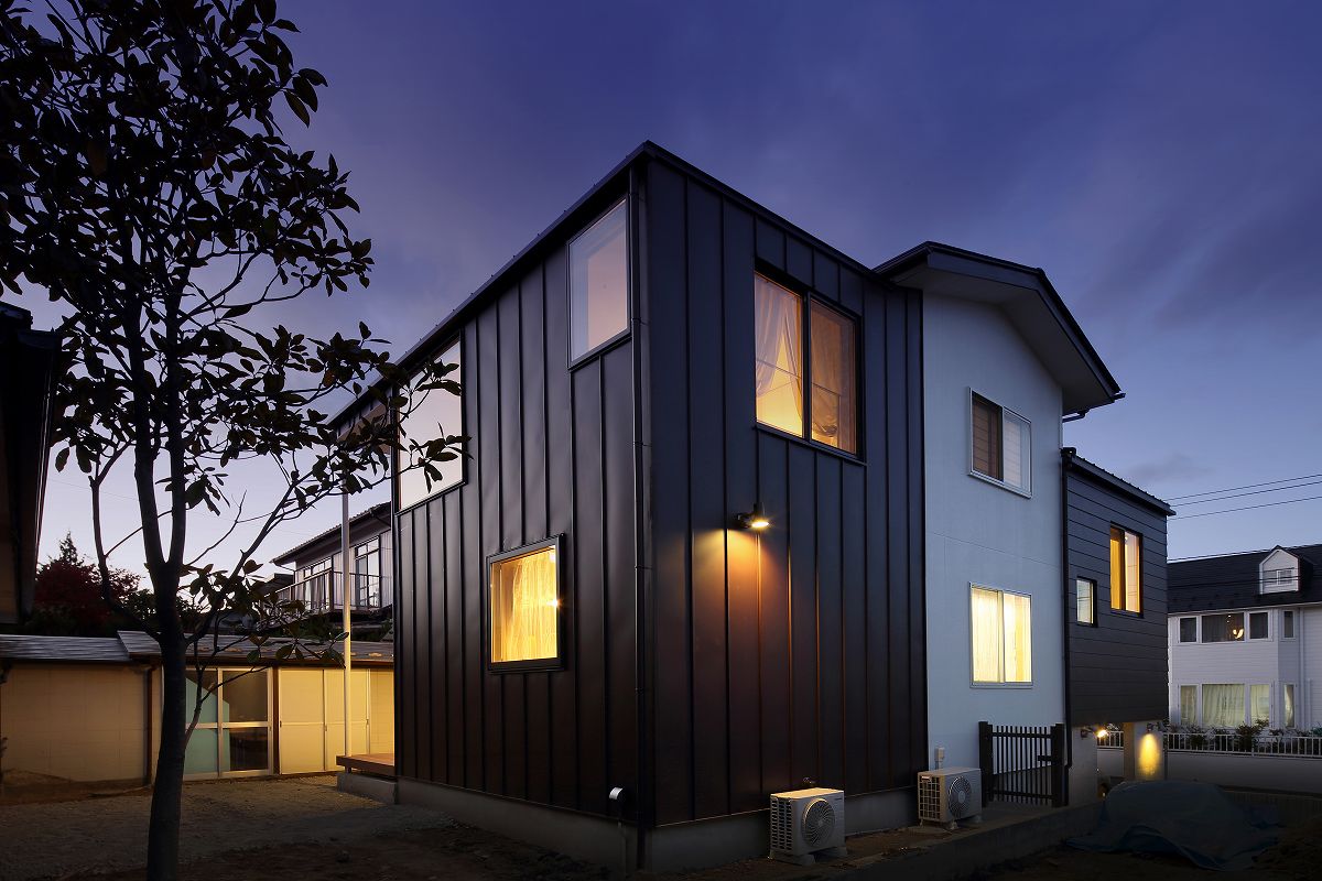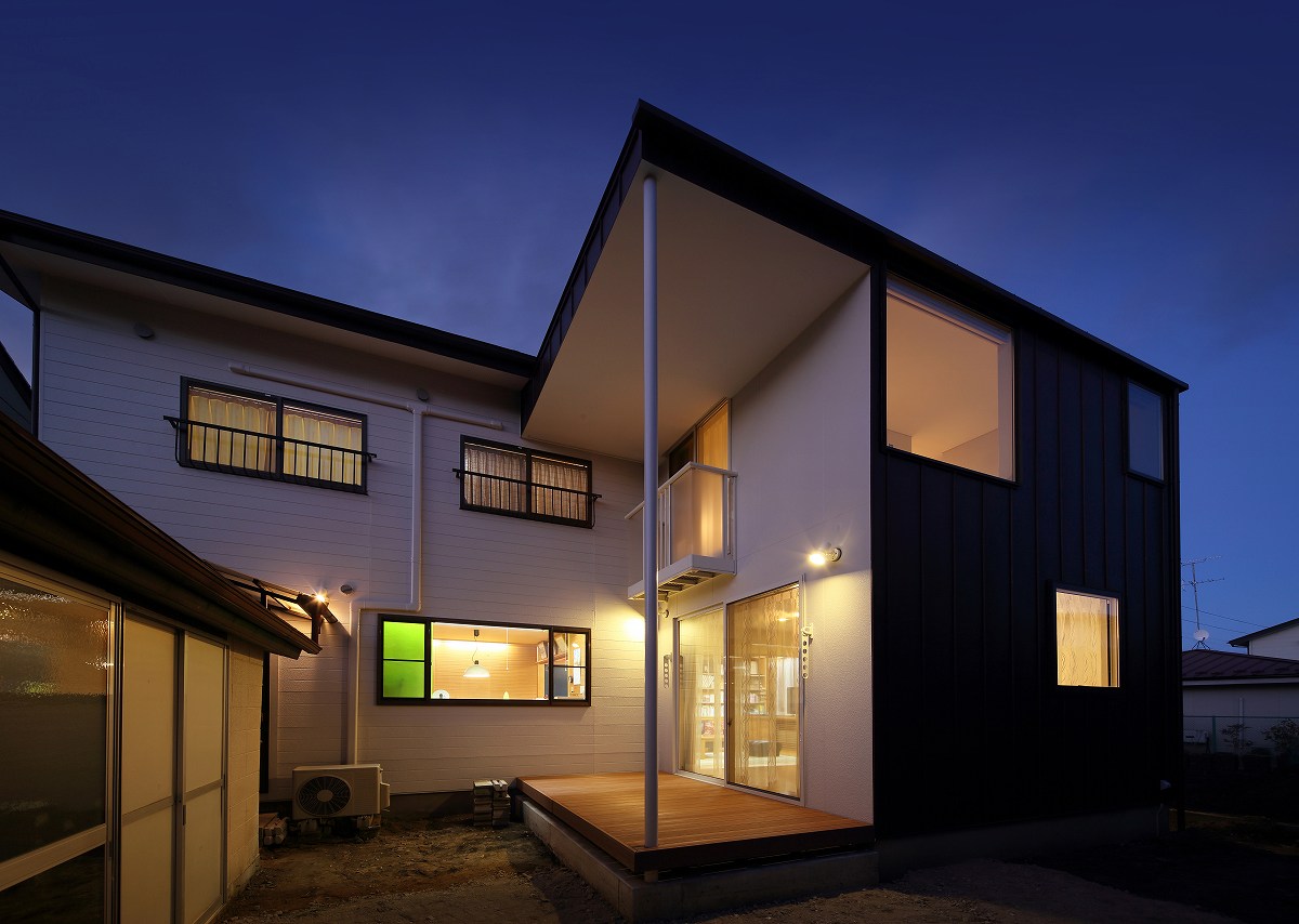 住宅街の中にある、築24年の住宅の増築工事を行なった。増築のイメージは「House+ハコ」。既存建物の南北にハコが1個ずつ付くように増築を行なった。北側はハコを浮かせ、下をガレージスペースとして利用。ハコ内はご主人のベットルーム兼書斎となっている。南側のハコは、1階をリビングから繋がるように配置し、通常はワンルームのように広々と使い、仕切りを閉めると、奥様のピアノホール、客間として利用できる。2階には天候に左右されずに洗濯物を干すことも出来る、風通しの良いインナーテラスを配置した。