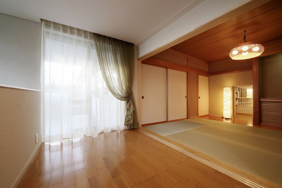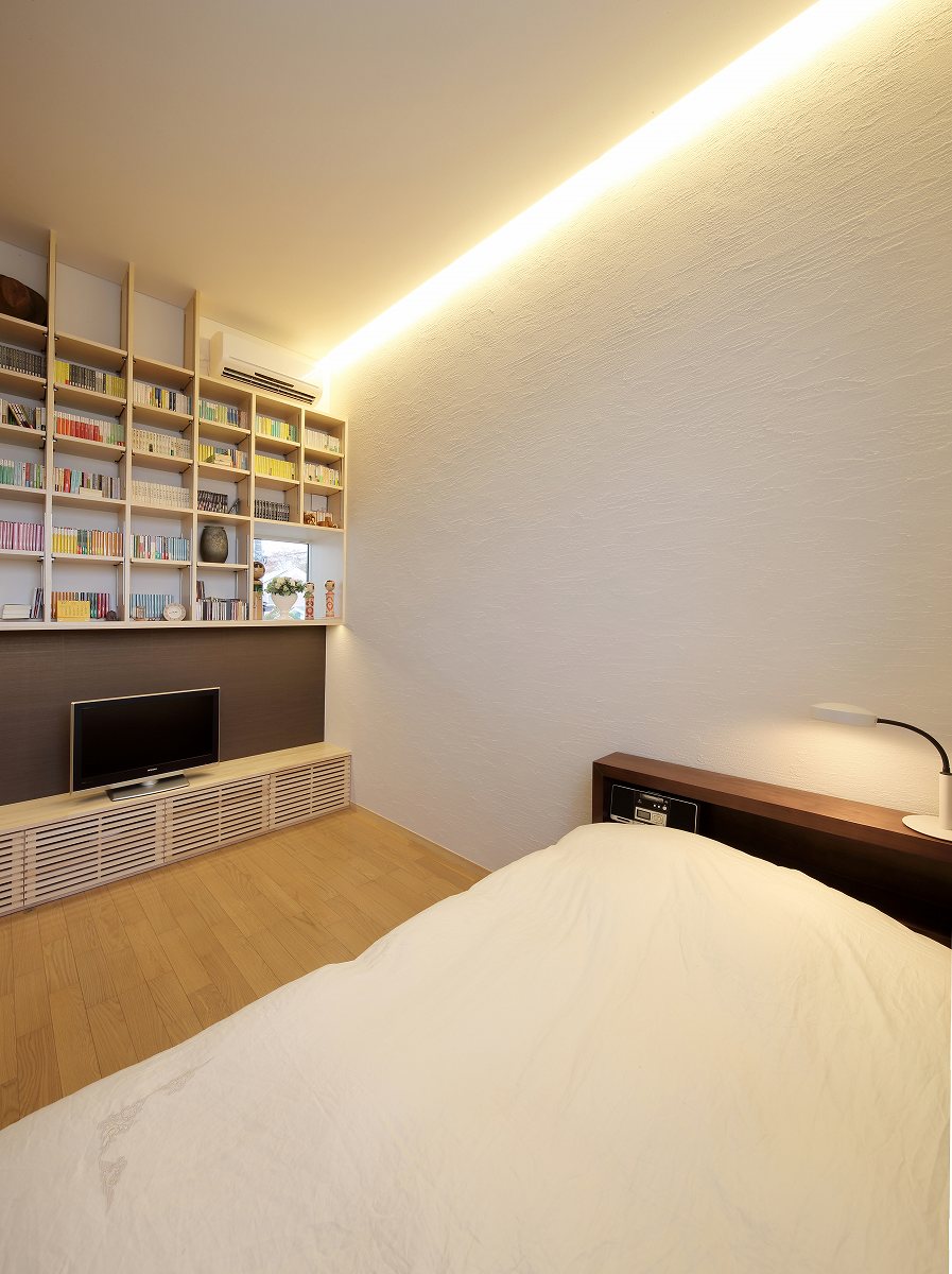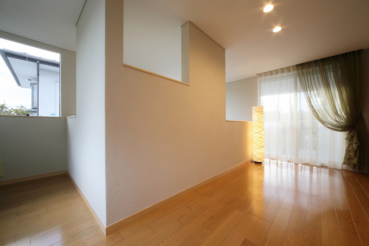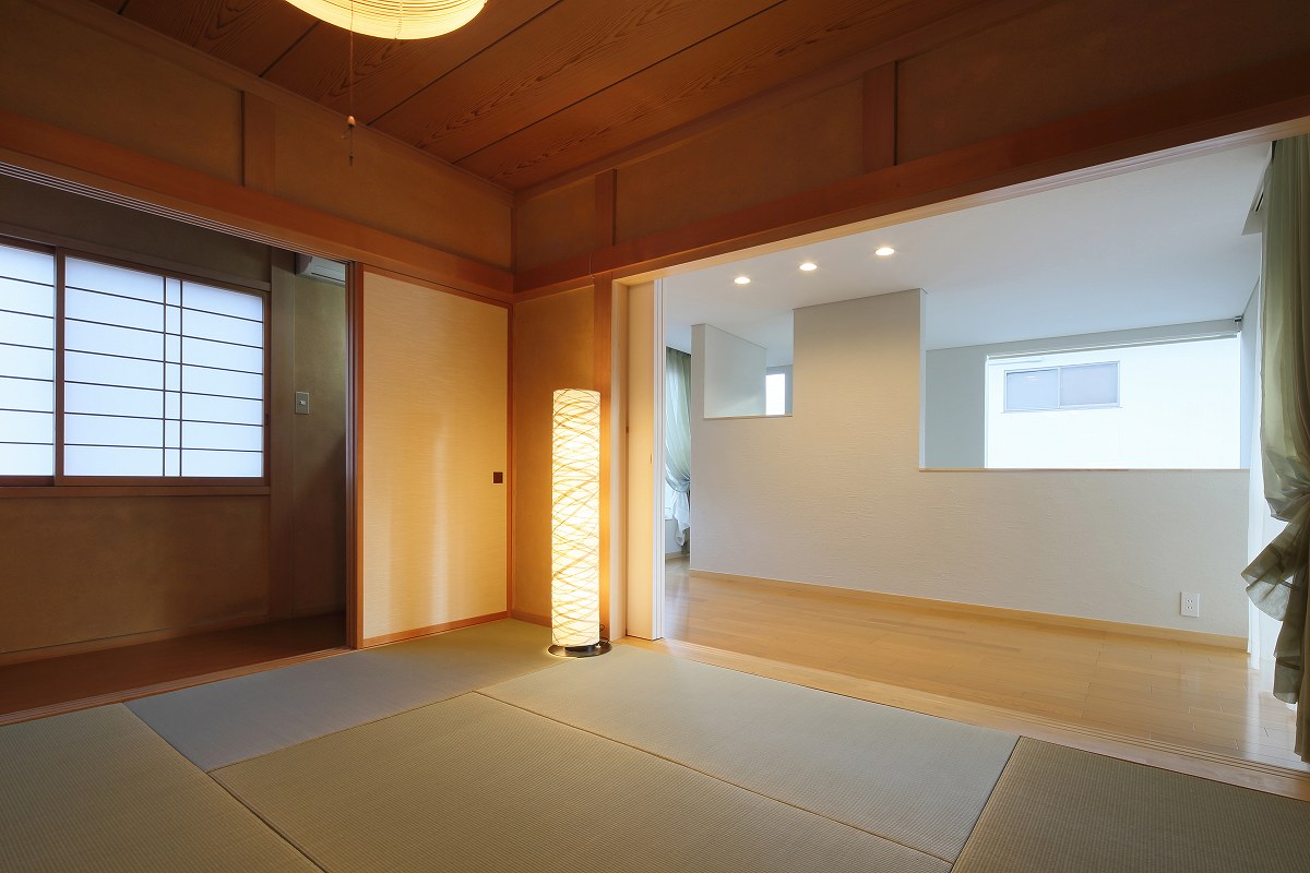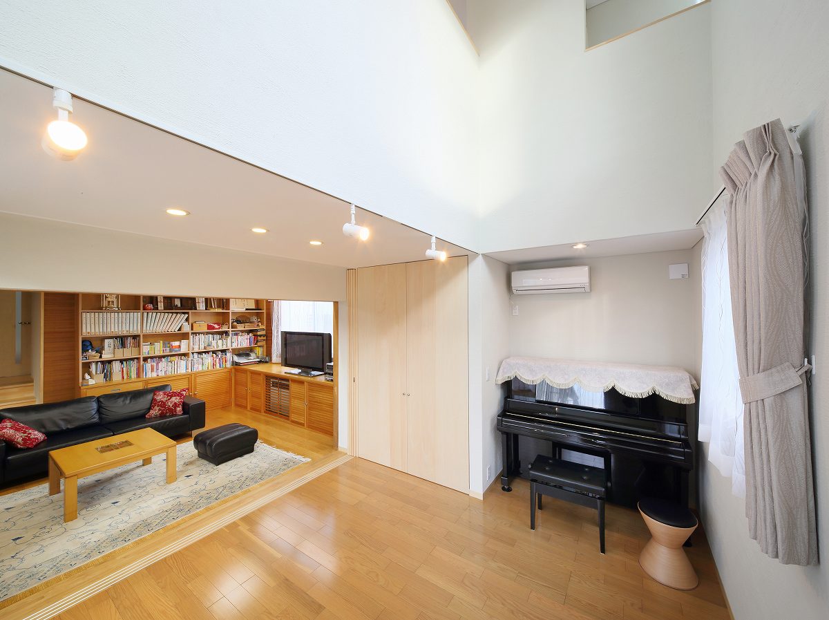 住宅街の中にある、築24年の住宅の増築工事を行なった。増築のイメージは「House+ハコ」。既存建物の南北にハコが1個ずつ付くように増築を行なった。北側はハコを浮かせ、下をガレージスペースとして利用。ハコ内はご主人のベットルーム兼書斎となっている。南側のハコは、1階をリビングから繋がるように配置し、通常はワンルームのように広々と使い、仕切りを閉めると、奥様のピアノホール、客間として利用できる。2階には天候に左右されずに洗濯物を干すことも出来る、風通しの良いインナーテラスを配置した。
