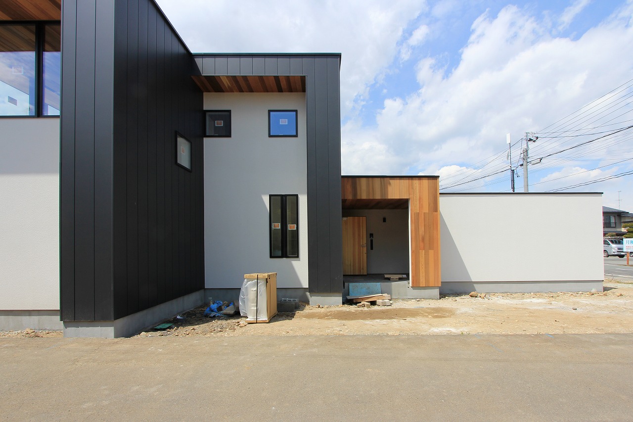 敷地東側を母屋の車動線とし、母屋との行き来も考慮して窓の配置を行いました。道路柄には地下水を利用した融雪パイプ完備のアプローチの延長に2台分のガレージを計画し、そこから室内に直接行くことができます。主に来客用の玄関からも裏動線に行くことができ、そこからパントリー、洗面につながります。