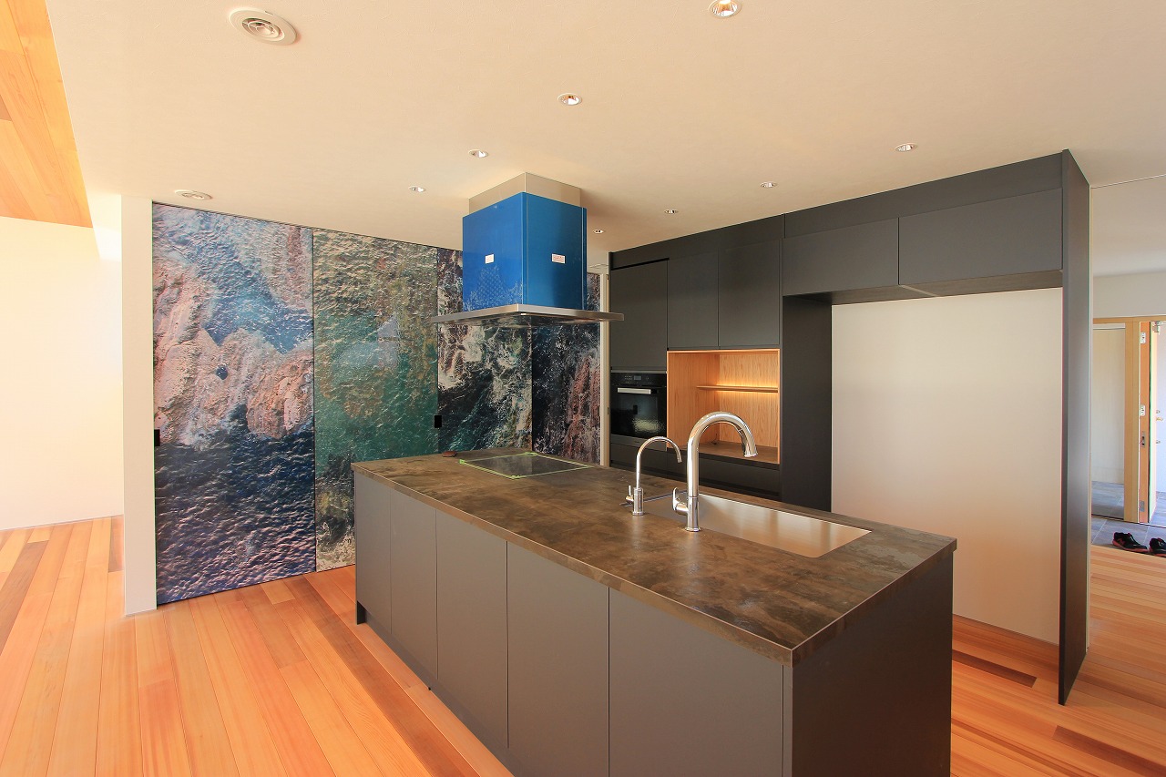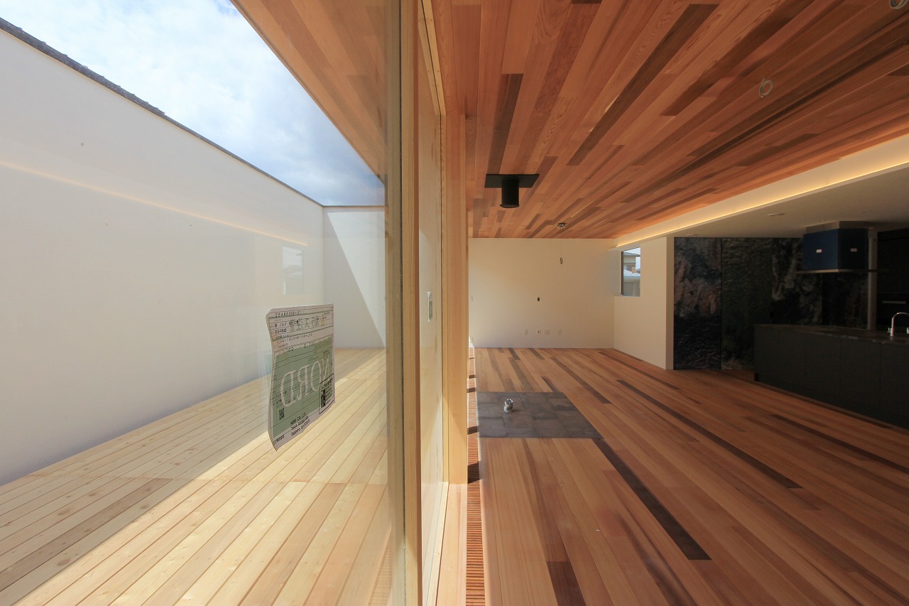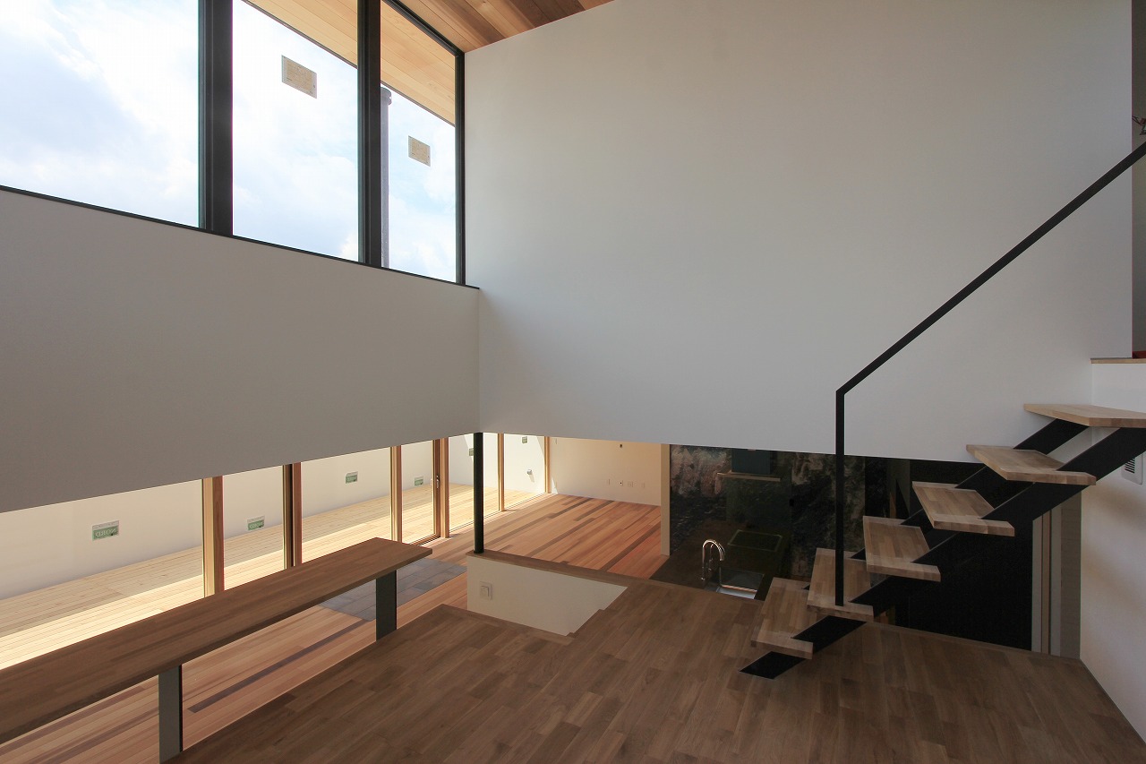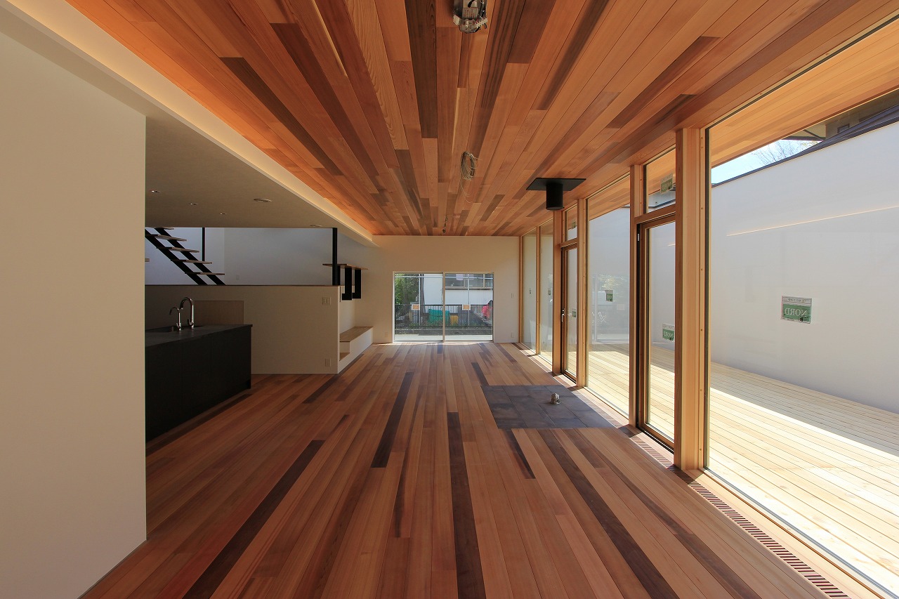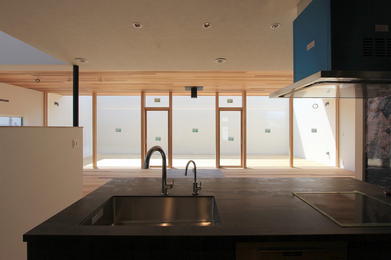 LDKの中心にはアイランドキッチンを備え、ダイニング・リビング・セカンドリビングなど見渡すことができます。ダイニングとリビングの間に暖炉を計画し、緩やかに空間が分けられています。プライベートコートは壁で囲うことによってプライバシーを確保しています。床に設置したアッパー照明は間接照明として空間を演出します。セカンドリビングの下は大容量の収納空間として利用しています。セカンドリビングはプロジェクターを設置して楽しむ空間としています。