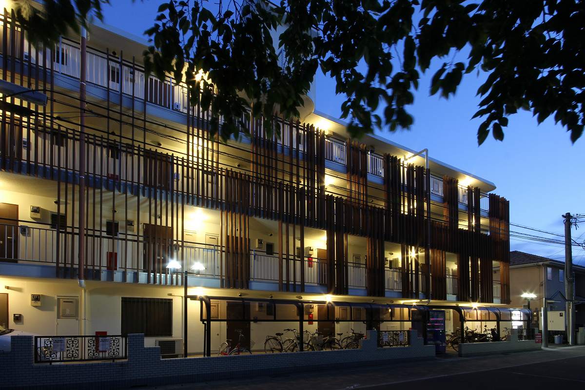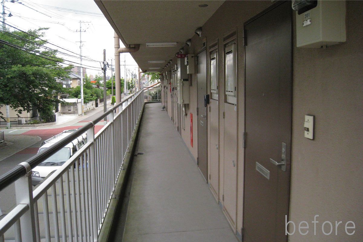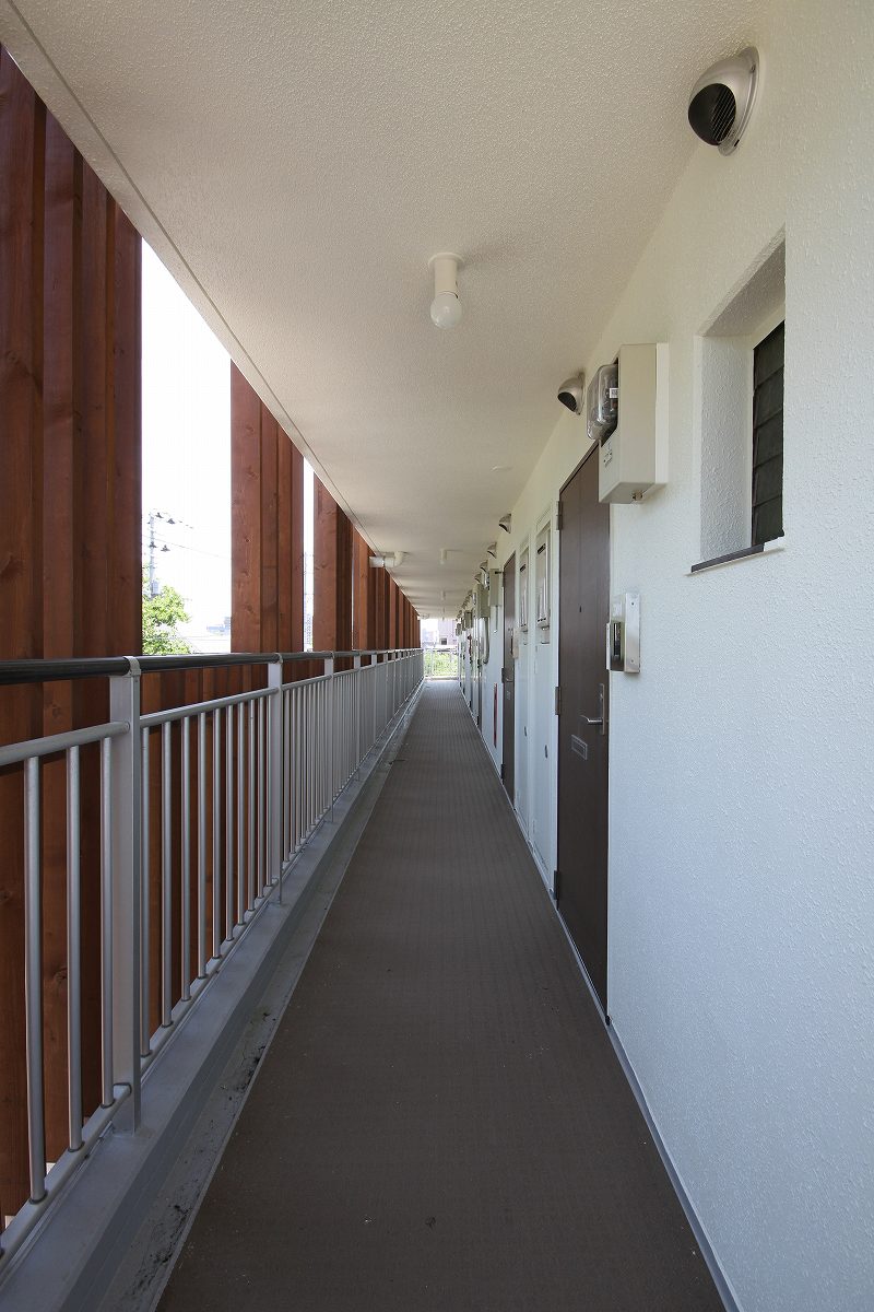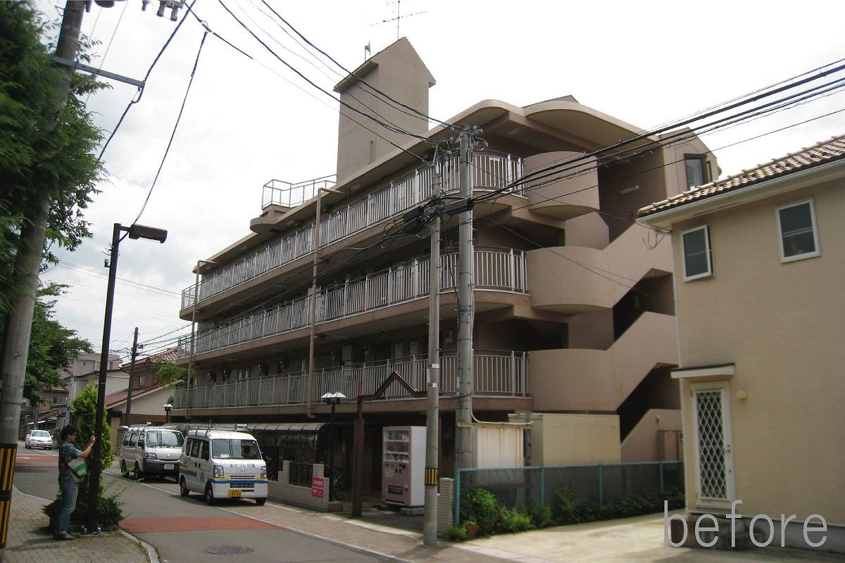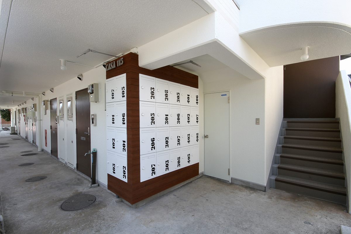 CASA115は、住宅街にある築24年のRC造、4階建の集合住宅である。老朽化によるメンテナンスに加え、外装のリノベーションを行った。建物は、北・東道路と接する角地にあり、さらに道路を挟んで北側の公園に面して空間が開けている為、北側ファードをメインに計画を行った。北側共用廊下に、断面寸法の異なる木材をルーバー状に取付け、見る角度によって奥が見えたり、見えなかったと、さまざまな表情を与えてくれる。単純な木ルーバーではなく、寸法や間隔を操作する手法で、単調なリノベーションに面白さと不思議さを付け加えることが出来た。