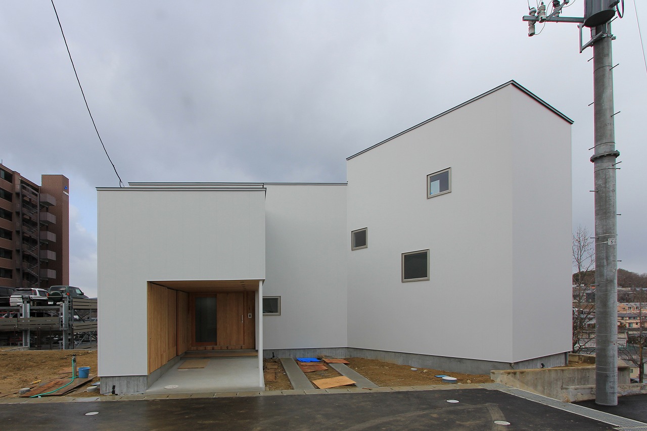 街区の北側に位置している「Curve」。文字通り敷地形状に合わせてカーブしています。魅力は北側の借景です。晴れた日には泉ヶ岳を望むことができます。平面的にカーブしつつ南採光を得るためにスキップフロアを採用しました。北側に向かって段々と高さが大きくなります。平面的なカーブと高さ方向の凹凸によって特徴のある外観となり、安定した採光と眺望を同時に得ることができました。